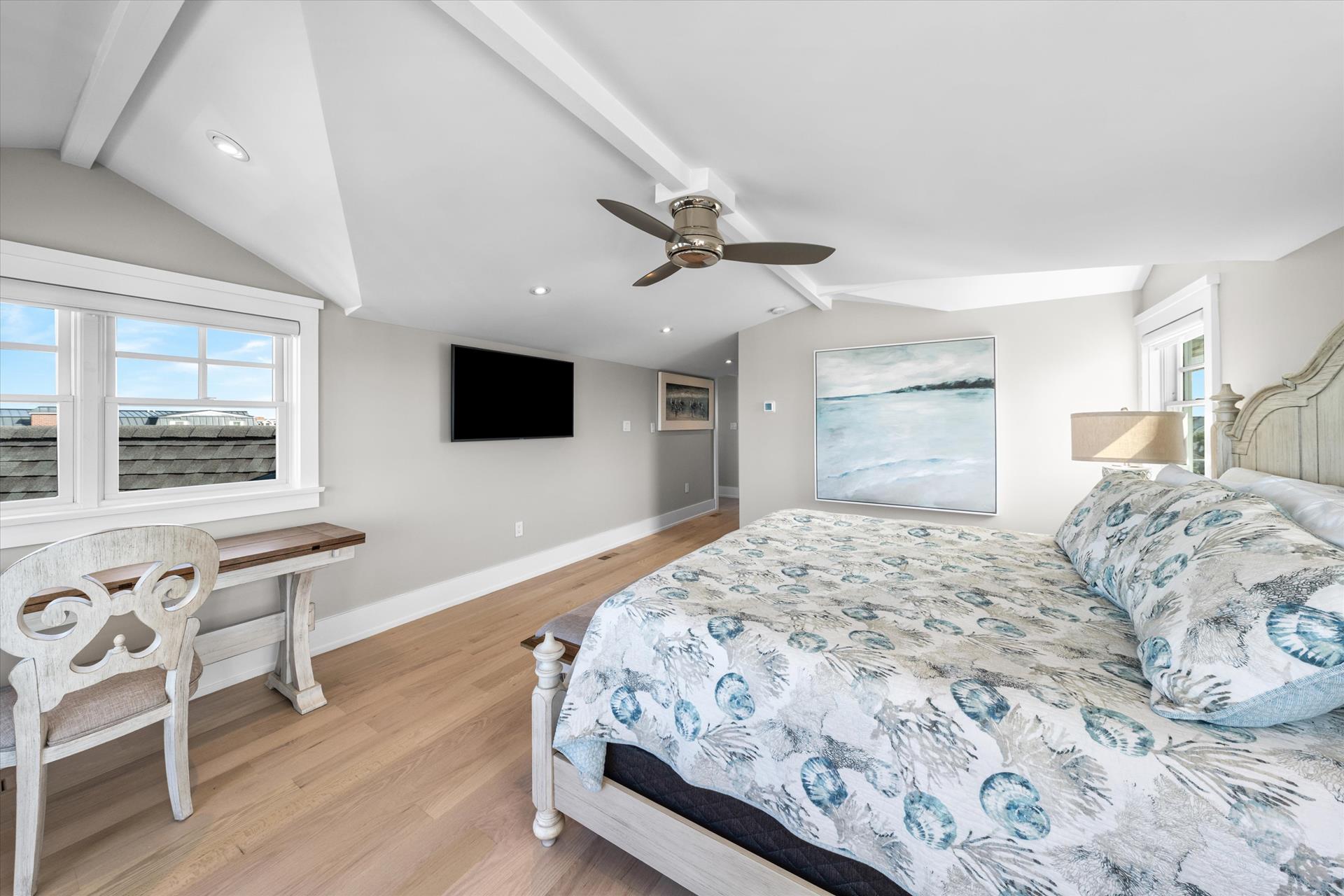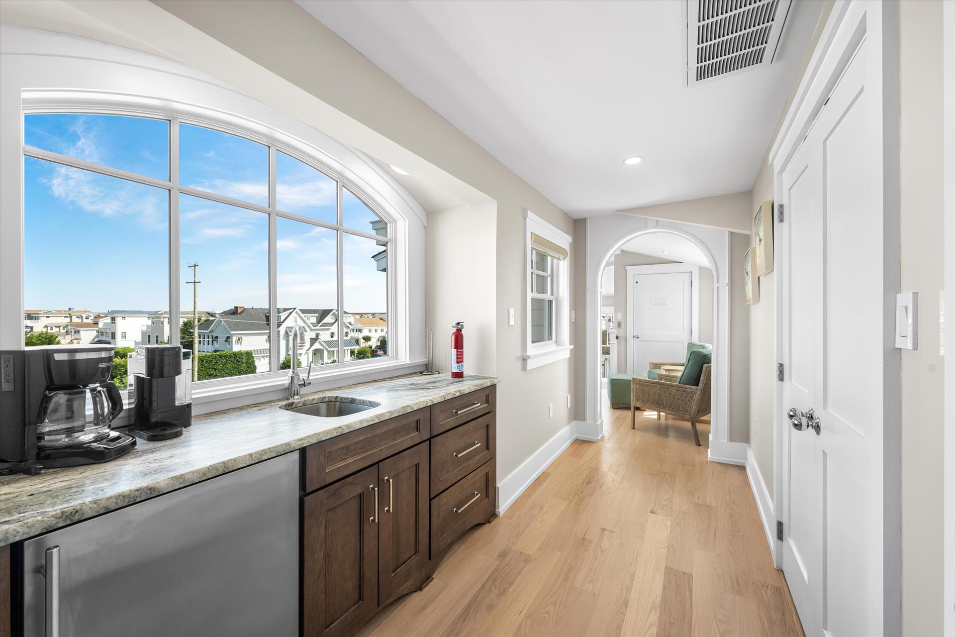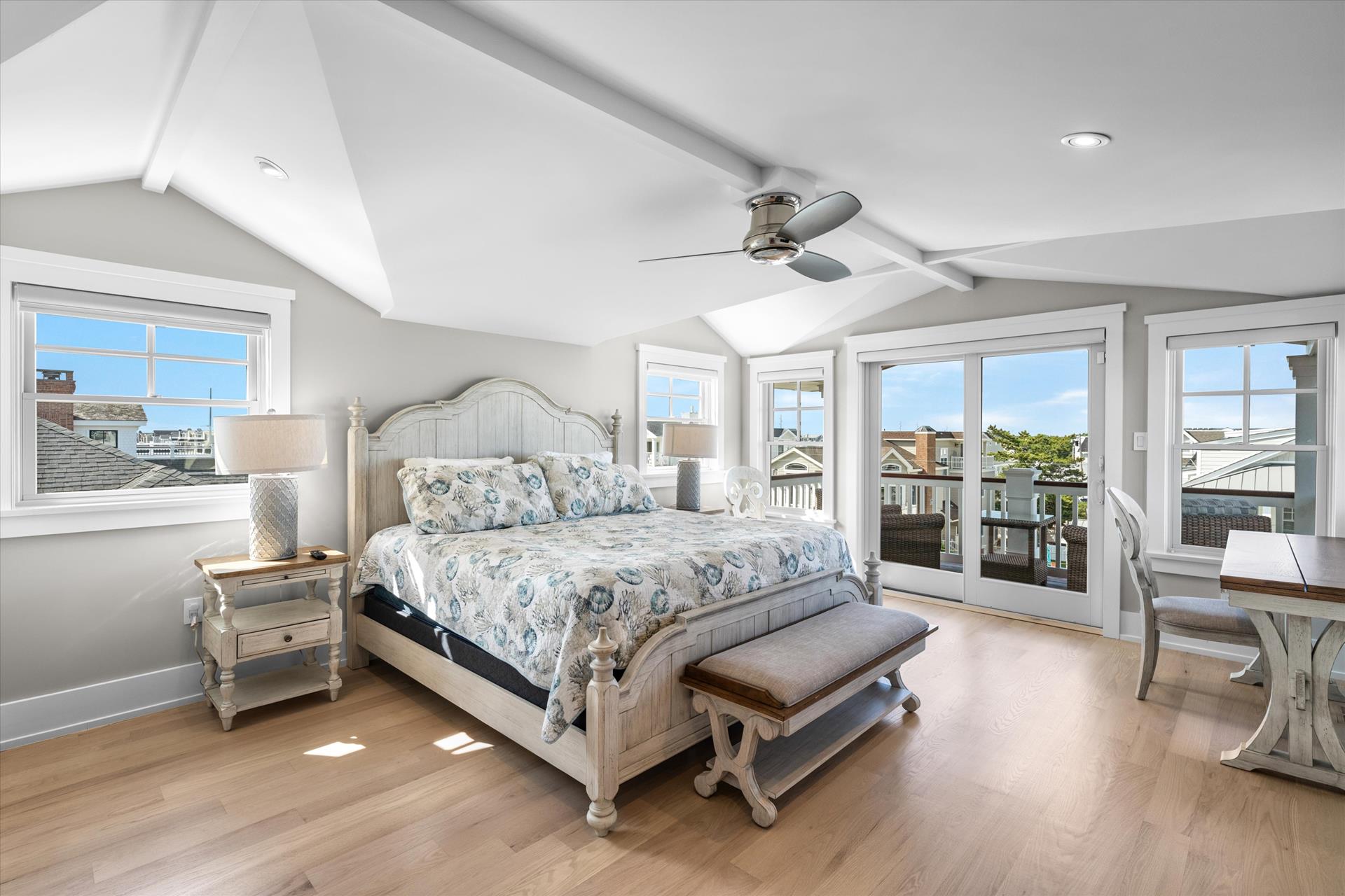 OCEAN VIEWS from this South-end Avalon custom single-family home located on the corner of 76th and Dune Drive, just 8 homes removed from the beach path. This retreat features 5 bedrooms, 5 full bathrooms, and 2 powder rooms. Exceptional location located just one block from a large south-end beach, and walking distance to dining and nightlife. The first floor features a pool-side family room with a wet bar, beverage center, and sink as well as a queen-sized pull-out couch for additional space. Hardwood floors, Sonos surround sound, and high end stone and Marble run throughout. Bedrooms 1 and 2 both feature a queen-sized bed with ensuite bath, tiled shower, and single-sink vanity, with slider access to the front porch. Bedroom 3 features a bunk bed set with a full on the bottom and twin top, as well as an ensuite bathroom with single-sink vanity and shower tub. A full-sized laundry room finishes off the first floor with a full-sized stacked washer and dryer. Leading up to the second floor, a 2nd powder room is located at the top of the stairs. Bedroom 4 features a queen-sized bed with an ensuite bathroom, tiled shower, and single-sink vanity, as well as access to the rear deck overlooking the pool area. Moving into the entertainment space, this custom home includes a large kitchen with an incredible appliance package featuring a Sub-Zero refrigerator, Wolf range, and a wall oven and microwave. A large, center island with bar-height seating for 4 overlooks the family room, which is centered on a gas-fed fireplace. Just off the family room lies a fully-stocked wet bar, featuring an icemaker, beverage center, and sink. The dining area, with additional seating for up to 10 is located off the kitchen. Enjoy expansive ocean views from the large, wraparound deck surrounding the second floor. Enjoy outside dining using the large picnic table with seating for up to 8, listening to the sounds of the waves crashing just steps away. The third floor is dedicated strictly to the master bedroom, featuring a comfortable seating area, and the 3rd wet bar including a beverage center with icemaker, sink, Keurig coffee maker, and toaster. The primary bedroom includes a large walk-in closet, an expansive ensuite bathroom with dual-sink vanity, a tiled shower, and soaking tub. Enjoy mesmerizing views of the ocean and bay on the 3rd floor’s private balcony. A 4-stop elevator runs from the ground level to the third floor. The outside area is a retreat in itself, with a large pool and Spa surrounded by seating, a cabana with roll-down shutters, and an outside shower. The garage is equipped with beach gear and bikes. The home’s prime location suits everyone in the family being just steps away from great dining and nightlife from the ICONA Avalon and the Windrift, top-notch recreation facilities including the 80th street playground, pickleball courts, and fields, and just one cross street to the beach. Please note: baby gate rentals and installation for this property are strictly prohibited.