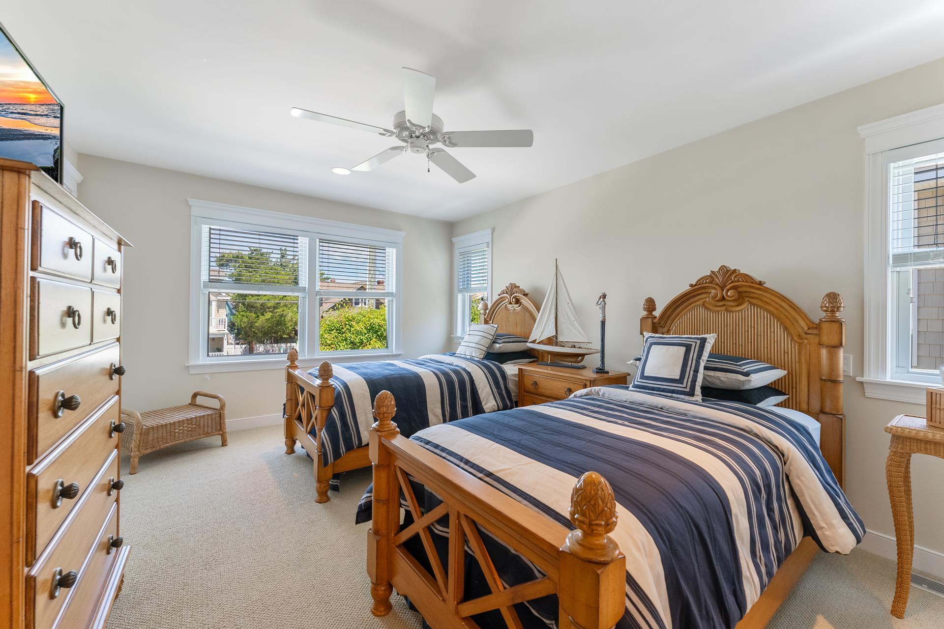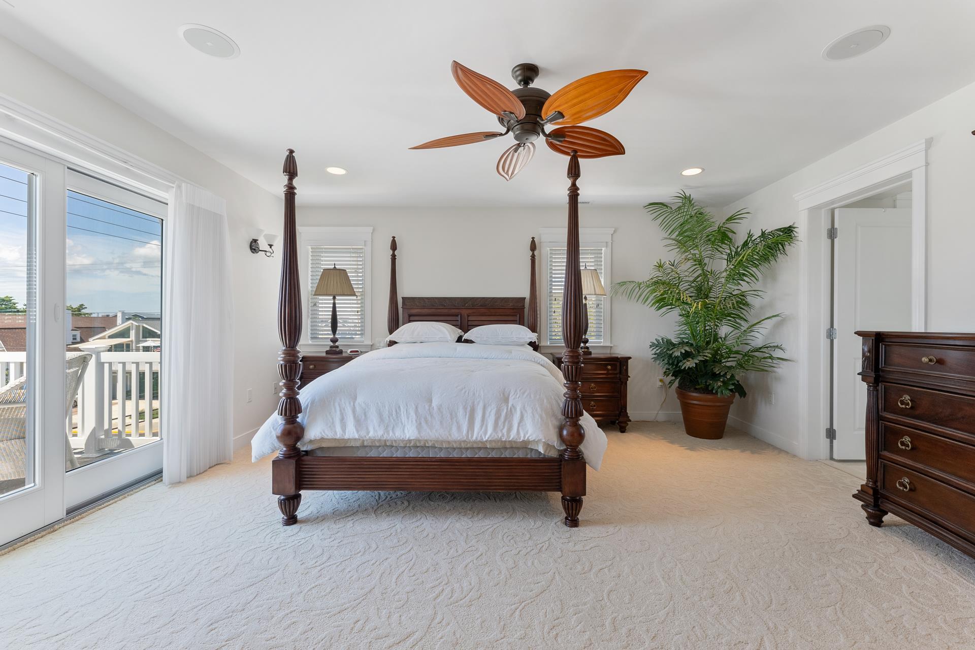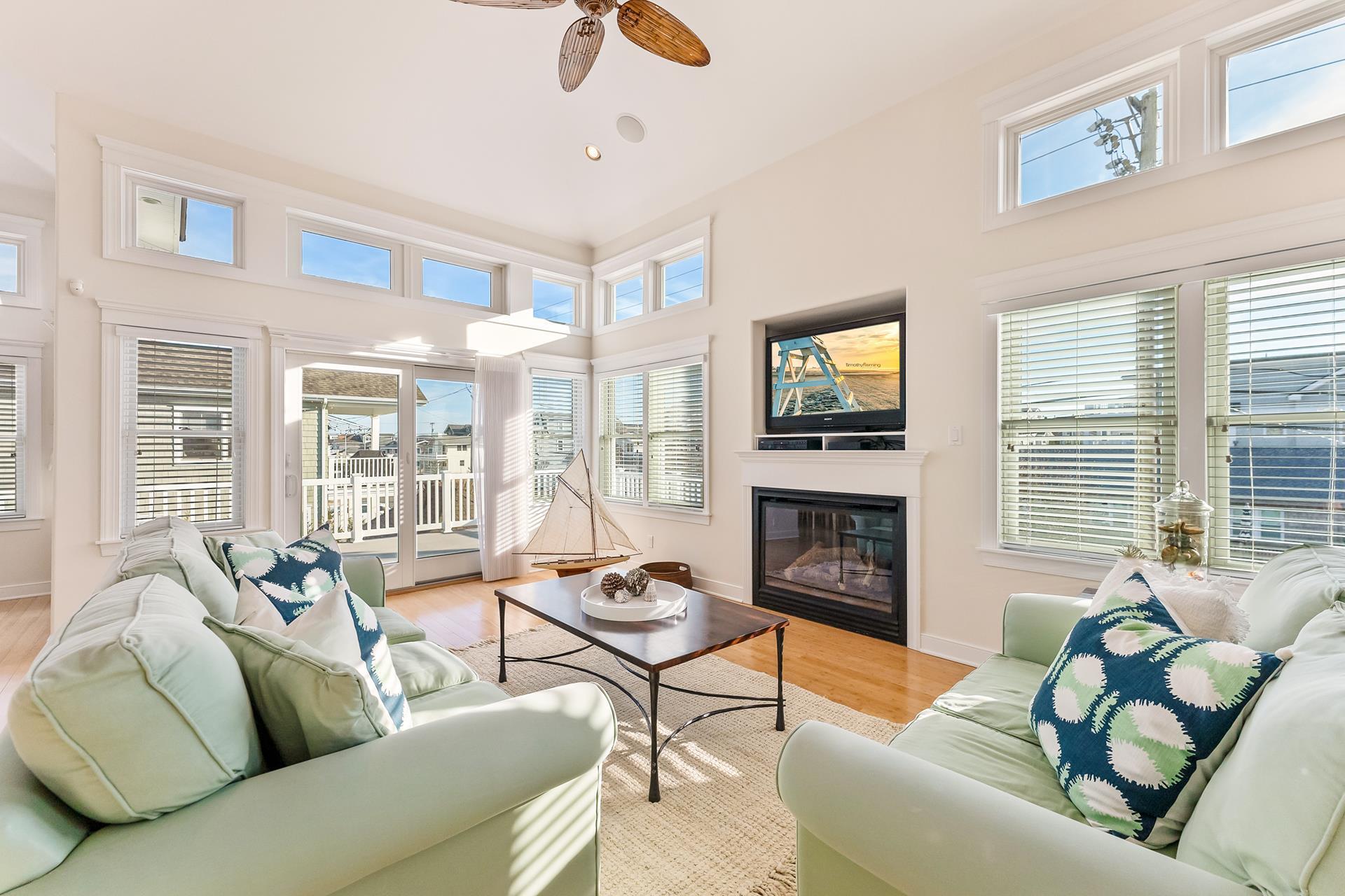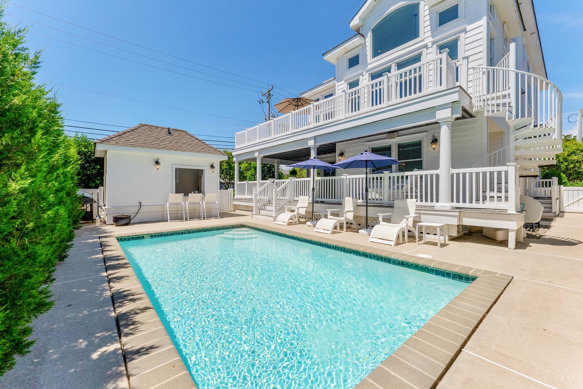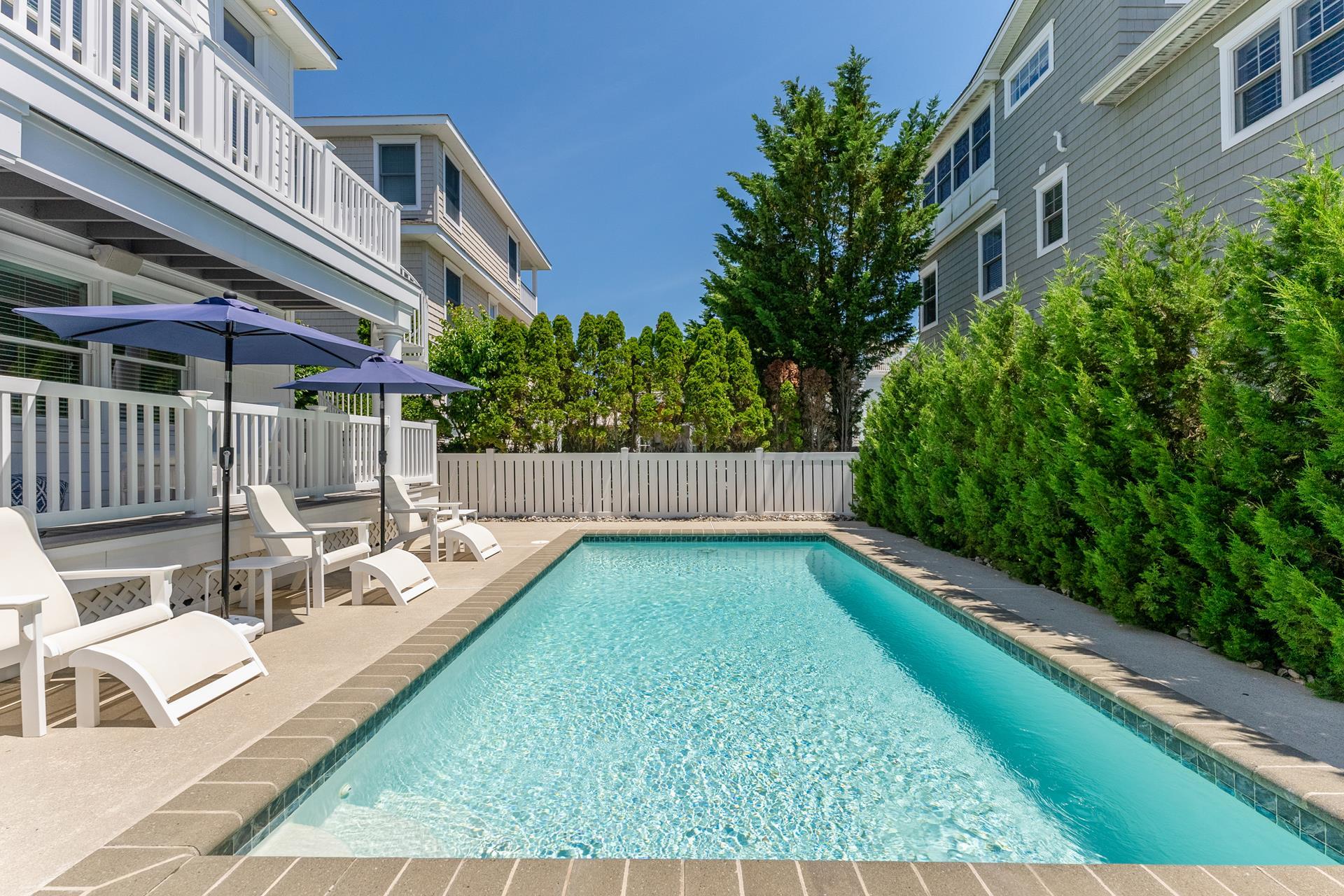 Escape to your dream summer retreat with this stunning luxury beach rental! Nestled on a spacious corner lot, this north end gem is just 2 blocks from the beach, and a short stroll to town. With 6 bedrooms and 6 baths, there's plenty of space for family and friends to enjoy a relaxing getaway. Relax in the spacious living areas, dive into the fun at the pool, or chill out at the cabana with a brand-new outdoor TV. Enter the home through 13th Street into a welcoming foyer with a circular staircase. The generous family room, complete with sliding doors, makes it effortless to transition from indoor relaxation to outdoor enjoyment on the covered deck that overlooks the pool and cabana. The lower-level features two spacious bedrooms with ensuite baths, a sizable laundry room and easy access to the backyard. Head to the second floor, where you'll find a vast open concept living area boasting vaulted ceilings and large windows. The impressive kitchen is perfectly equipped and includes seating for 12. Sliding doors open to a stunning deck for alfresco dining and lounging anytime. The living room, adorned with vaulted ceilings and large light-filled windows, also opens to the deck through sliding doors. Two additional bedrooms, each with ensuite baths, are located on this floor, one featuring its own private deck. The third floor hosts a luxurious private primary suite with a private deck, spacious bath with a jetted tub, walk-in closet with natural light, and a laundry closet with a full-sized washer and dryer. A sixth bedroom with an ensuite bath shares this floor as well. This home is brimming with amenities to enhance your stay: a fenced yard with privacy hedges surrounding the pool, new HVAC systems, a new pool heater, and a new gas grill. Also, owner is "freshening up the kitchen, adding new bar stool chairs, new dining table/chairs, new light fixtures, new living room furniture in the 2nd floor great room and new carpets in 4 of the bedrooms. Owner offers nightly rates in the off season at $1000 per night with a 3 night minimum and is willing to keep the pool open through the end of September if booked.