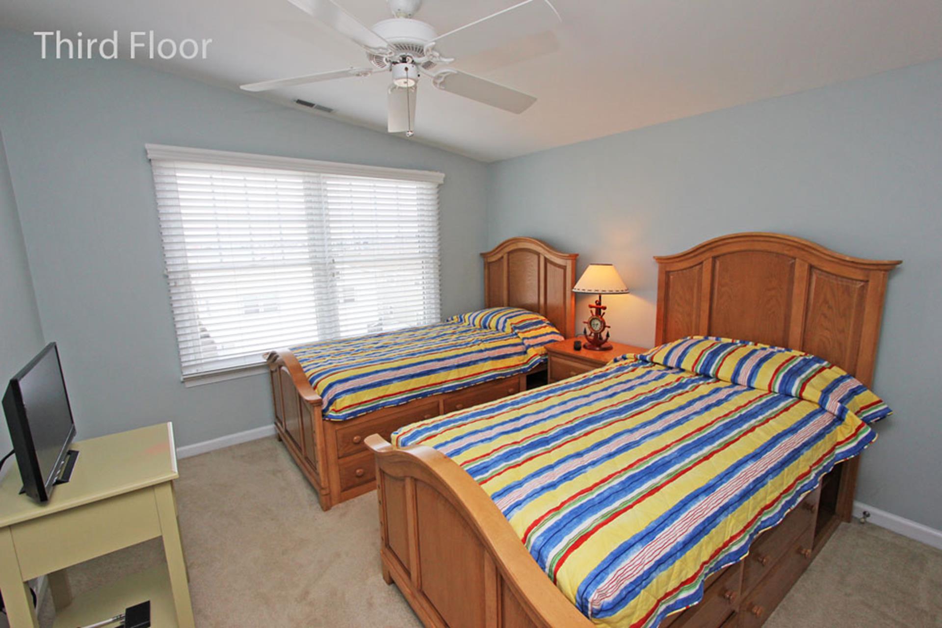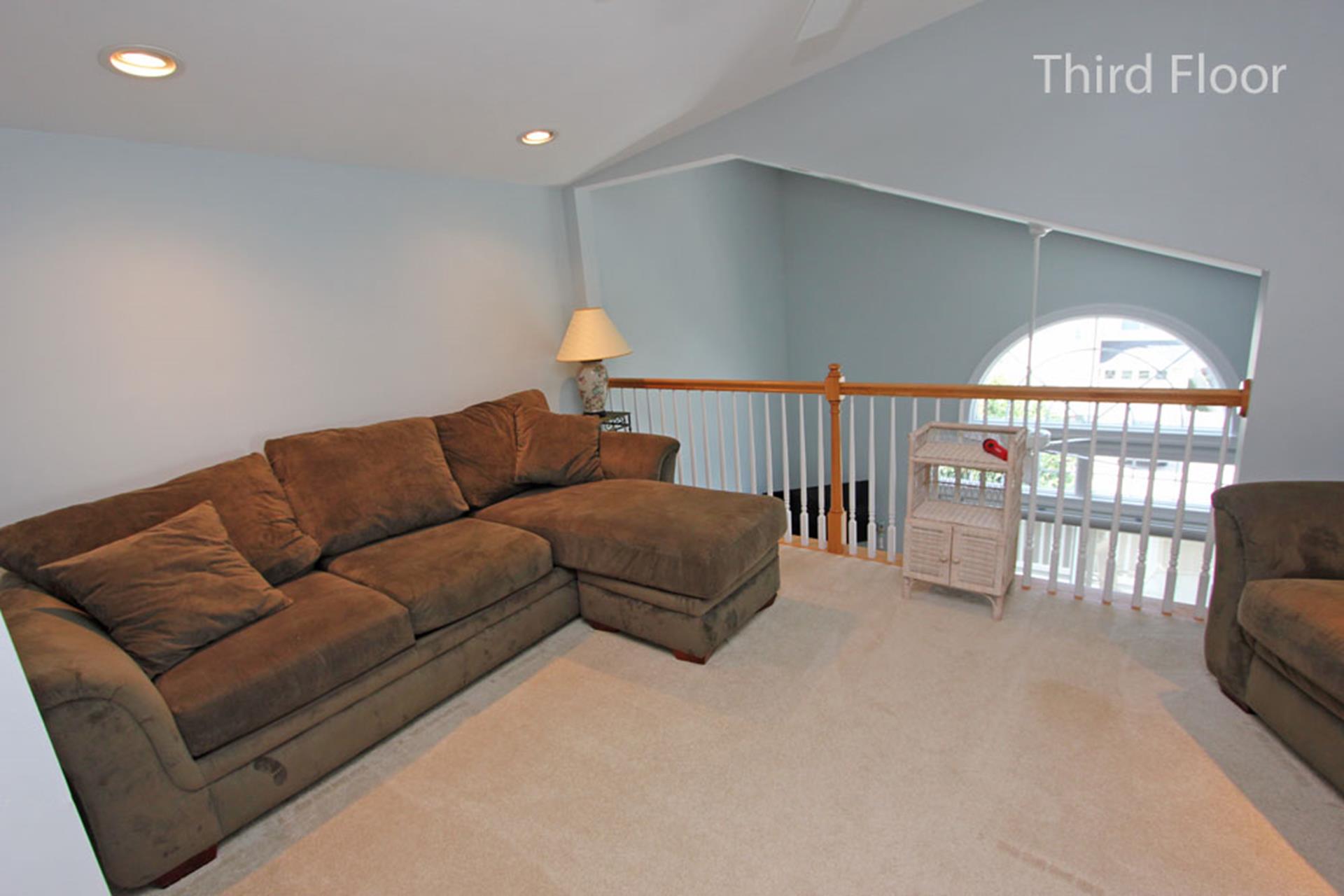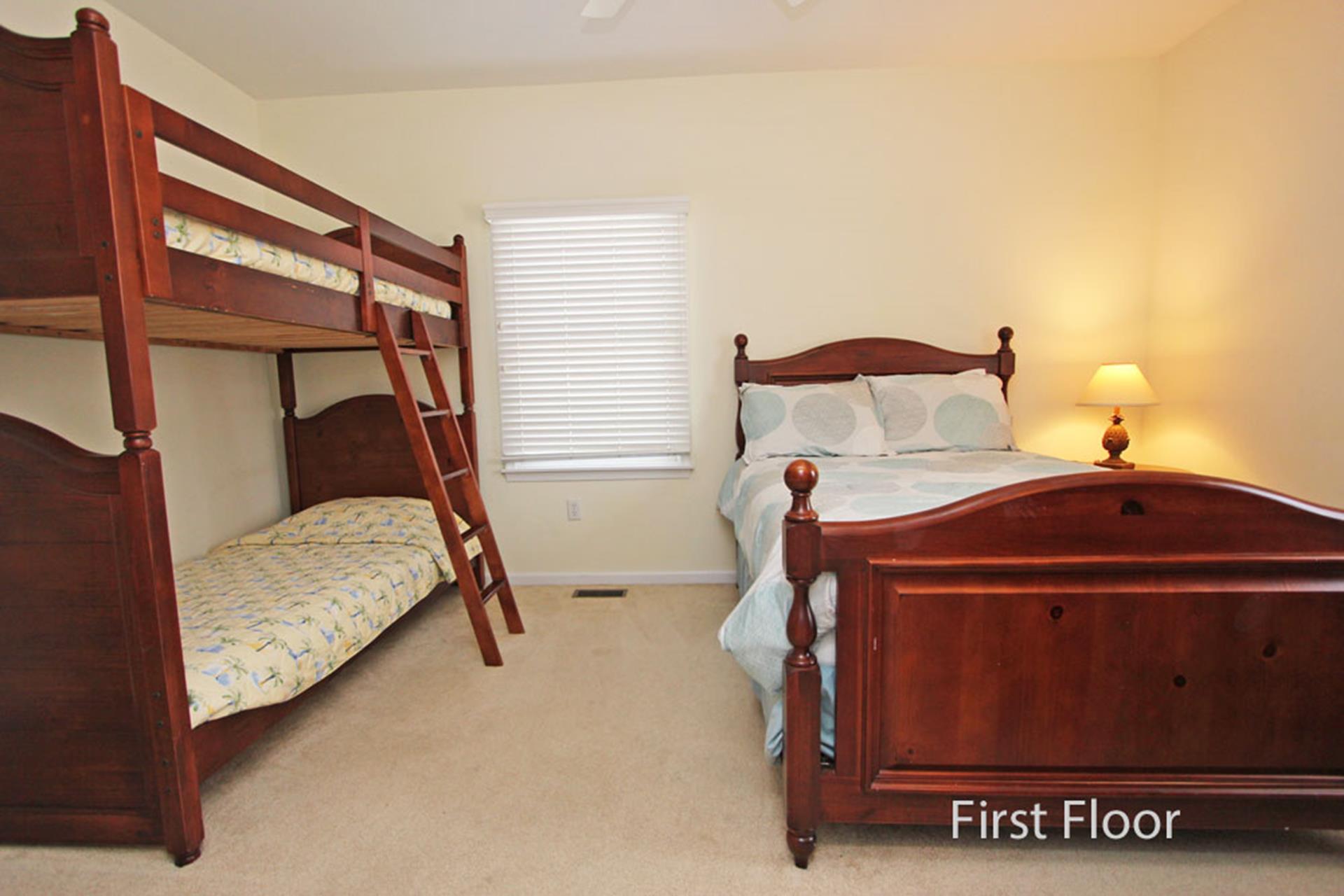 | Beautiful three story townhouse with 5 bedrooms and 5 1/2 baths. The first floor offers a game room with wet bar and a slider to a deck, a full hall bathroom, a bedroom with a double size bed and a set of bunk beds and a junior master bedroom with a queen bed and private bath. The second floor consists of the main living area with a slider to a deck, a half bathroom, the kitchen and dining area. Also on the second floor is the master bedroom with a king size bed and master bathroom with jacuzzi tub. There is a bedroom with 2 twin size beds, a full hall bathroom and a bedroom with a queen size bed (attached bathroom) on the third floor along with a sitting area. |
