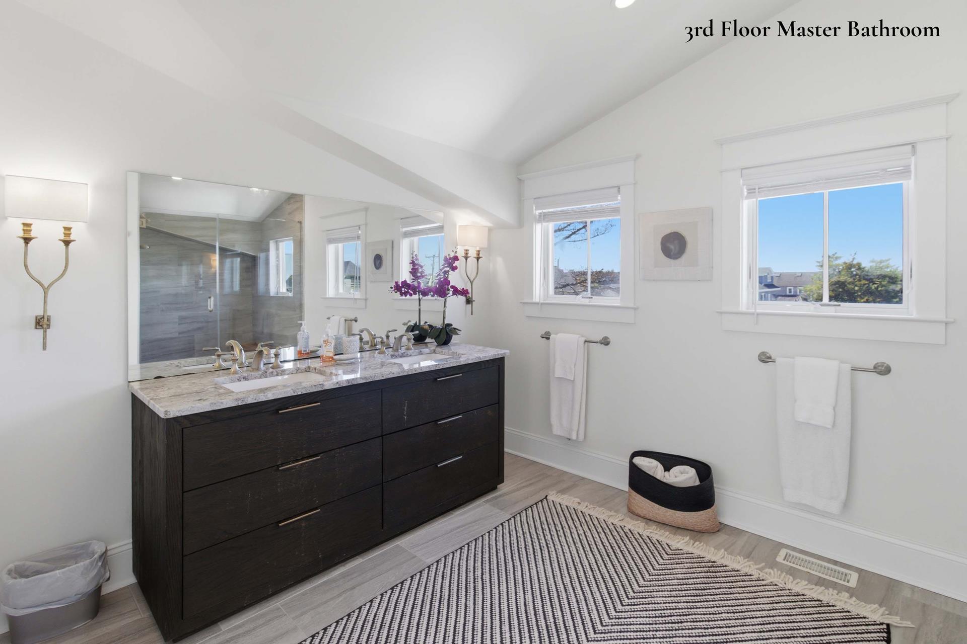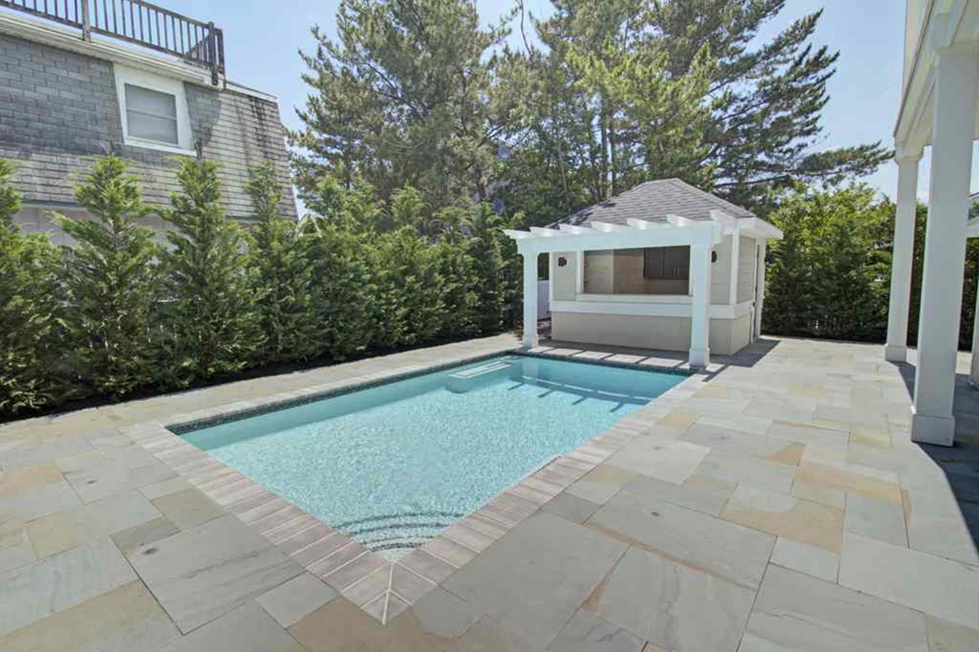 | Three story upside down style home. Close to the beach and walking distance to town. The expansive 6 bedroom, 6 ensuite bath, 2 powder room floor plan. The welcoming foyer leads to a large family room with wet bar overlooking an inground, heated swimming pool with Leyland Cypress privacy screen and blue stone pool decking. First floor offers 3 bedrooms with ensuite baths (two of the bedrooms have one queen in each and the third has 2 sets of bunk beds with single over single for each), powder room, laundry and a beach entry room with pegs and cubbies. The second floor open great room has soaring ceilings and living and dining areas. The kitchen is a beautiful Colmar custom kitchen with oversized center island, high end stone tops, premium appliances, pantry and a beautiful wet bar opposite the center island. Two additional bedrooms with ensuite baths complete the second floor each having a Queen bed. Front and rear decks flow through the great room great for entertaining the family. The third floor has a dramatic balcony, expansive master bedroom with King bed, den, study, office or exercise area, gorgeous master bath with twin bowls and over sized shower, large walk in closet and a second laundry. Other amenities include hardwood floors throughout, built in bunk beds with dressers, built in queen bed, window seat, storage shed and pool cabana area. |
