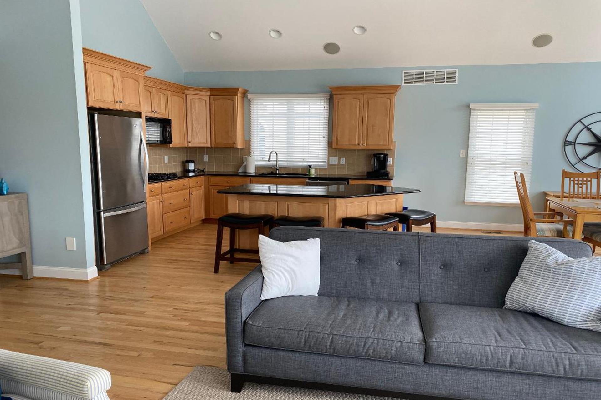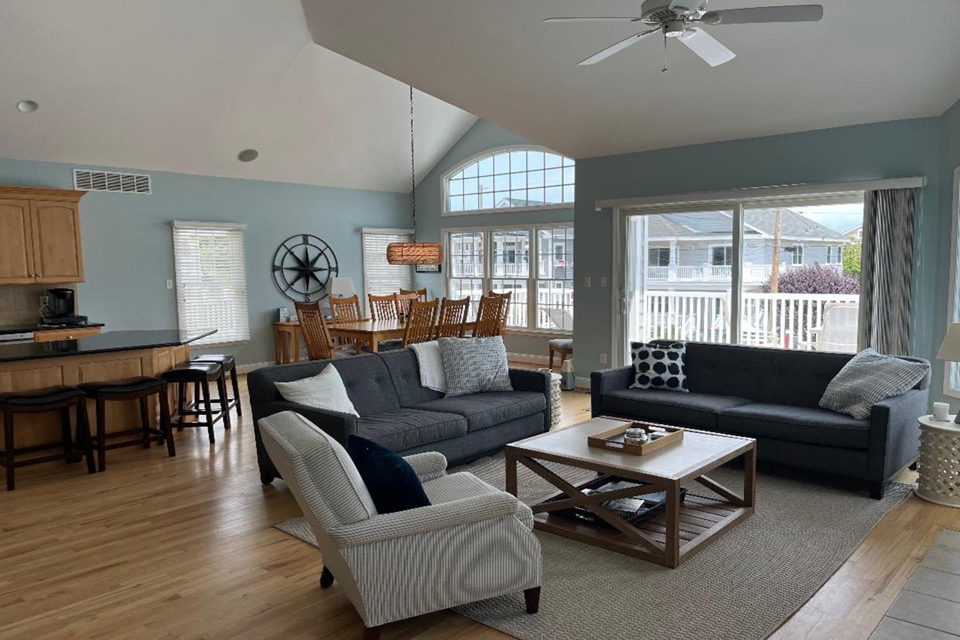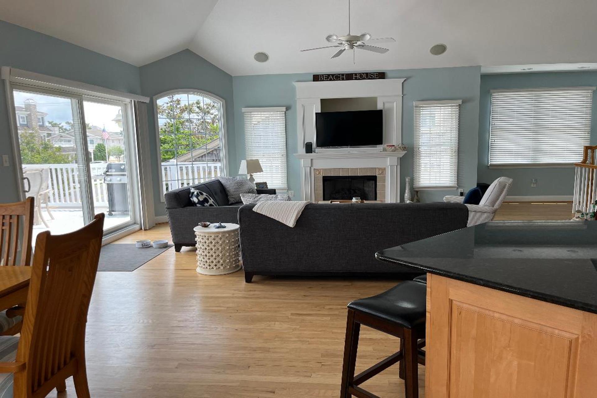 | This 5-bedroom, 5 full bath single-family home features a large 400+ sq. ft. pool and prime location just over two blocks from both the beach and the 8th street playground/park/courts. The 1st floor includes 2 bedrooms (queen, 2 twins), 2 full baths, laundry/utility room, garage, and family room (queen sofa bed) opening to covered 1st floor porch. Upstairs leads to the bright and cheery 2nd floor great room with hardwood floors and vaulted ceilings, featuring an open living area, dining area, kitchen/island with granite countertops, and walk-in pantry. The Sliders lead to a spacious 2nd floor deck, ideal for dining/entertaining and facing north with natural shade from early afternoon on. The 2nd floor also has 2 bedrooms (queen, 2 full size) and 2 full baths. The 3rd floor includes a private primary suite (king), walk in closet, primary bath, and back deck. Backyard features patio/dining area, outdoor shower and large heated pool surrounded and partly shaded by mature cypress trees. Ideal home and location for enjoying all that vacationing at the peaceful north end of Avalon has to offer! |