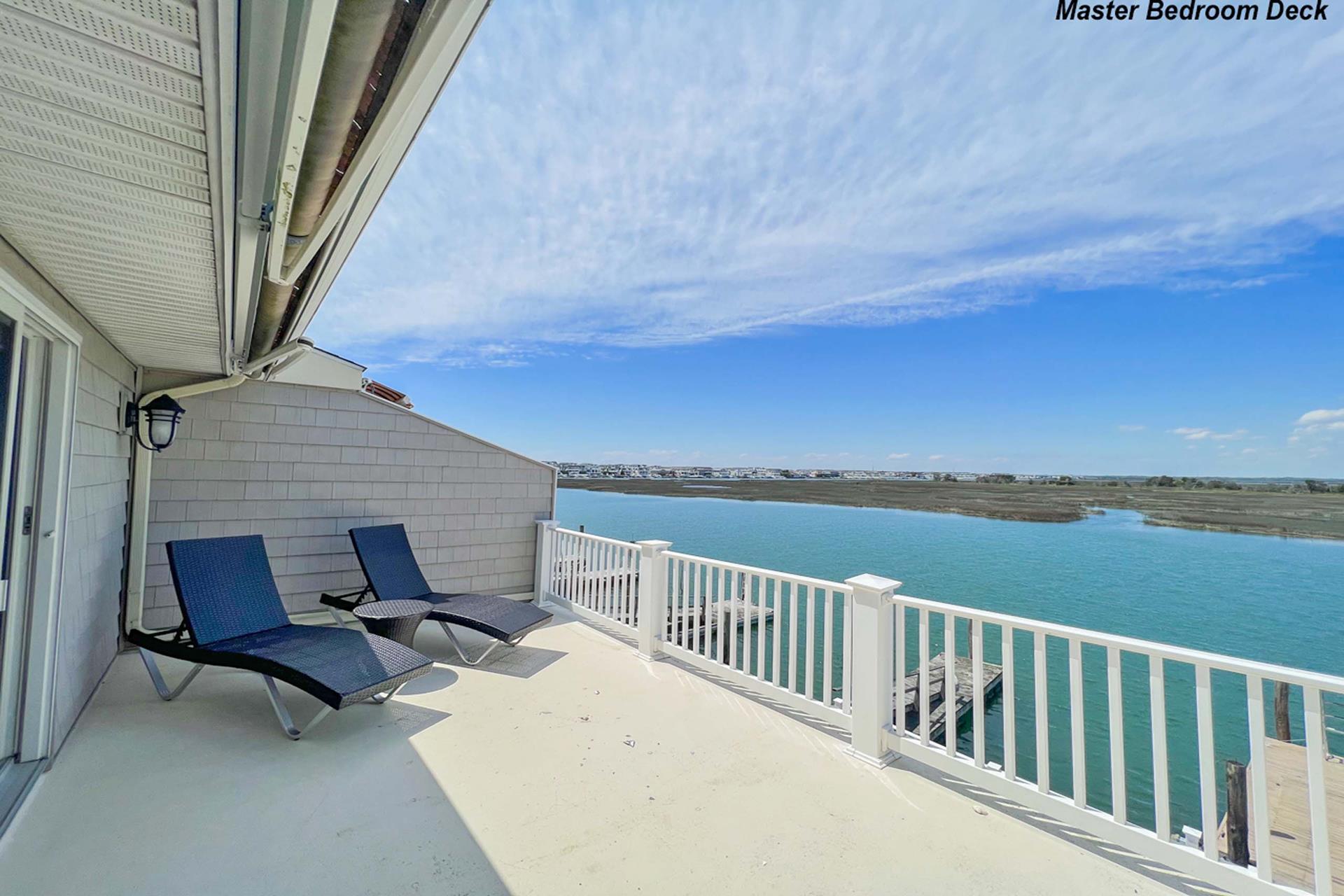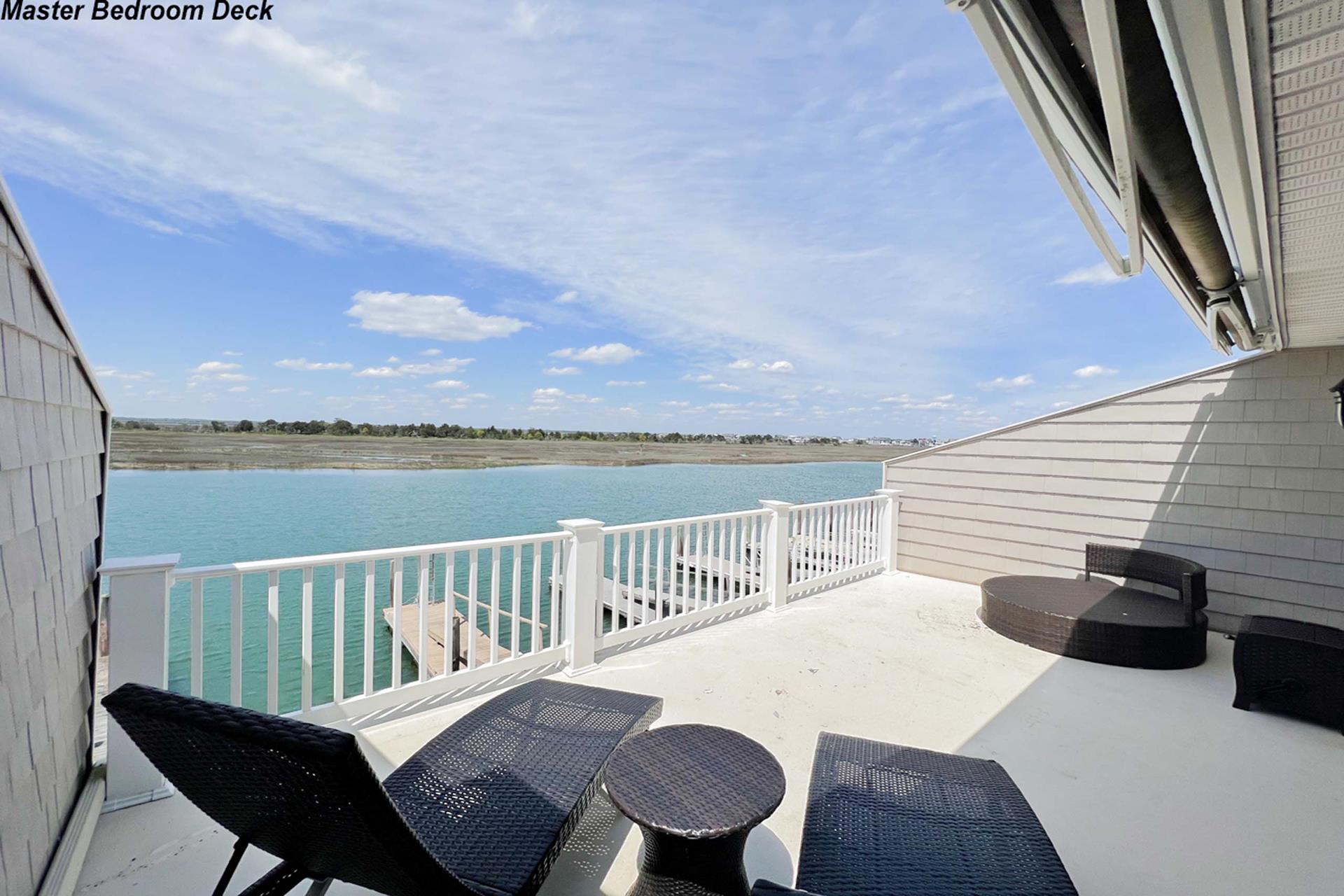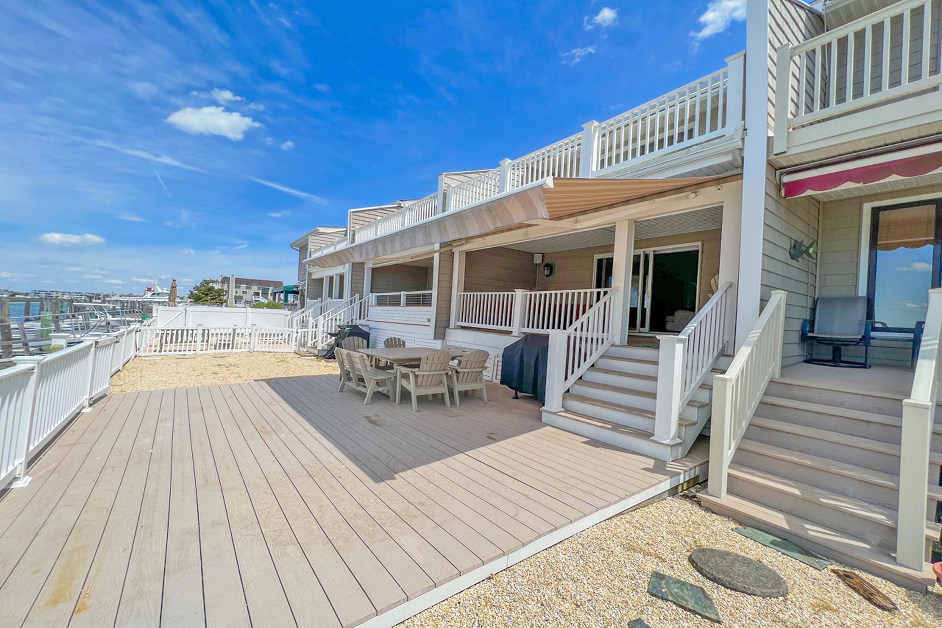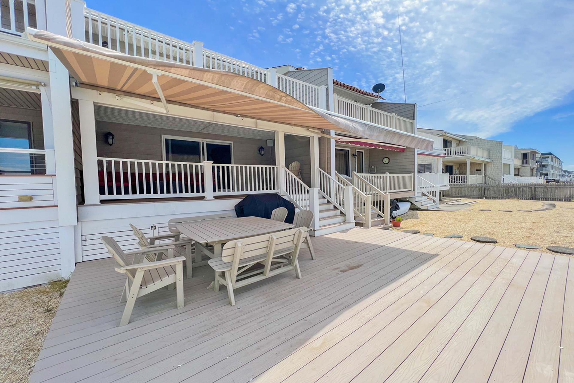 | Fantastic two story bayfront townhome located in the quiet north end area of Avalon situated between 15th and 16th street on Ocean Drive. Close to the recreational area (8th to 12th street) with basket ball court, volleyball, playground, and field. First floor provides custom kitchen with built in dual ovens, large stainless steel side by side refrigerator, ceramic glass cooktop range, hardwood floors, recessed lighting, and granite counters and island with sit down seating. An inviting first floor living area with sectional sofa, hardwood floors, mounted flat screen television, rear deck access and beautiful bay views, mini wet bar area with granite counters, wine enthusiast mini refrigerator and UL ice maker. Also, first floor hosts the dining area and powder room. All three bedrooms are located on the second floor. Bay front Master Bedroom with King Size Bed, his and her closets, flat screen television, carpets, ceiling fan, private deck with great bay views, deck, and private master bath. Southeast bedroom with a Queen bed, flat screen television, ceiling fan, carpets and closet. Northeast bedroom with two twin beds, mounted flat screen television, ceiling fan, carpet and closet. Second floor also features washer and dryer area and hall full bathroom (with tub). There is NO outside shower. |