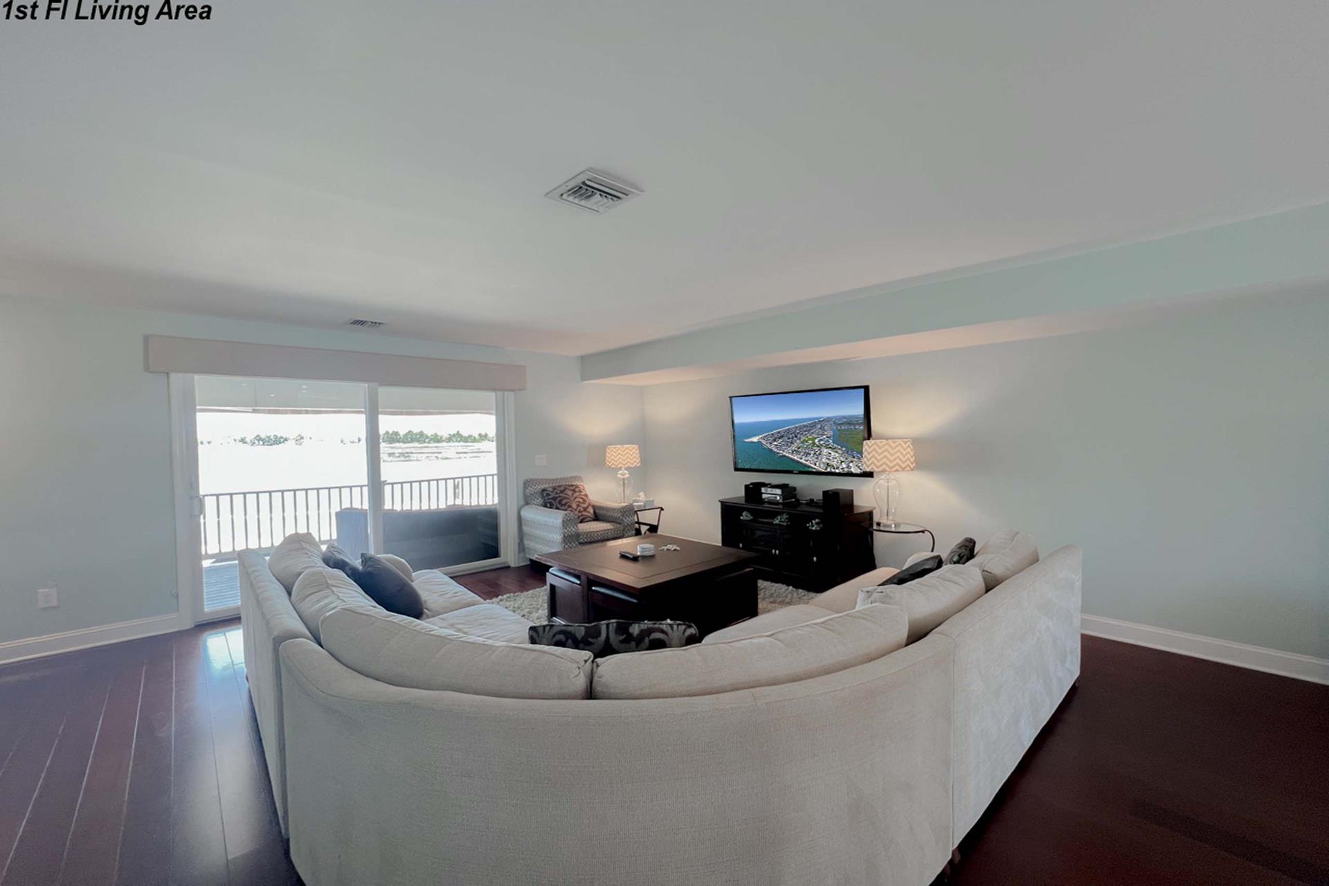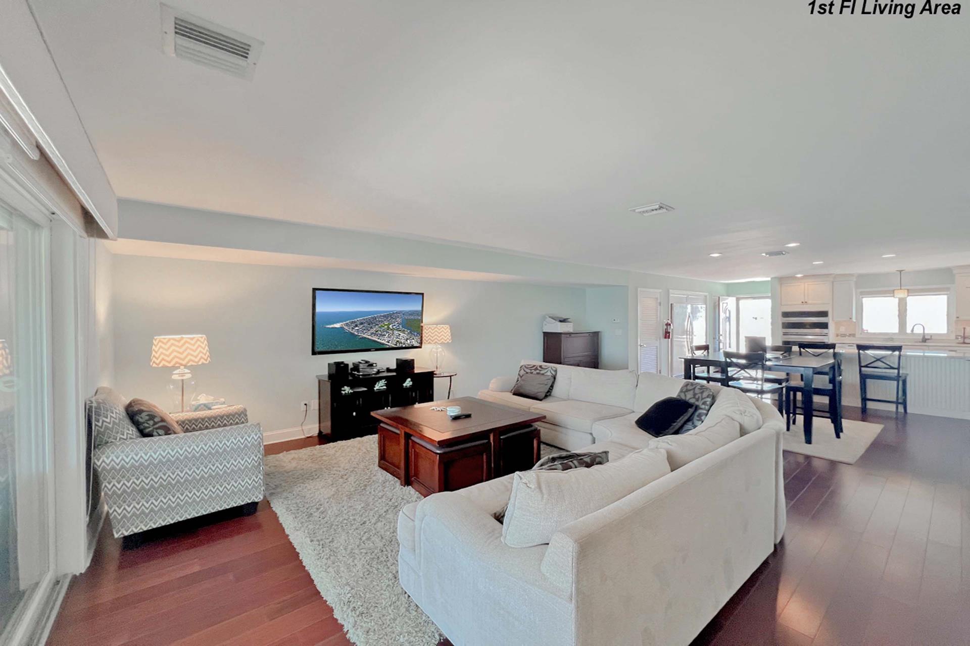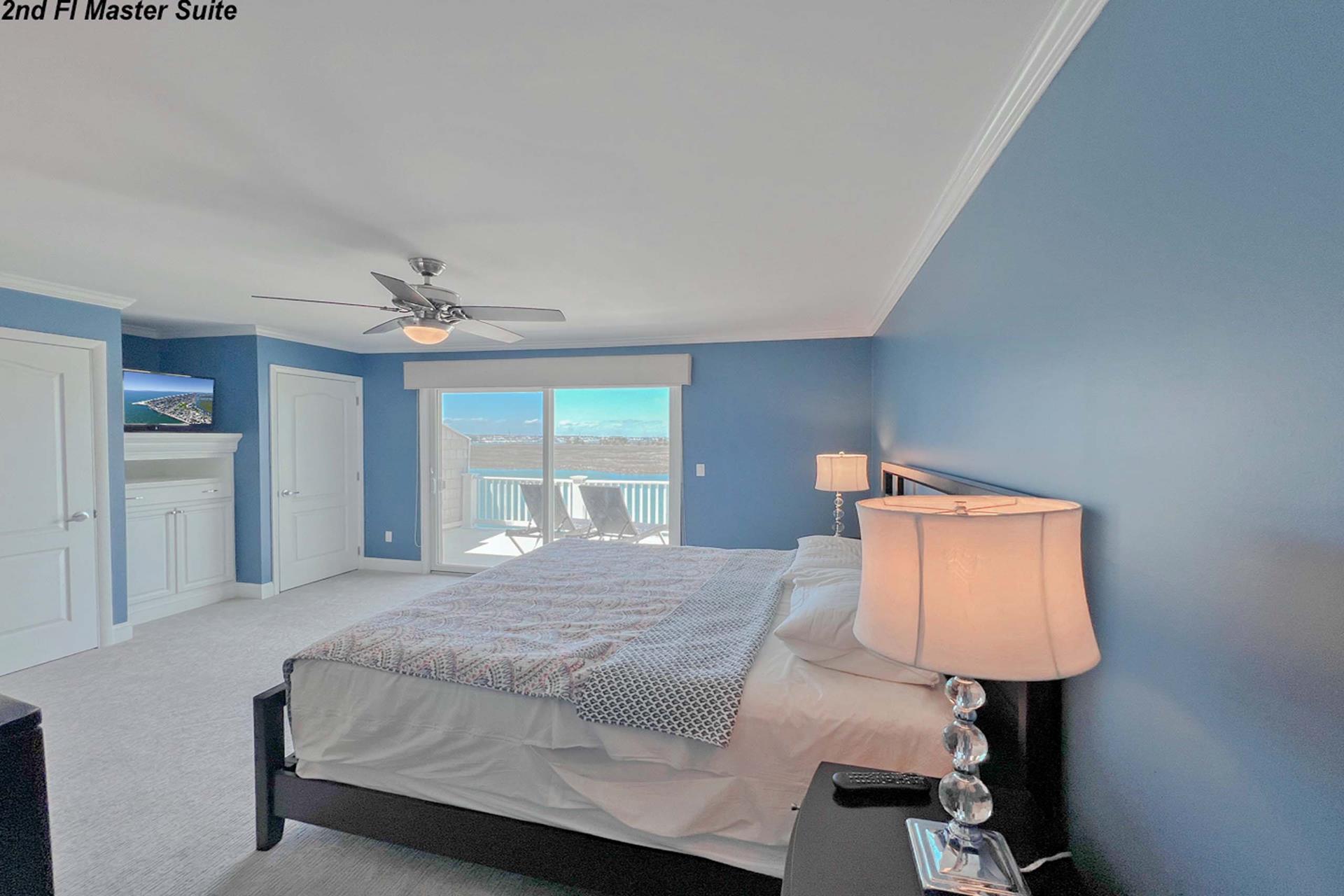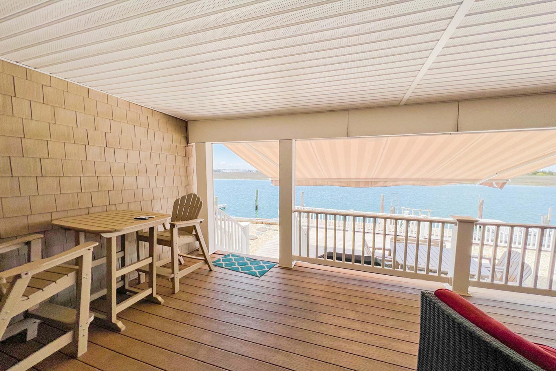 | Fantastic two story bayfront townhome located in the quiet north end area of Avalon situated between 15th and 16th street on Ocean Drive. Close to the recreational area (8th to 12th street) with basket ball court, volleyball, playground, and field. First floor provides custom kitchen with built in dual ovens, large stainless steel side by side refrigerator, ceramic glass cooktop range, hardwood floors, recessed lighting, and granite counters and island with sit down seating. An inviting first floor living area with sectional sofa, hardwood floors, mounted flat screen television, rear deck access and beautiful bay views, mini wet bar area with granite counters, wine enthusiast mini refrigerator and UL ice maker. Also, first floor hosts the dining area and powder room. All three bedrooms are located on the second floor. Bay front Master Bedroom with King Size Bed, his and her closets, flat screen television, carpets, ceiling fan, private deck with great bay views, deck, and private master bath. Southeast bedroom with a Queen bed, flat screen television, ceiling fan, carpets and closet. Northeast bedroom with two twin beds, mounted flat screen television, ceiling fan, carpet and closet. Second floor also features washer and dryer area and hall full bathroom (with tub). There is NO outside shower. |