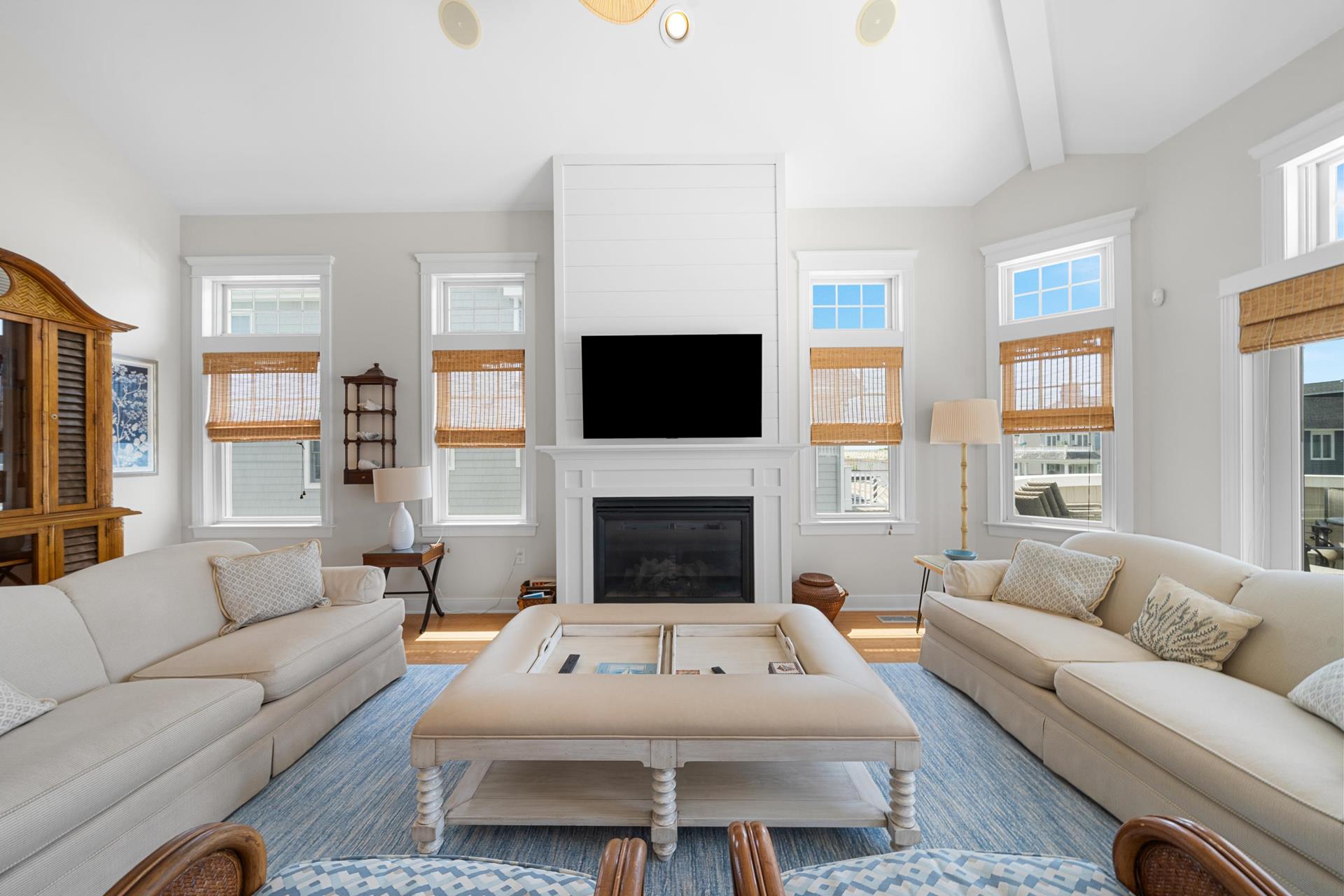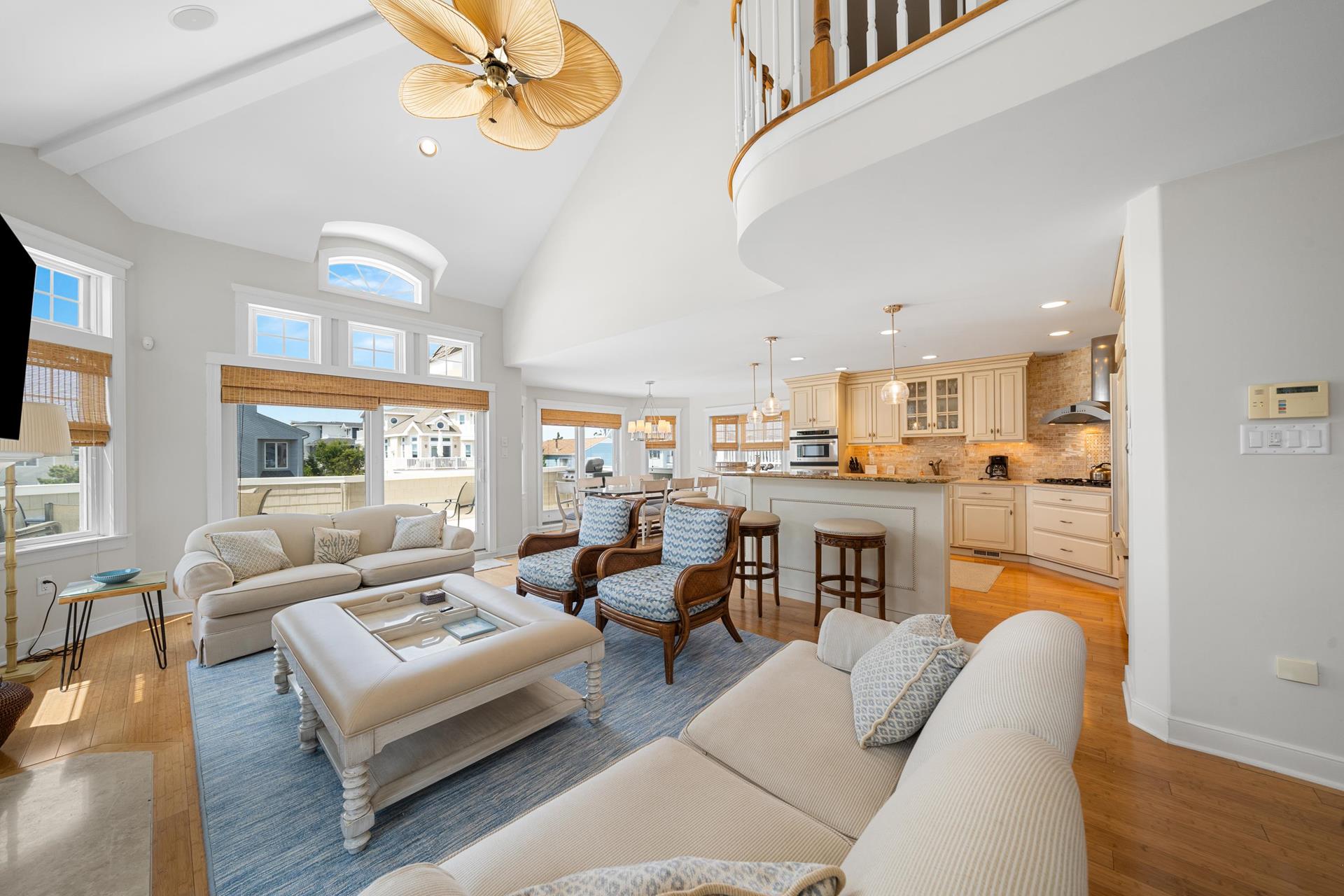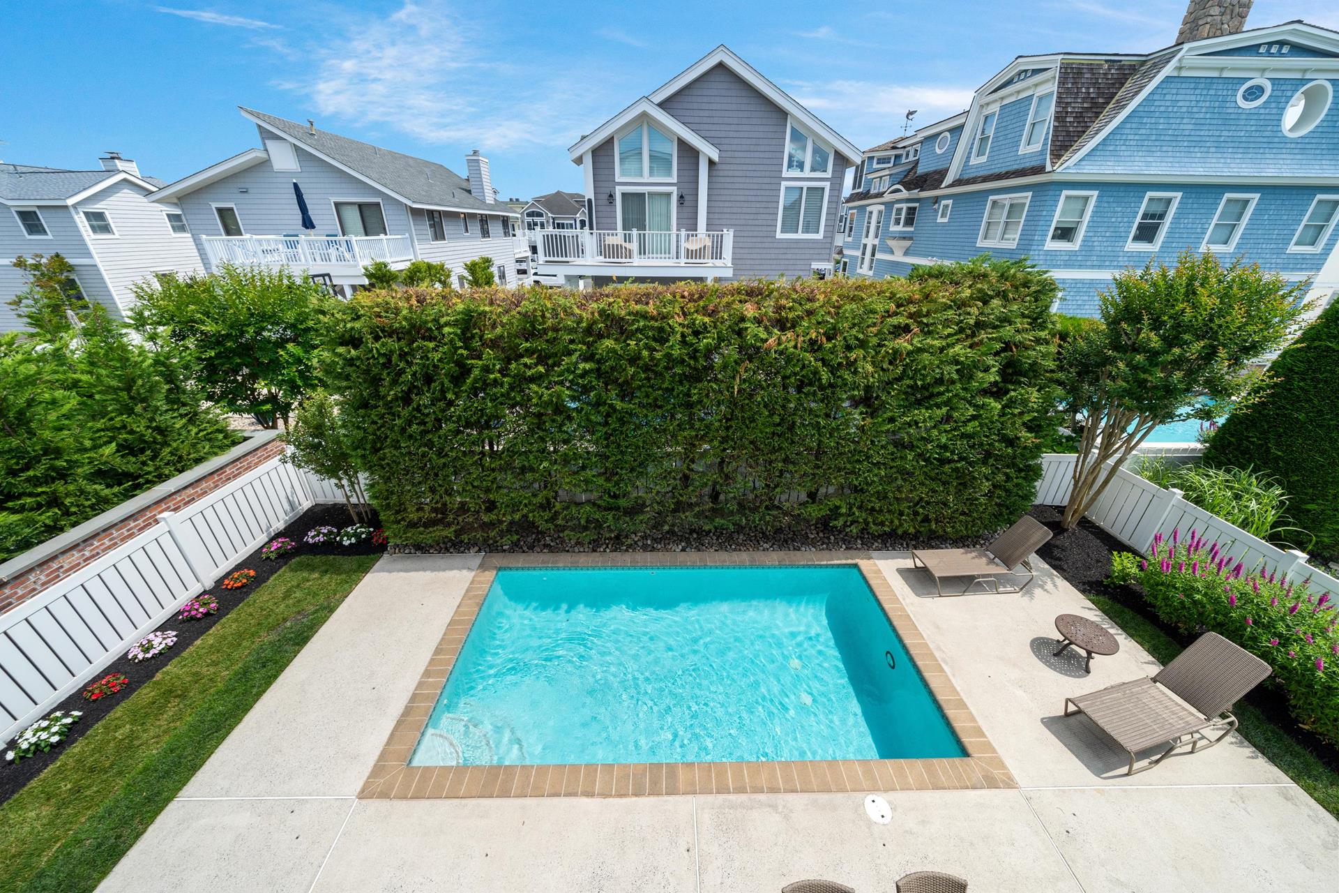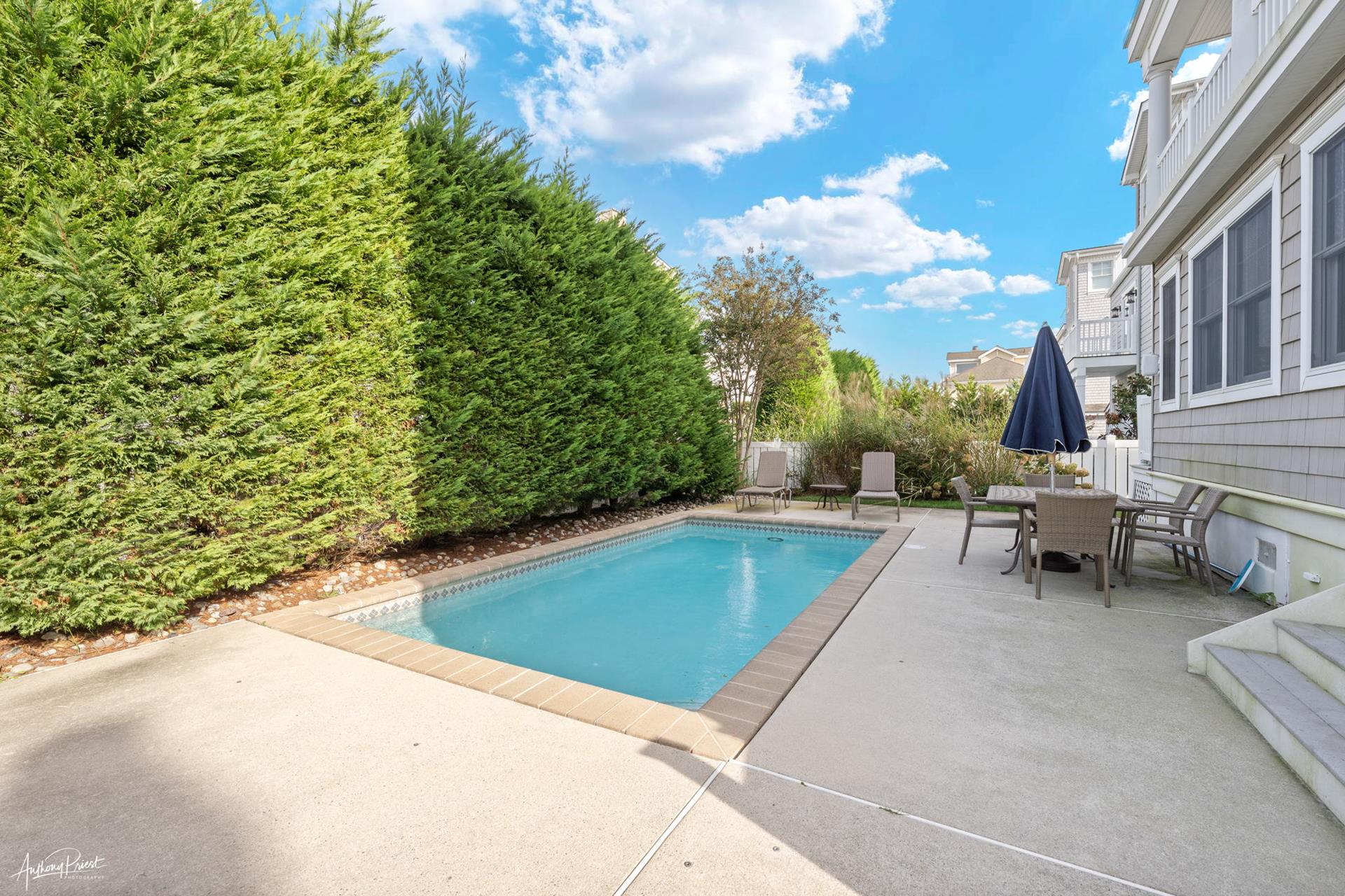 Vacation in the lap of luxury in this spectacular 6BR, 6BA designer furnished and decorated beach block home. Swim or sun yourself by the heated pool in the beautifully landscaped rear yard or lounge indoors in air conditioned comfort in the elegant family room with a fantastic wet bar and flat screen TV. The first floor also holds a full bath and 2 bedrooms: Junior suite with a queen and a set of twin beds. Ascend to the second floor living area where you can relax or entertain in the spacious living room featuring volume ceilings and access to a front deck. Bamboo flooring throughout and vaulted ceilings allow this home to stand out amongst its beach block competition. Prepare anything from a snack to a feast in the well equipped gourmet kitchen, or enjoy the ocean s ebb & flow from the magnificent front decks! A full bath and 2 bedrooms (a junior suite with a King bed and 2 twins, each with deck access to enjoy the view of the pool & patio area) are located on the 2nd floor. Finally, the third floor master suite is fit for a king and queen with vaulted ceilings, a private deck overlooking the heated pool and a peek of the ocean, spacious walk~in closet and king bed. (Pool is open mid~May to mid~September) A junior suite with a queen and private deck are also located on the 3rd floor. This lovely beach block home is well maintained by the Owners and will serve as the perfect vacation destination for you and your family! |
