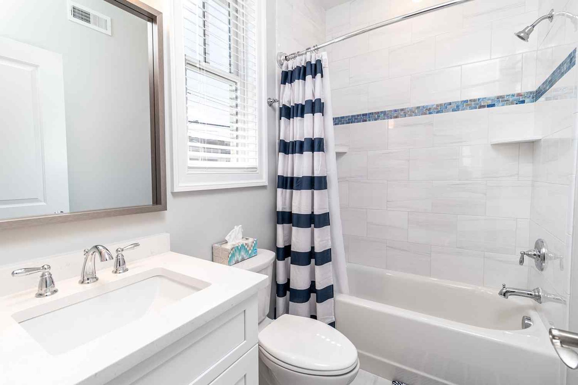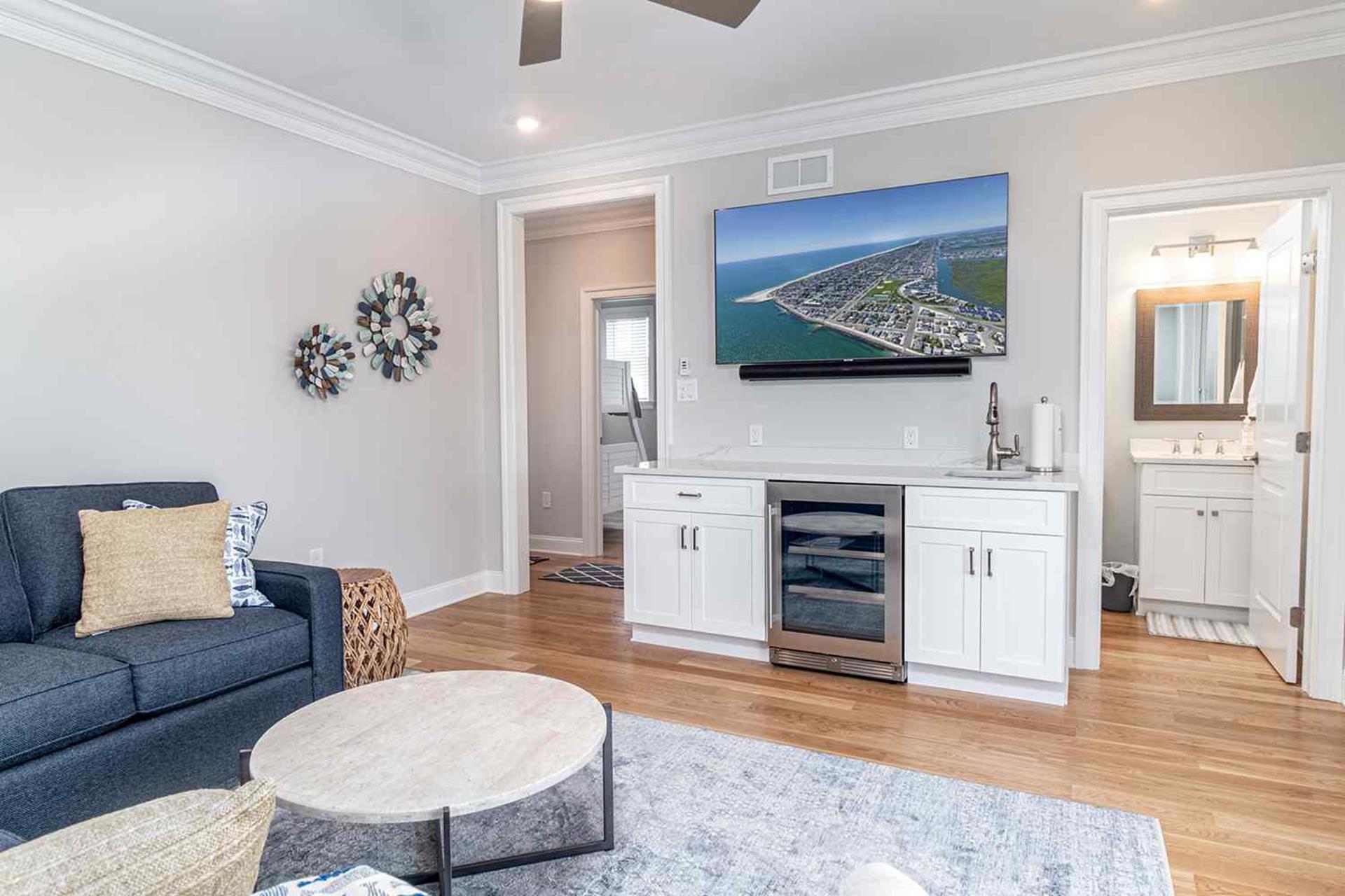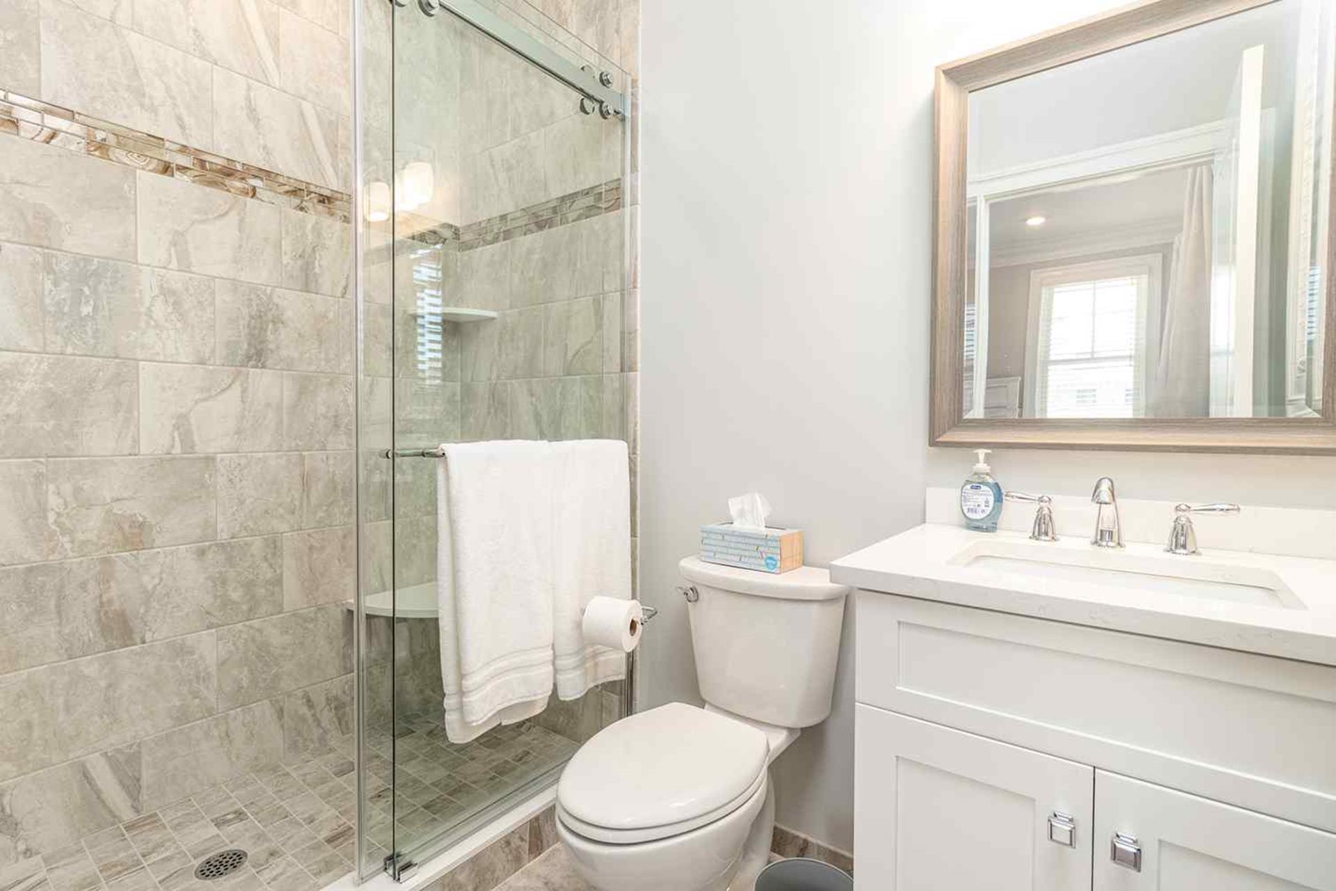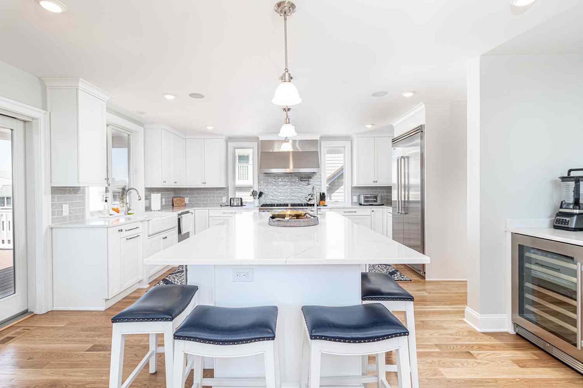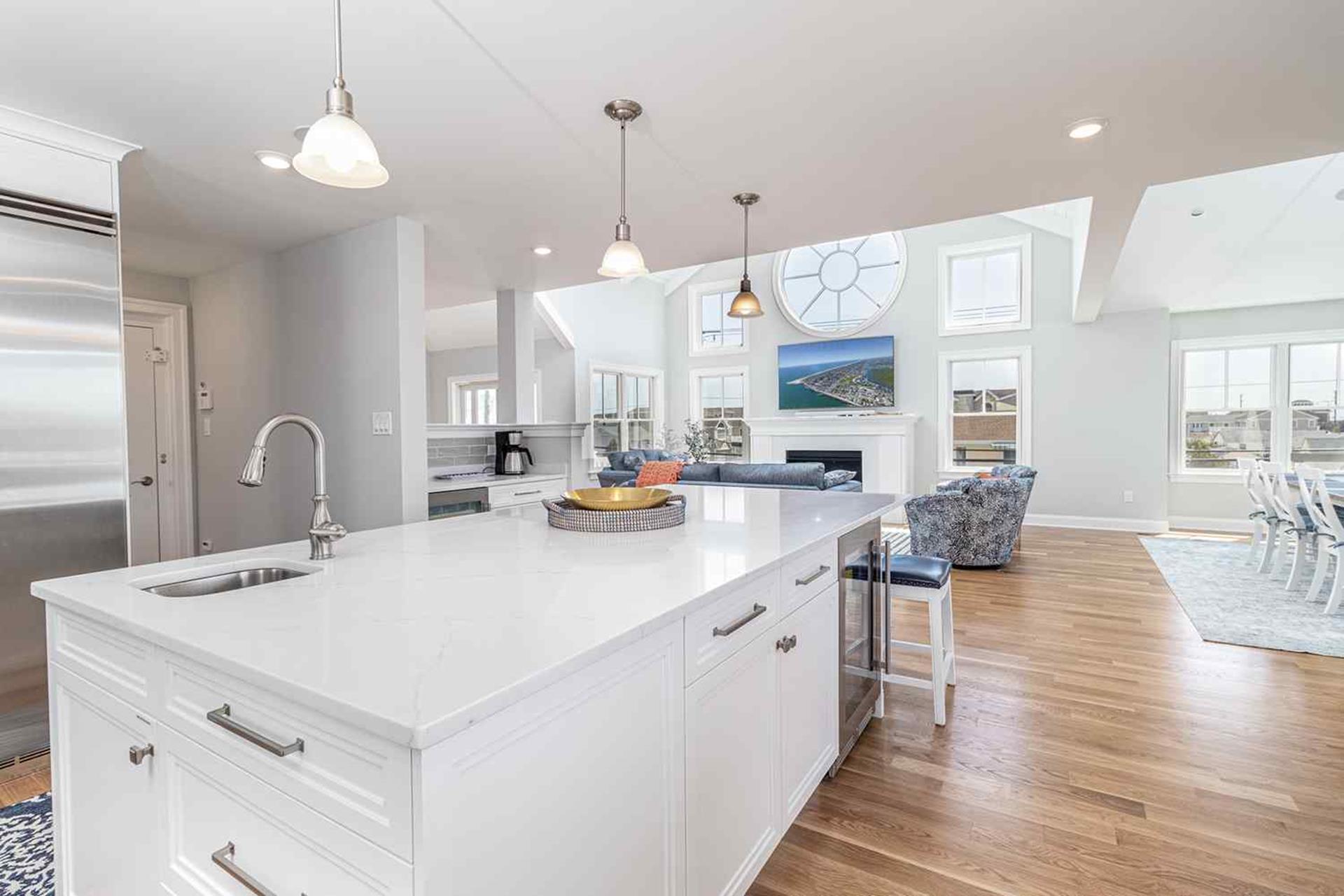 | Fantastic 7 bedroom 9 bath single family home sleeping 17 with 4 stop (Garage to 3rd floor) elevator and heated salt water kidney shaped concrete pool measuring 28 ft by 13 feet. Highlights for the home include, but, not limited to; all 7 bedrooms having their own private bathroom, hardwood flooring throughout home except in bathrooms which feature custom tiled flooring and quartz vanities, ceiling fans in all bedrooms, living room and 2 rear decks, The first floor has 3 bedrooms as follows; First floor bedroom with Queen bed and private bathroom with tiled standing shower with quartz vanity, slider to side deck, custom closet. Second bedroom has a bunk bed (sleeps 3) with full on bottom and single on top, custom closet, private bath with tub, shower and quartz vanity. Third bedroom with Queen bed, private bath with walk-in shower and custom closet. Also, the first floor hosts a family room with large navy blue sectional couch (queen pullout bed), TV, custom wet bar with quartz top, stainless steel sink and beverage fridge, room leads out to large deck overlooking pool and ceiling fan. First Floor family room powder room which is close to the pool deck. A laundry room is on the first level with LG large gas washer and dryer and 72" by 25" large folding area for pool and beach towels and door to access outside.