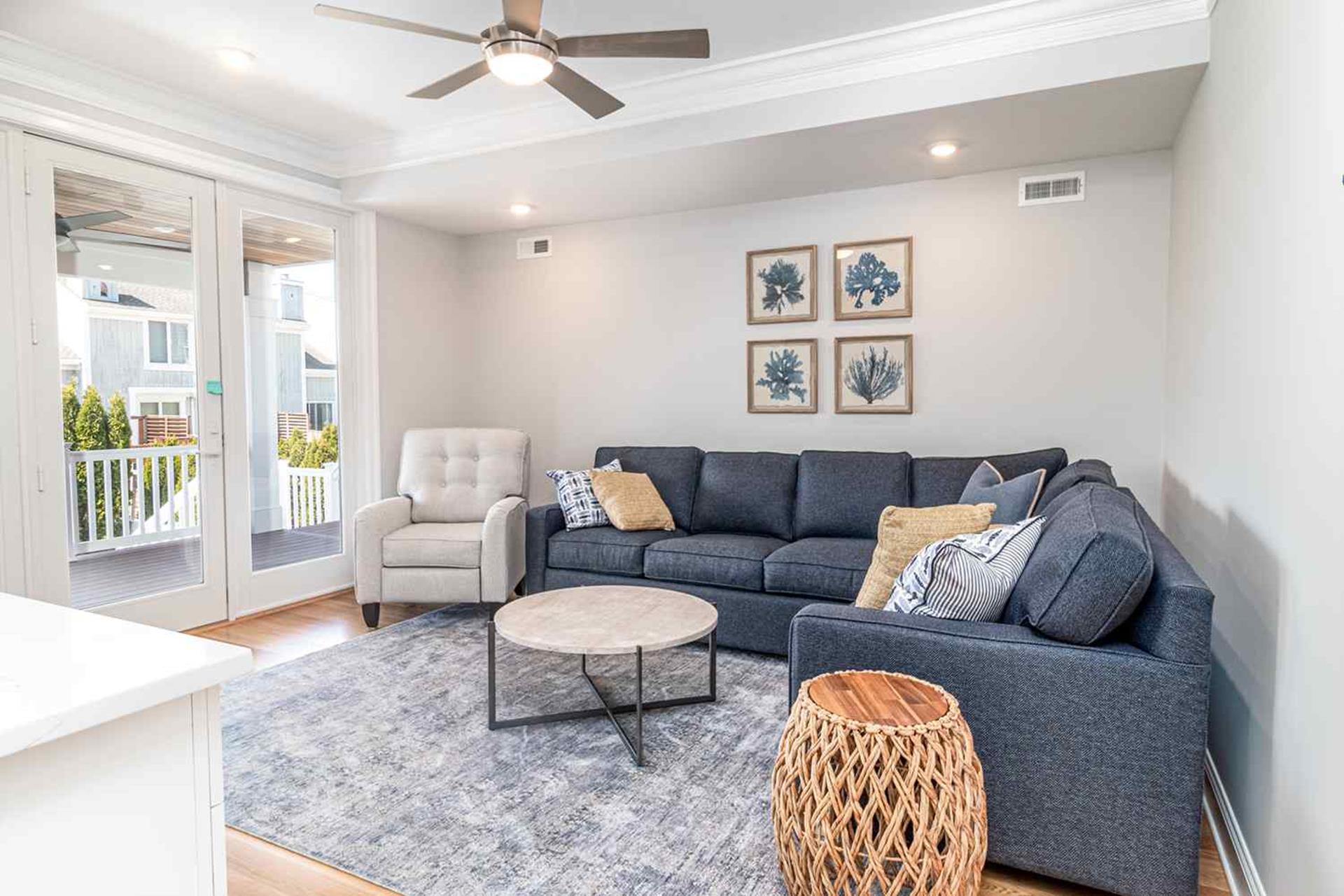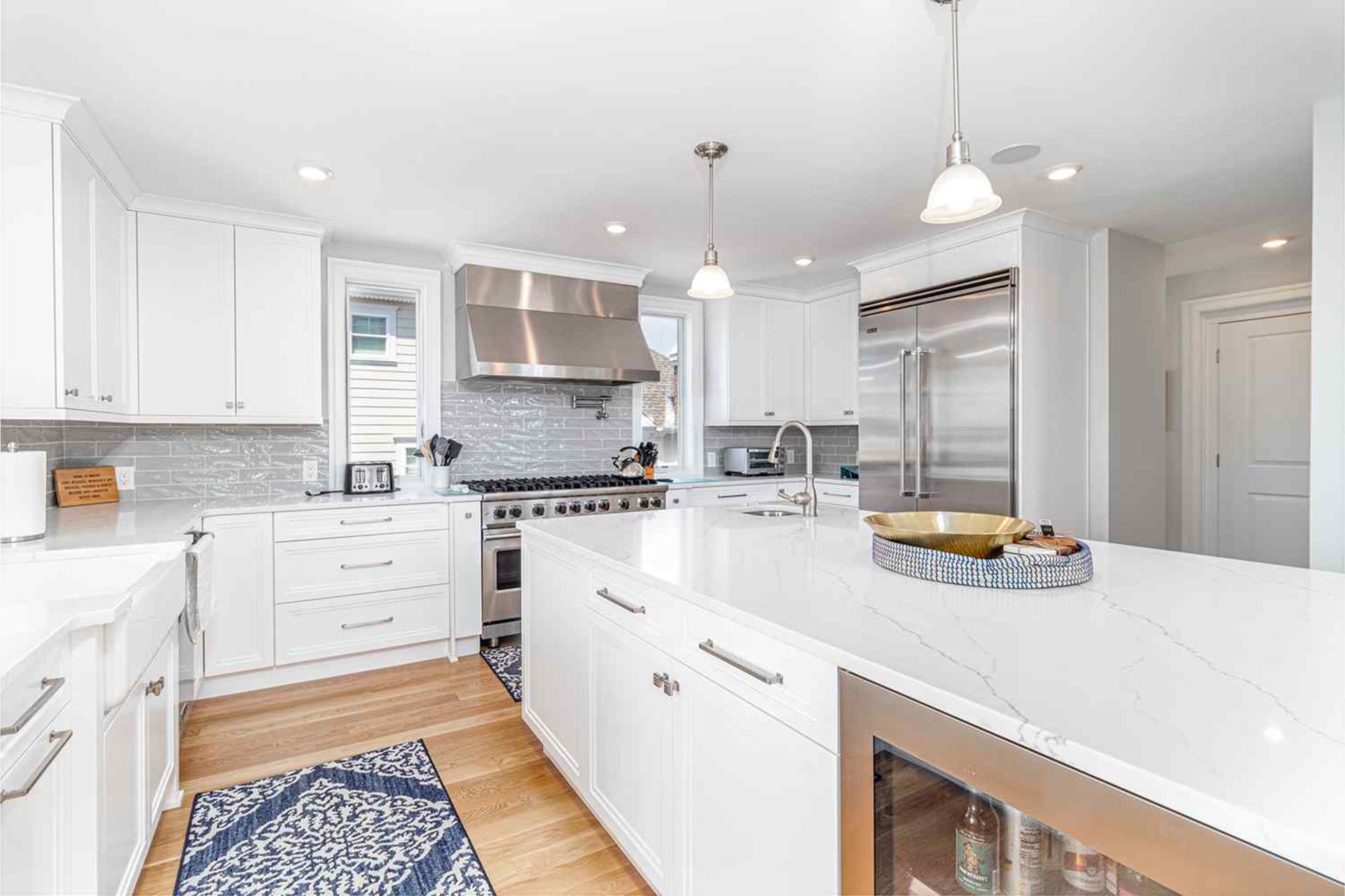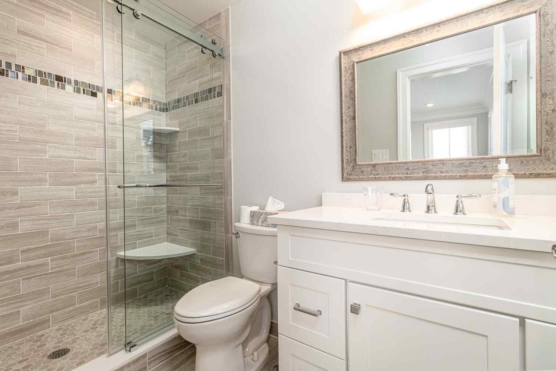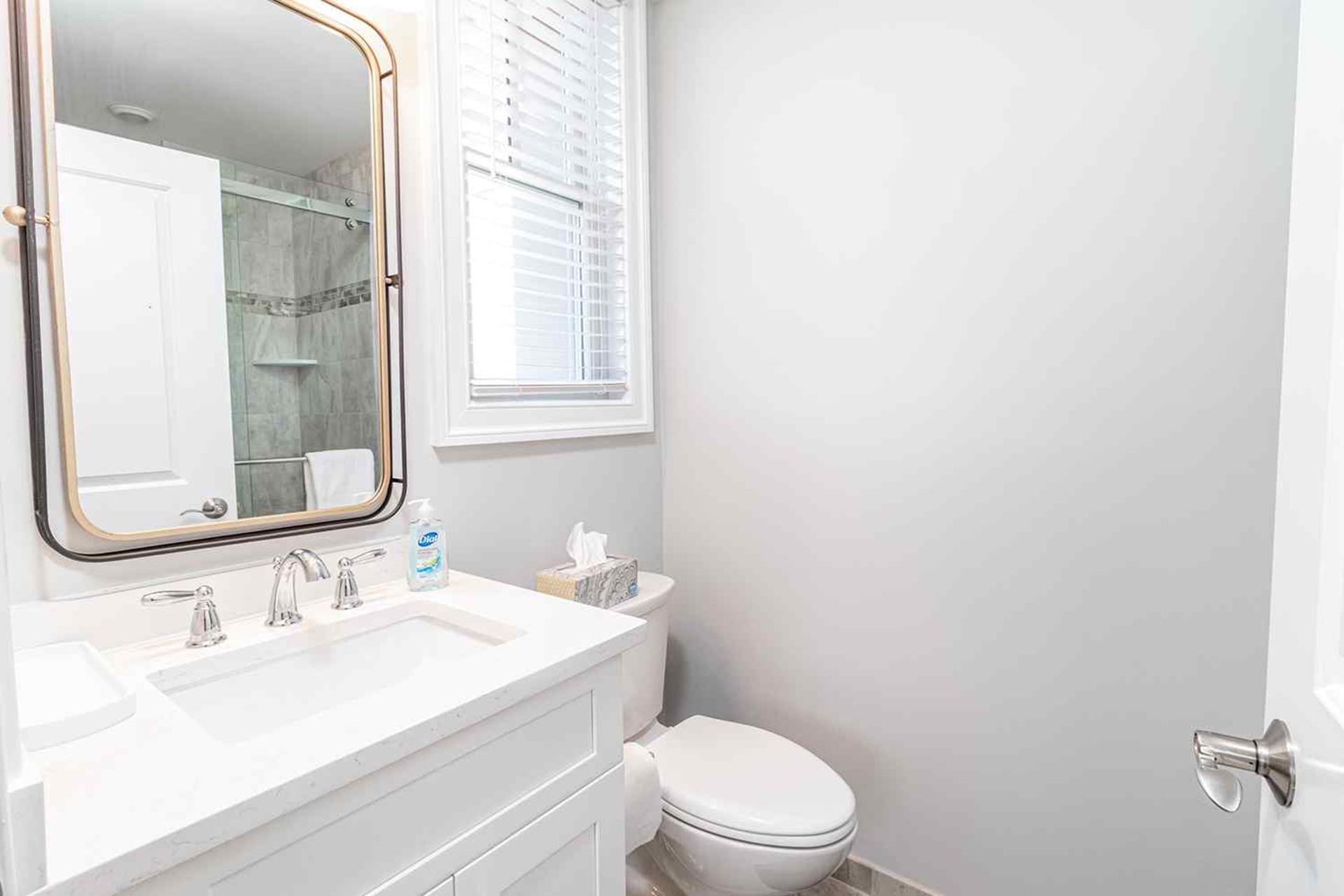| Fantastic 7 bedroom 9 bath single family home sleeping 17 with 4 stop (Garage to 3rd floor) elevator and heated salt water kidney shaped concrete pool measuring 28 ft by 13 feet. Highlights for the home include, but, not limited to; all 7 bedrooms having their own private bathroom, hardwood flooring throughout home except in bathrooms which feature custom tiled flooring and quartz vanities, ceiling fans in all bedrooms, living room and 2 rear decks, The first floor has 3 bedrooms as follows; First floor bedroom with Queen bed and private bathroom with tiled standing shower with quartz vanity, slider to side deck, custom closet. Second bedroom has a bunk bed (sleeps 3) with full on bottom and single on top, custom closet, private bath with tub, shower and quartz vanity. Third bedroom with Queen bed, private bath with walk-in shower and custom closet. Also, the first floor hosts a family room with large navy blue sectional couch (queen pullout bed), TV, custom wet bar with quartz top, stainless steel sink and beverage fridge, room leads out to large deck overlooking pool and ceiling fan. First Floor family room powder room which is close to the pool deck. A laundry room is on the first level with LG large gas washer and dryer and 72" by 25" large folding area for pool and beach towels and door to access outside.