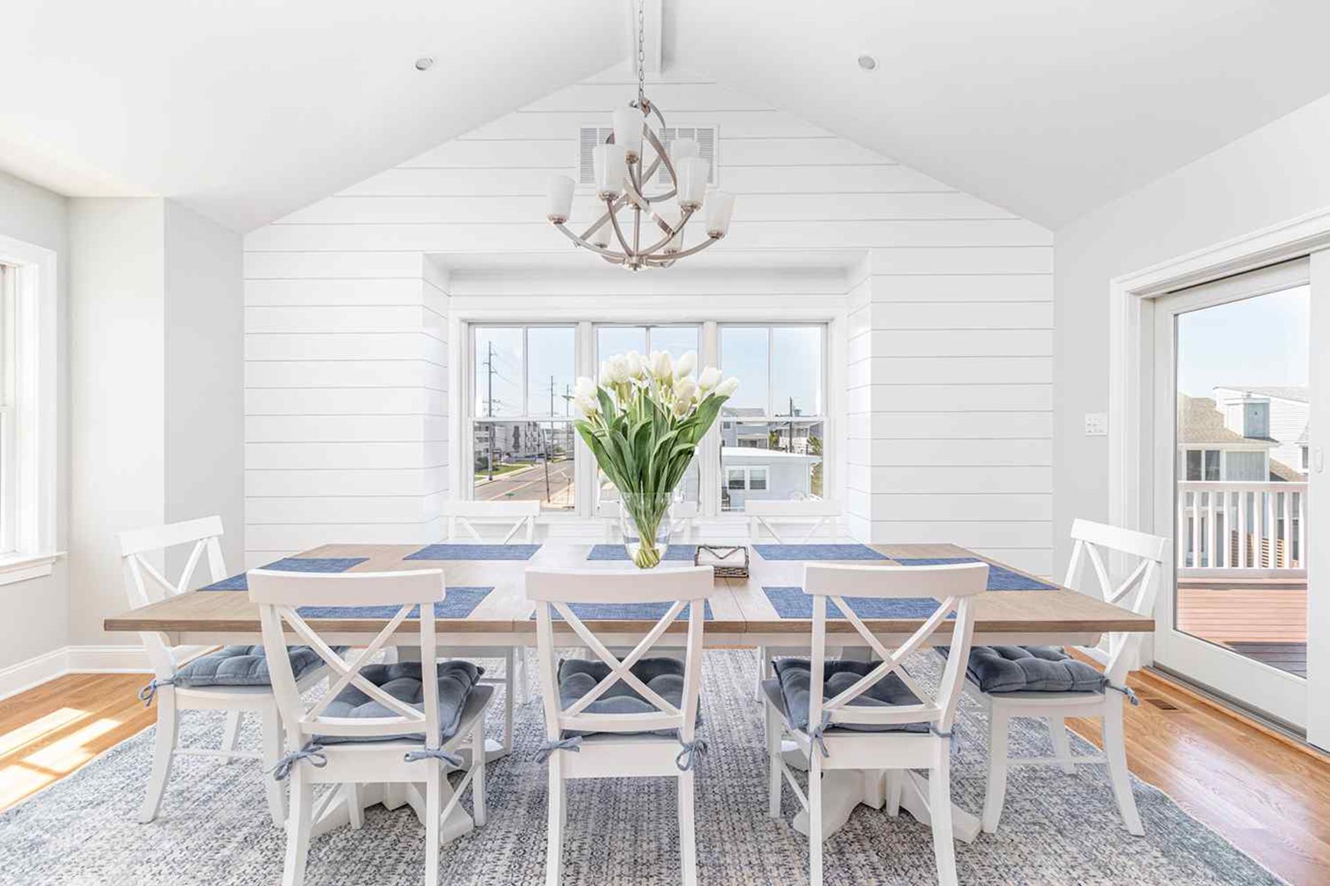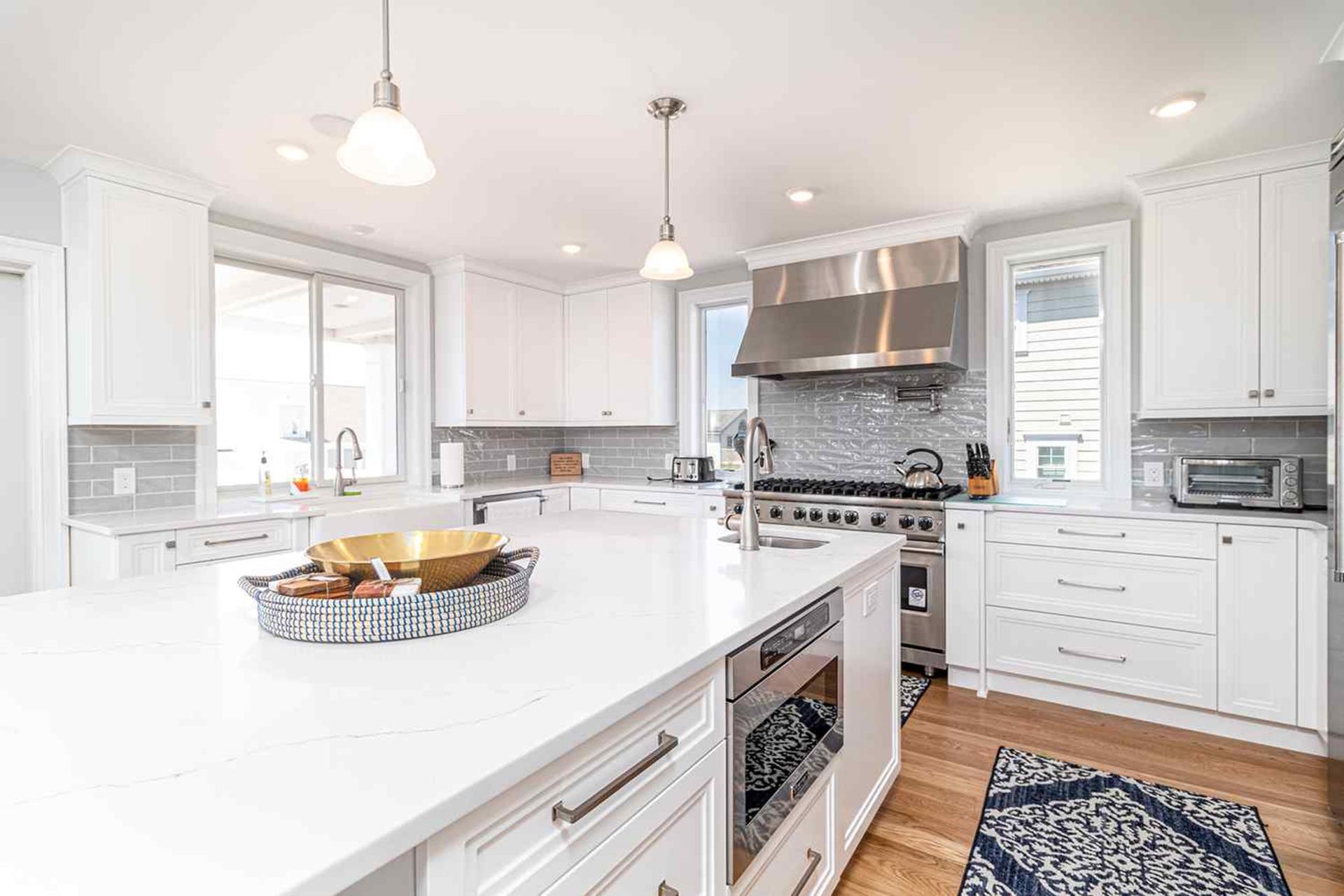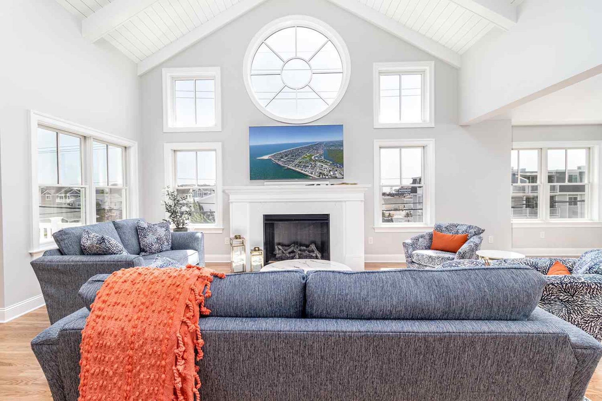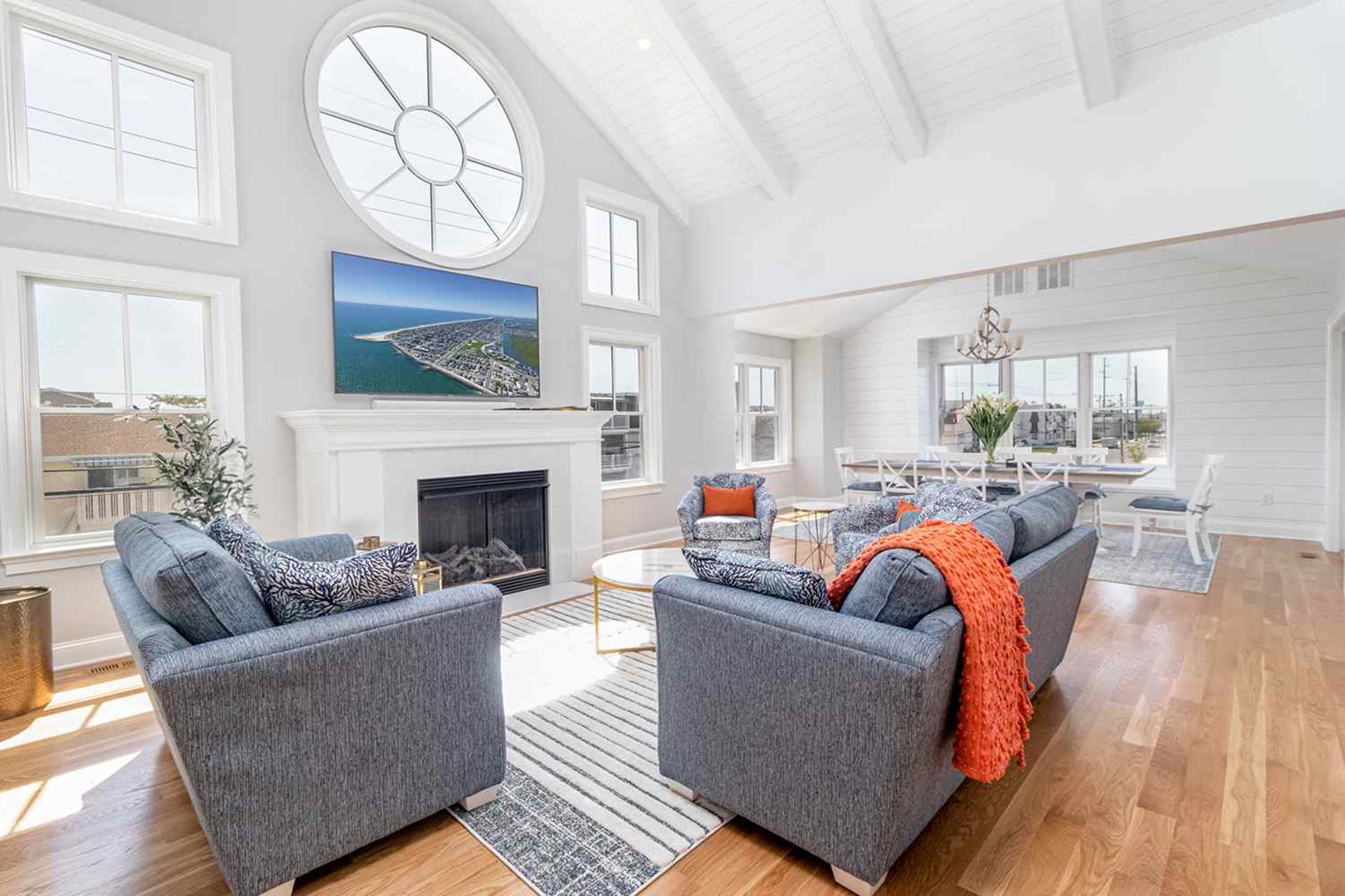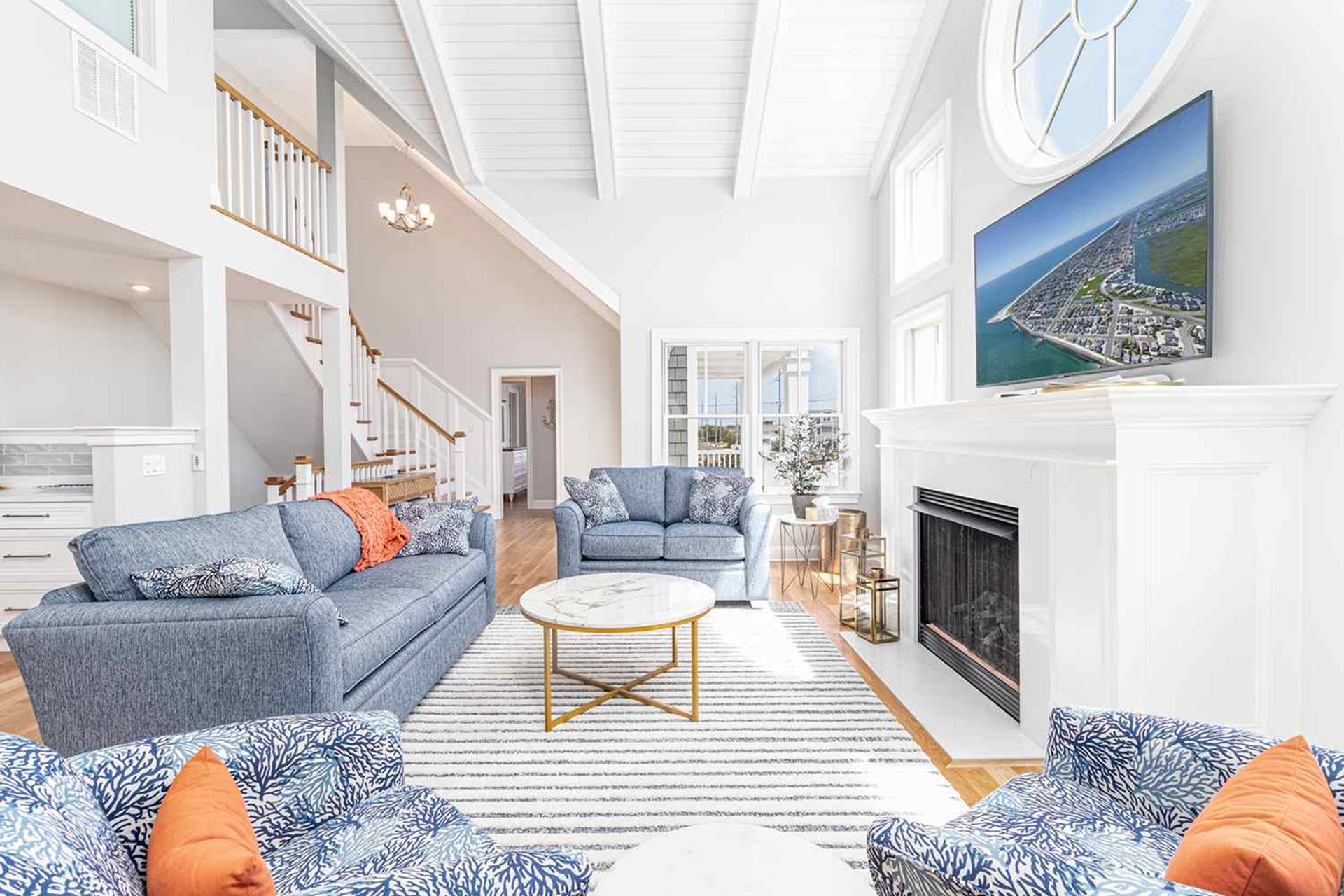 Ascend to the second floor to be greeted with the living area with cathedral ceilings, couch and love seat in living room accented by two swivel chairs and centered with a wood coffee table. Living room outfitted with 75" QLED Smart Flat Screen TV . Dining area with large dining table to sit 10-12. The deck off living area features table for outside dinging. The custom and gourmet kitchen has white quartz countertops, white cabinetry, oversized kitchen island and seating for four (also island with microwave, dishwasher, beverage fridge and cabinets for storage), farmhouse sink with industrial type faucet, Viking appliances with 48 eight burner gas range with pot filler, large pantry and 42" side by side refrigerator.