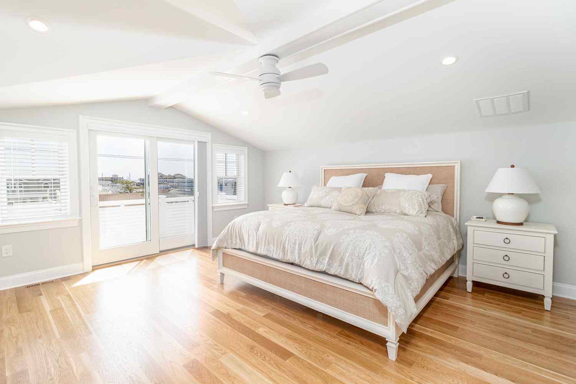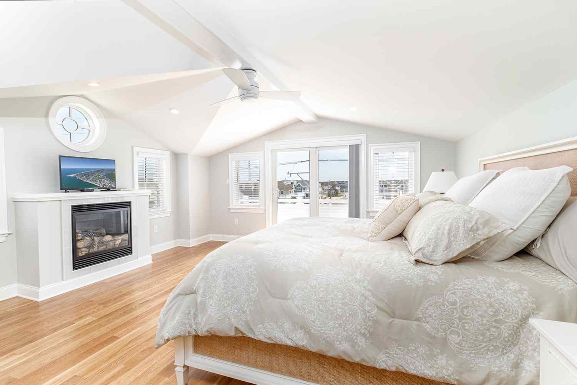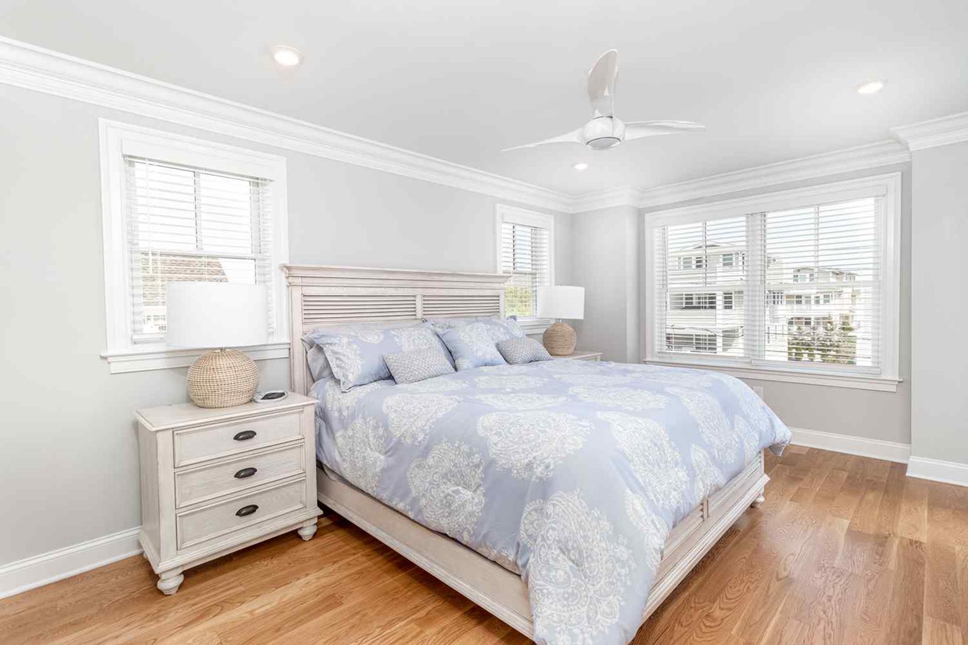 The third floor boasts the last 2 bedrooms of this 7 bedroom home. The third floor bedroom with King bed with TV, private deck (special privacy screening rails) that is off the front of the house looking towards the beach, walk in custom closet and master bathroom with his and her quartz top vanities with double sinks and custom tiled flooring oversized 6 by 5 6 custom shower with dual heads and seat with frameless shower doors. The other bedroom being a Jr Master Suite with King size bed has access to second floor private deck, private bathroom.