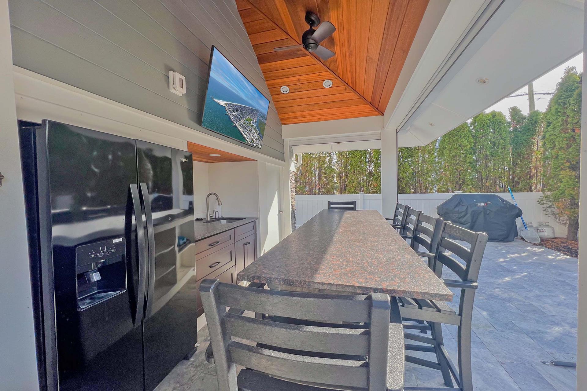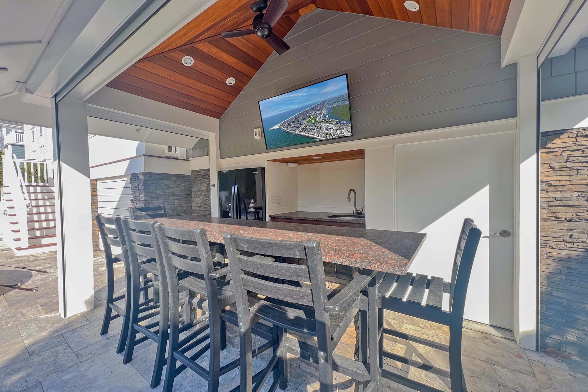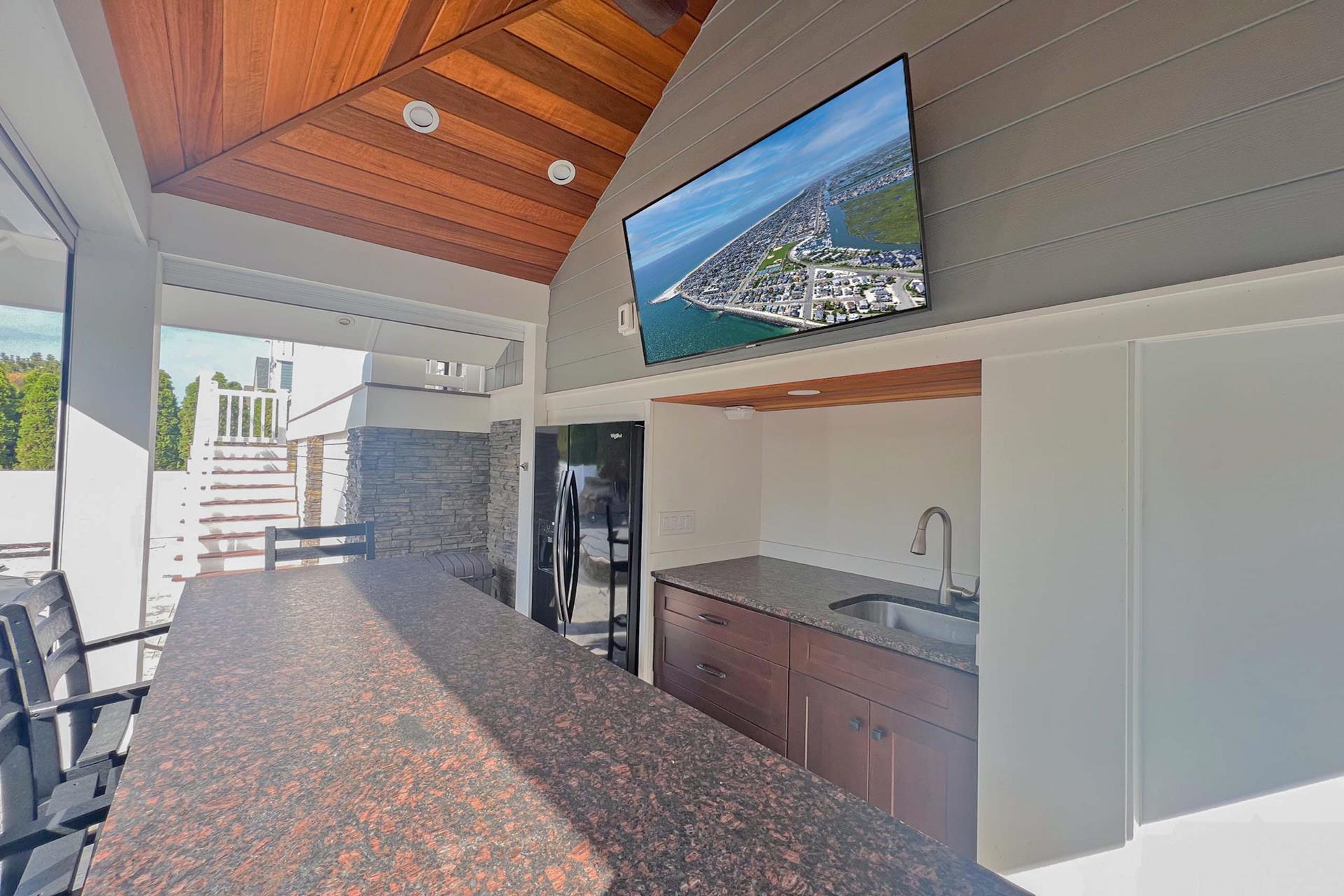 Enjoy the outside rear yard oasis. It is completely. private with 12 foot high arborvitae trees surrounding the back yard. The outdoor cabana bar (with leather look granite top) seats 6 people and has a outdoor 55 QLED SMART television, sink and out door refrigerator to entertain all day long. Six separate decks Spiral staircase connecting rear 1st floor deck to 2nd floor deck creating easy access from kitchen to pool. Two separate outdoor 5 wide x 3 8 deep showers stalls/ changing areas. |