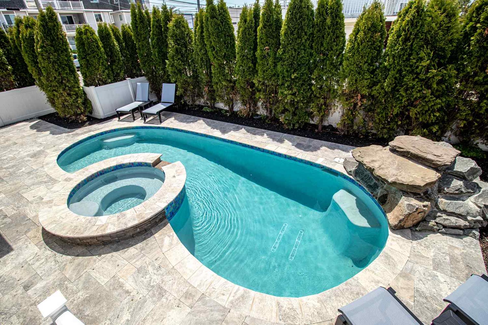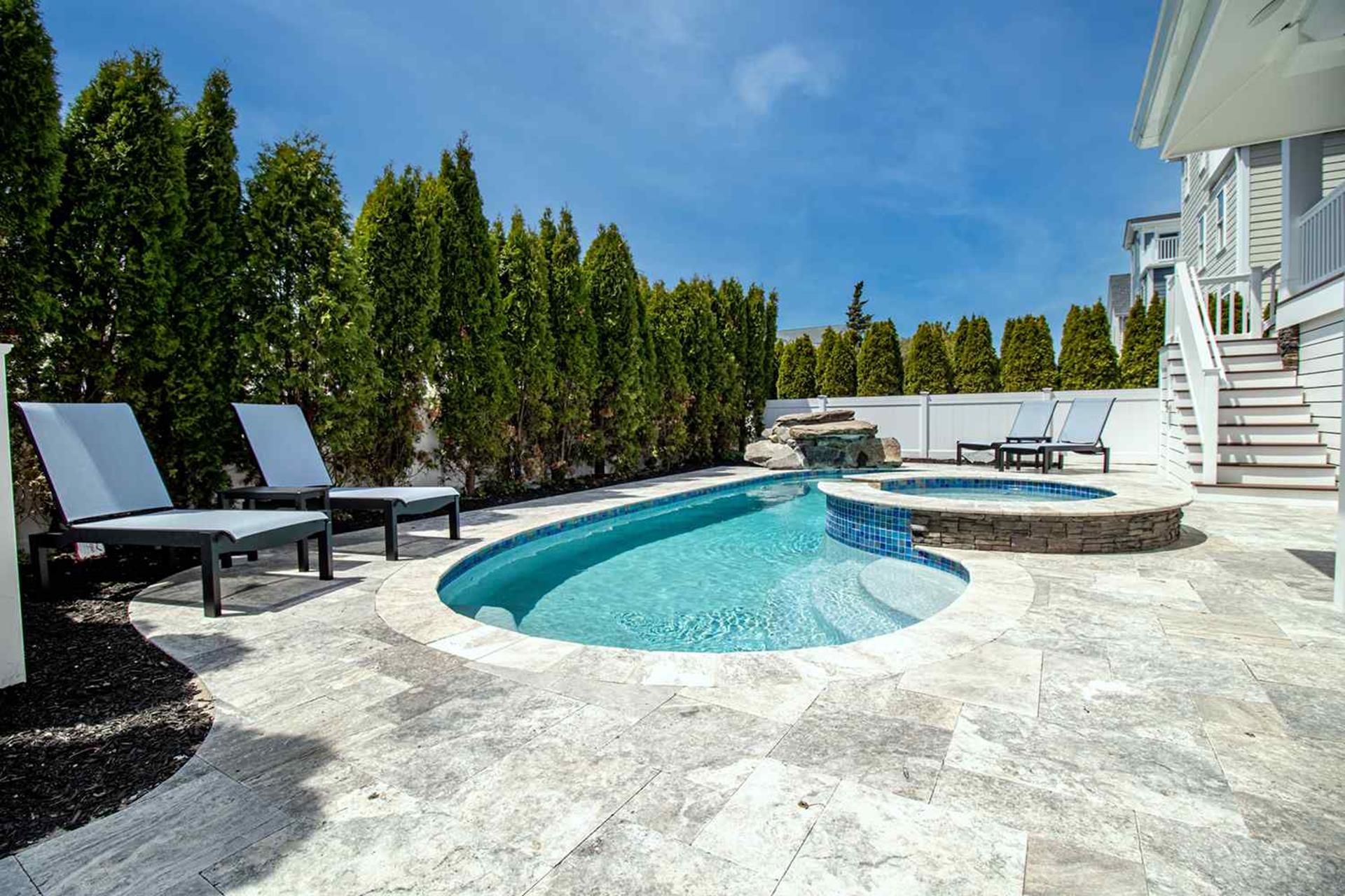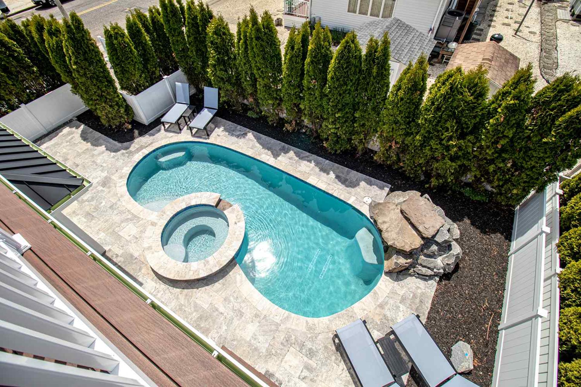 Enjoy the outside rear yard oasis. It is completely. private with 12 foot high arborvitae trees surrounding the back yard. The outdoor cabana bar (with leather look granite top) seats 6 people and has a outdoor 55 QLED SMART television, sink and out door refrigerator to entertain all day long. Six separate decks Spiral staircase connecting rear 1st floor deck to 2nd floor deck creating easy access from kitchen to pool. Two separate outdoor 5 wide x 3 8 deep showers stalls/ changing areas. |