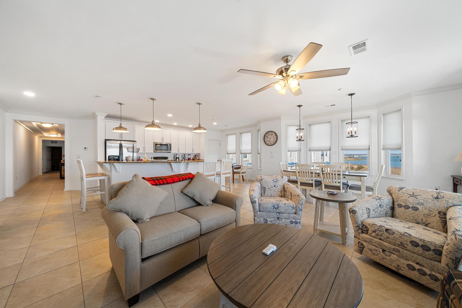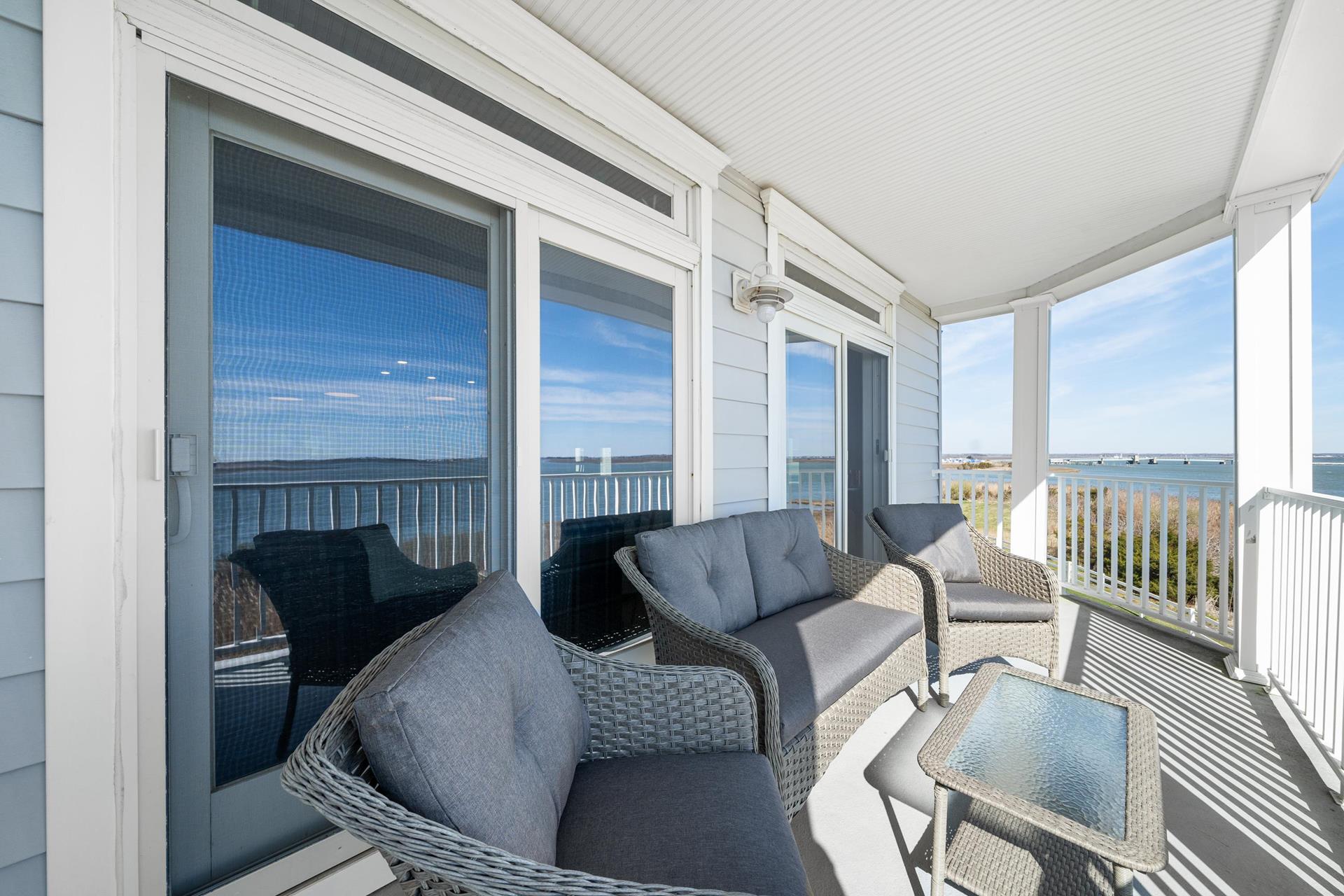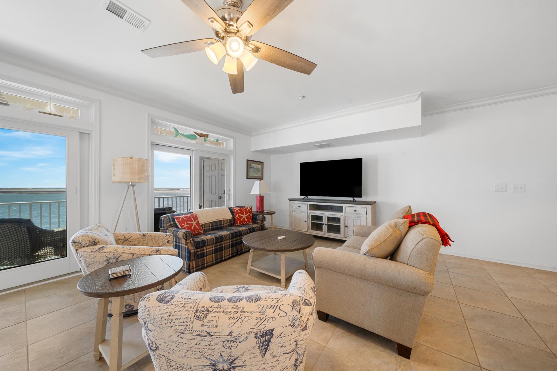 | WATER VIEWS ABOUND !!! The most talked about water view complexes in the area that has all the amenities with no crowds. The Tides At Seaboard Point is located on its own private location over looking the bay, inlet, beaches and ocean along with tennis, pickle ball, gym, billiards room, club house and large pool and jacuzzi area. There are 3 large commercial BBQ grills next to the club house. This 3 bedroom 2 bath 2nd floor corner unit is over 2,000 square feet with 9ft ceilings and is spacious for the large families with windows that have constant panoramic water views. Two elevators in the building and the unit is all on one floor, no stairs to deal with. The huge kitchen, dining area and living room allow for the whole family and guests to comfortably spread out because of its size. Enjoy the back deck facing the water and watch all the wonderful sites including dolphins who frequent the inlet and bay in the late afternoon and early evening. A short drive to fine dining and many of the shores famous attractions. |