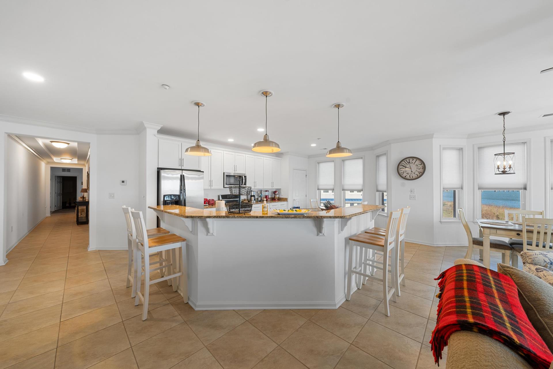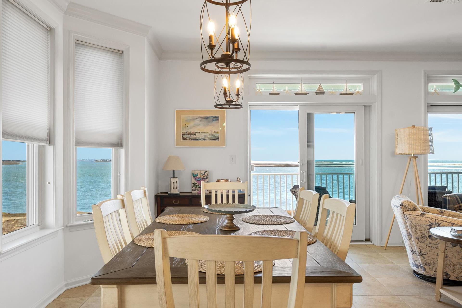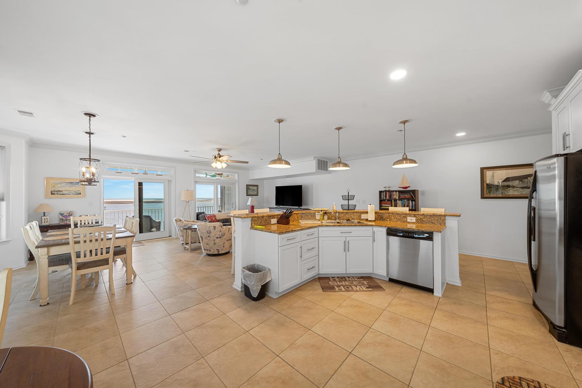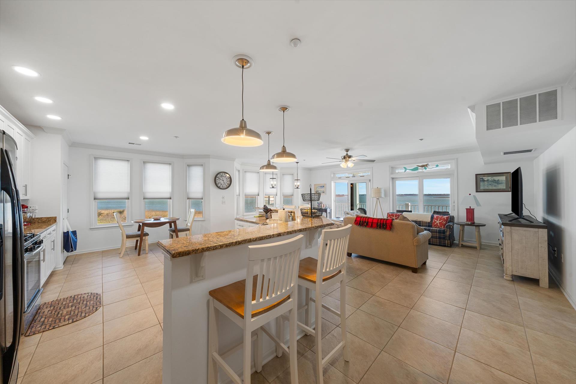 | WATER VIEWS ABOUND !!! The most talked about water view complexes in the area that has all the amenities with no crowds. The Tides At Seaboard Point is located on its own private location over looking the bay, inlet, beaches and ocean along with tennis, pickle ball, gym, billiards room, club house and large pool and jacuzzi area. There are 3 large commercial BBQ grills next to the club house. This 3 bedroom 2 bath 2nd floor corner unit is over 2,000 square feet with 9ft ceilings and is spacious for the large families with windows that have constant panoramic water views. Two elevators in the building and the unit is all on one floor, no stairs to deal with. The huge kitchen, dining area and living room allow for the whole family and guests to comfortably spread out because of its size. Enjoy the back deck facing the water and watch all the wonderful sites including dolphins who frequent the inlet and bay in the late afternoon and early evening. A short drive to fine dining and many of the shores famous attractions. |