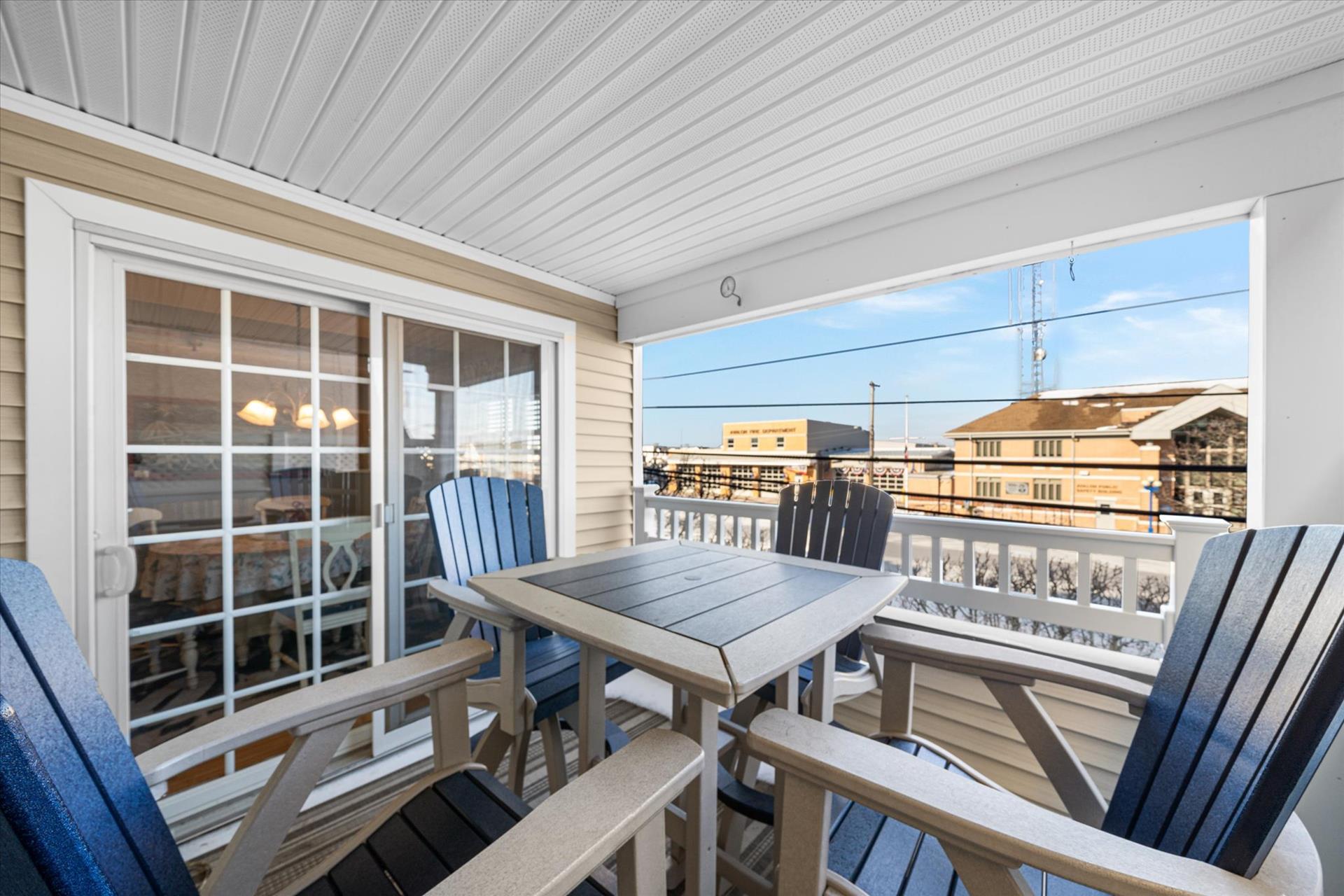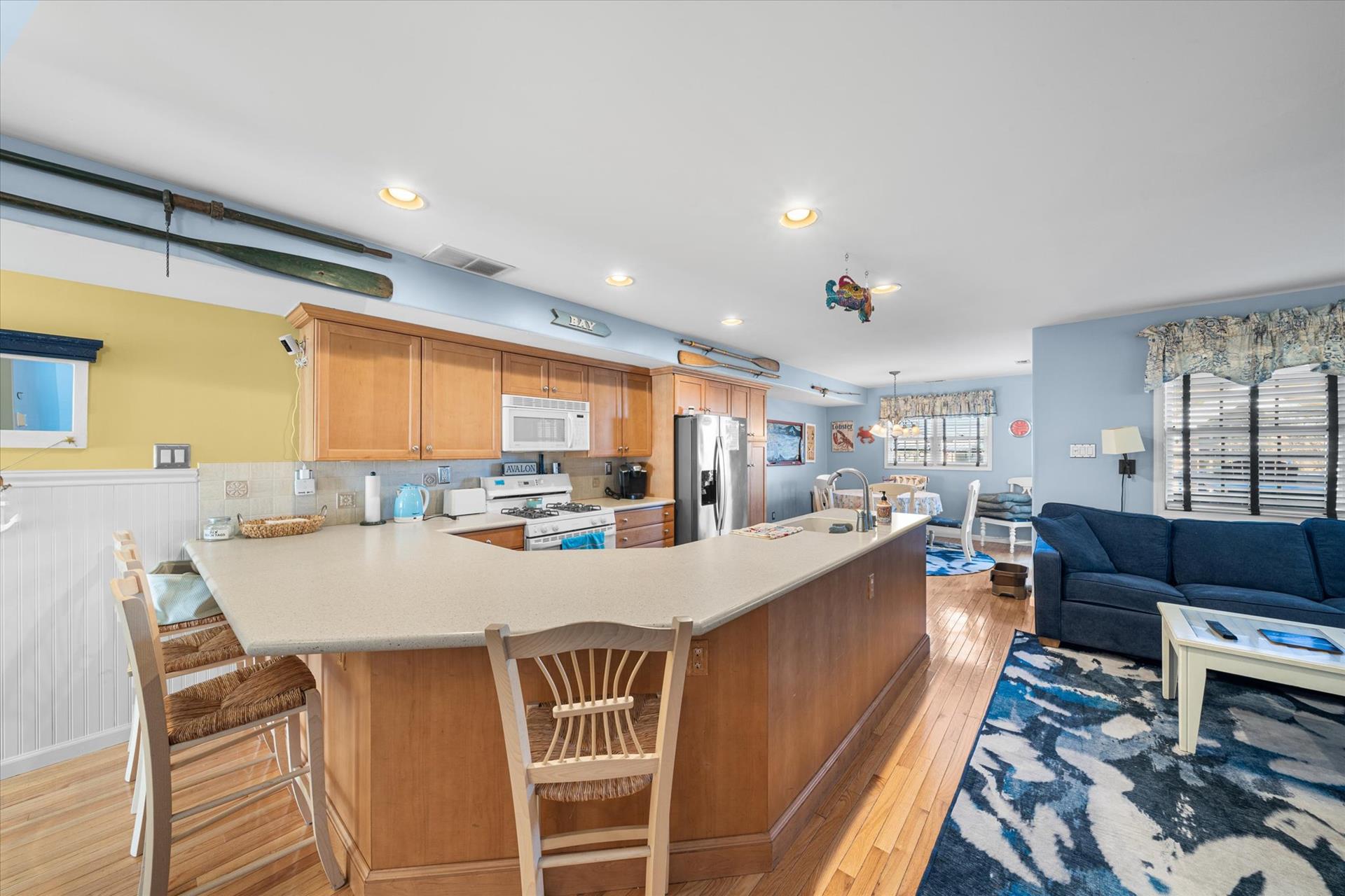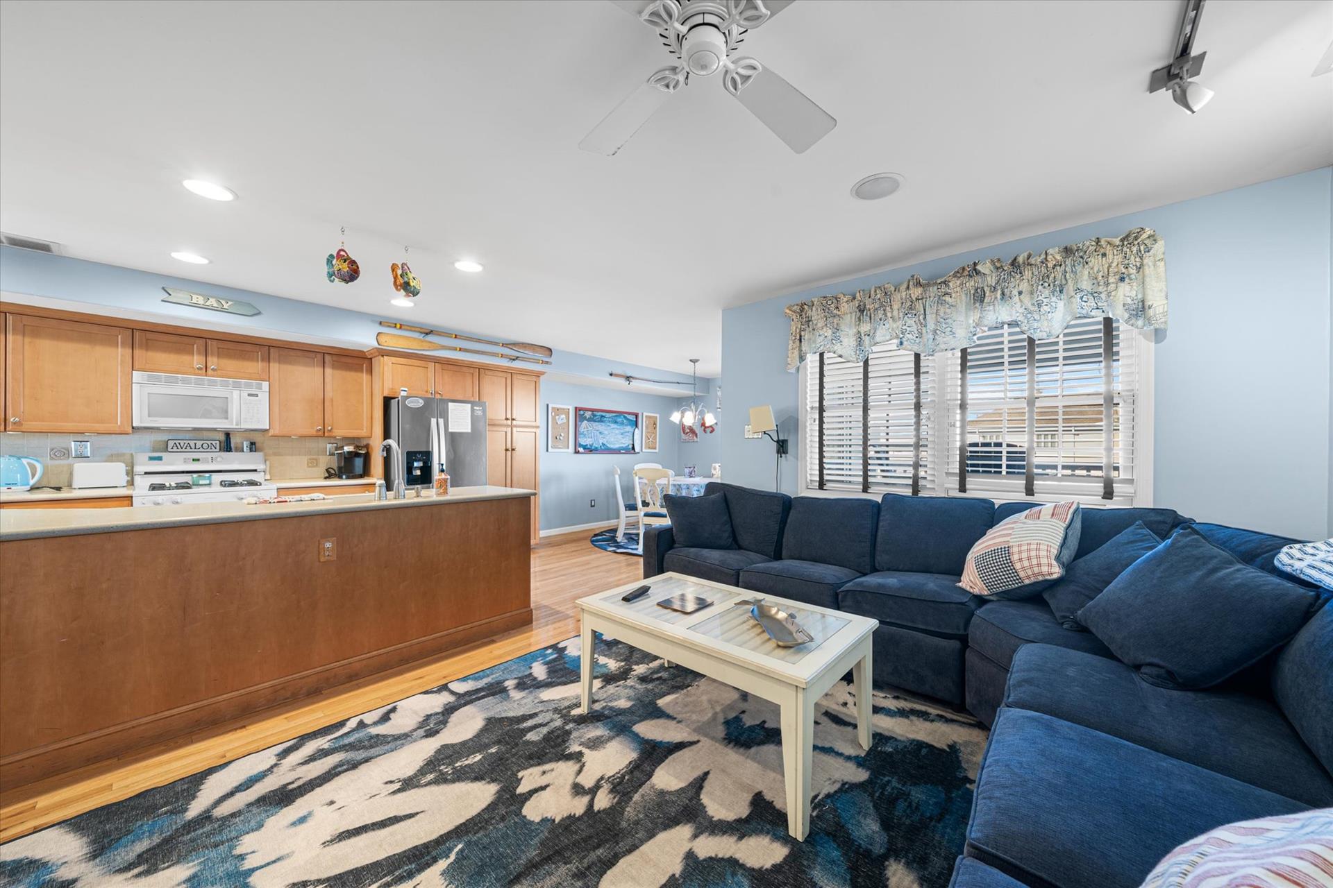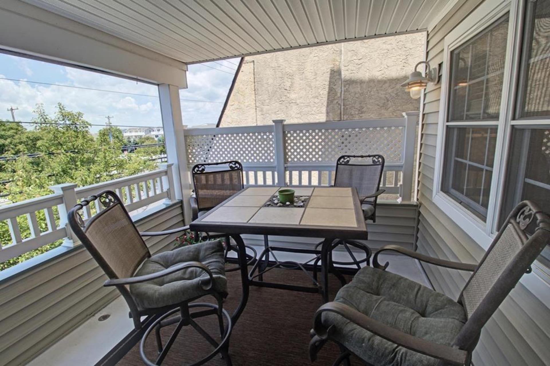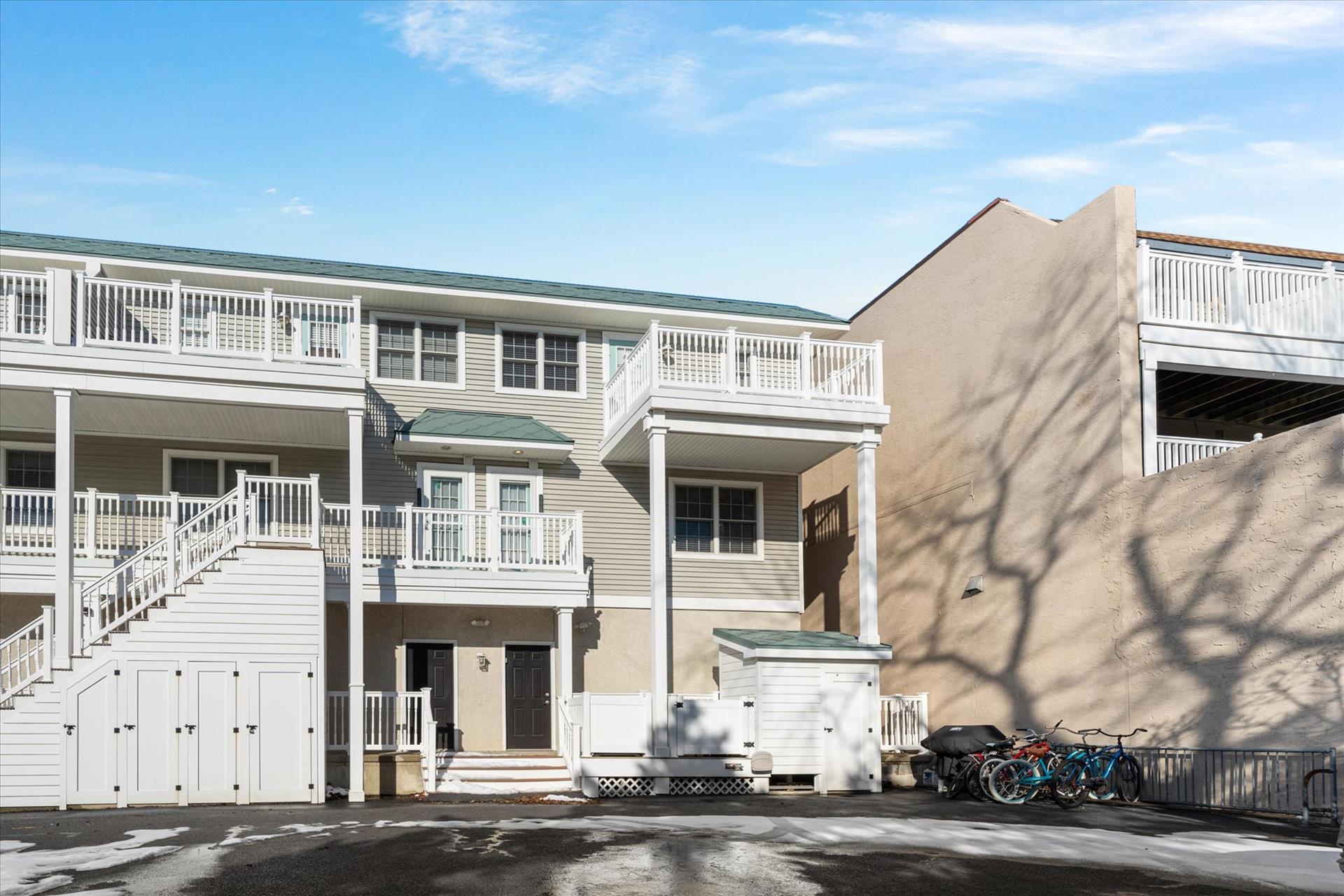 | Discover this charming 3-bedroom, 3-bathroom townhome, nestled just two blocks away from the beach and conveniently situated in the heart of town. With parking convenience and a walkable location, this second and third floor residence boasts hardwood floors and an inviting open floor plan. The spacious kitchen features a breakfast bar and sleek Corian countertops, while the dining room offers a cozy round table and sliders leading to the deck area. On the first floor, find a bedroom with a single sized bed as well as a BUNK BED (single on top; double on bottom) with access to a full bath, complementing the open living area. Upstairs, a junior master suite (Queen bed) with a private bath and access to an east-facing deck awaits, alongside the main master suite (King size bed) with its own full bath. Decorated with care and fully equipped for your summer getaway, this unit also includes one assigned parking spot. Updates completed within the past few years include new carpeting, a plush new couch, a 55-inch TV, and refreshed vinyl siding for the showers in the backyard. Disclosure: Living Area TV includes cable, first floor bedroom TV is streaming only. |