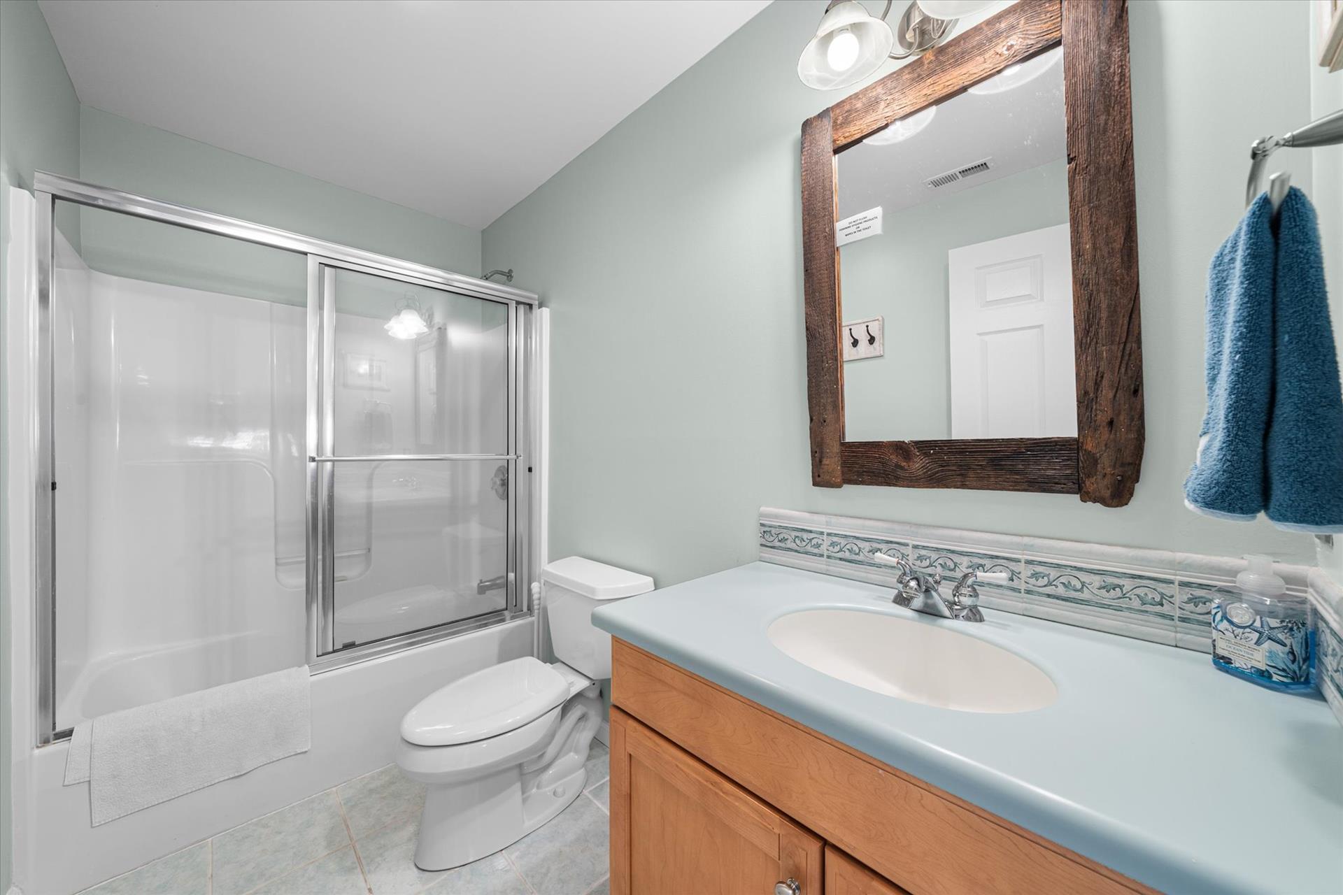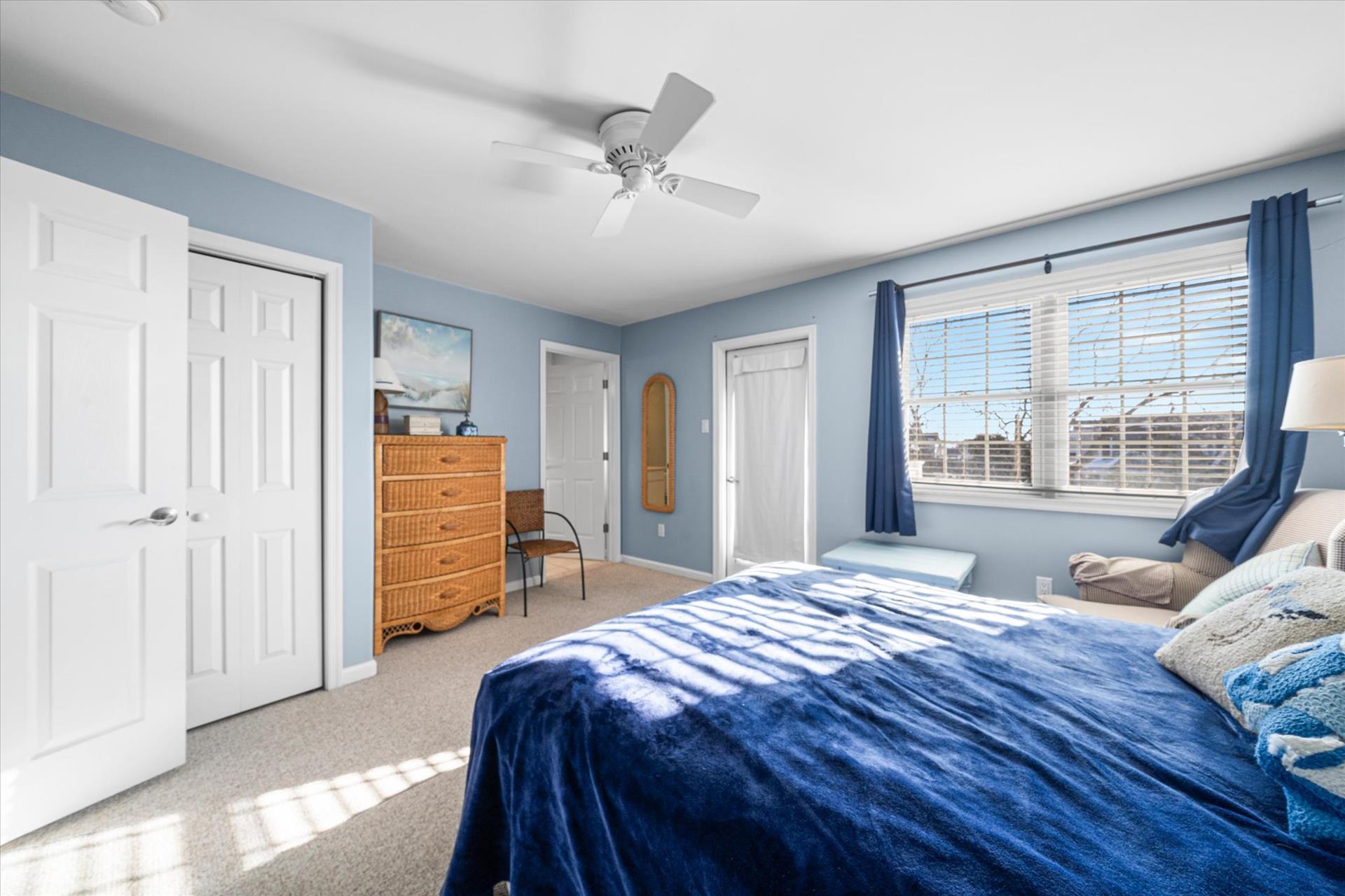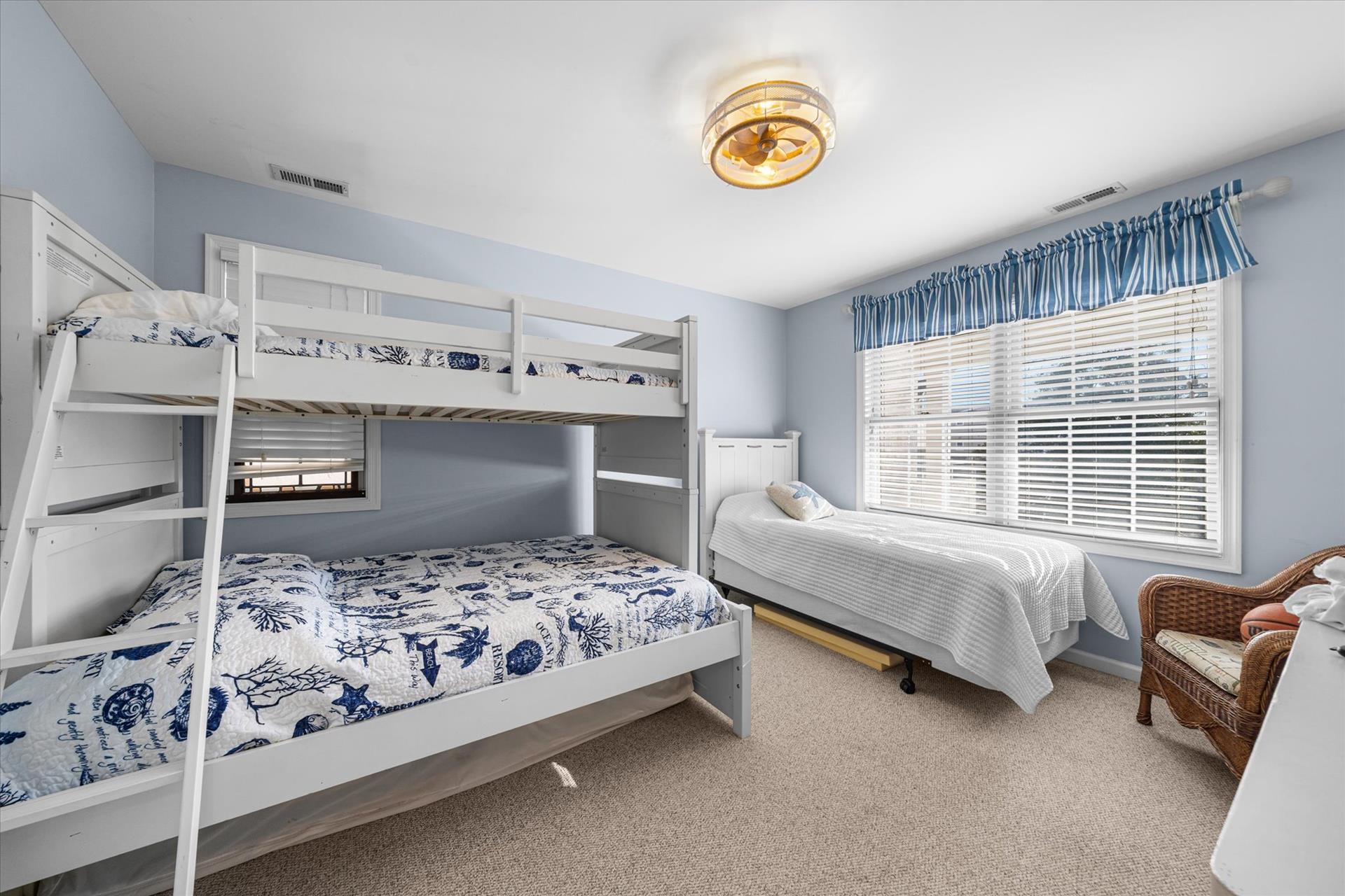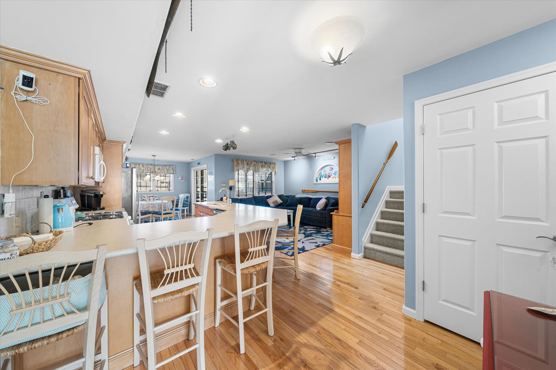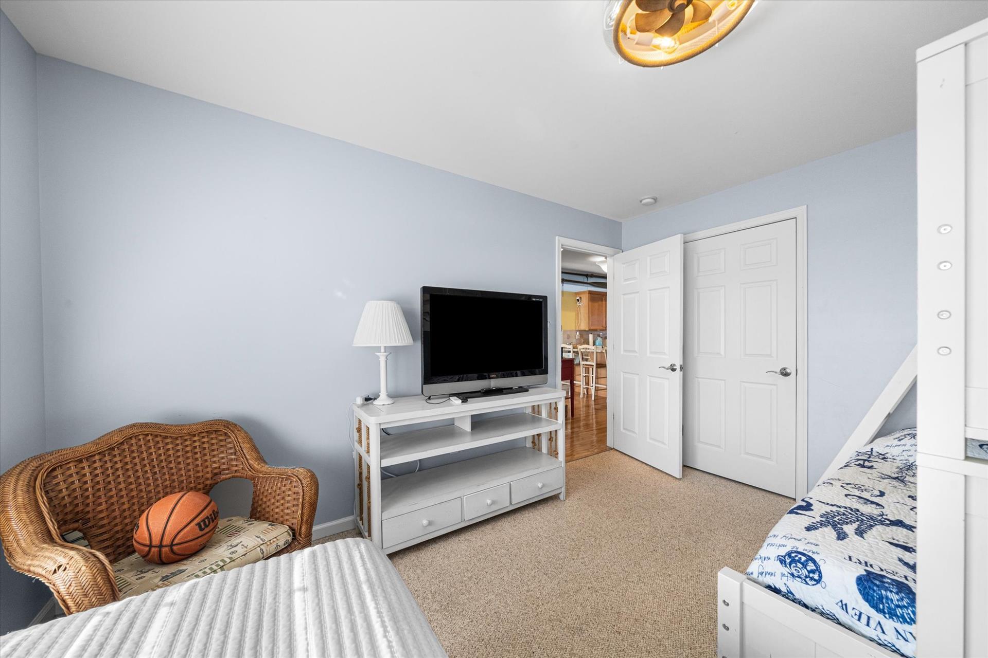 | Discover this charming 3-bedroom, 3-bathroom townhome, nestled just two blocks away from the beach and conveniently situated in the heart of town. With parking convenience and a walkable location, this second and third floor residence boasts hardwood floors and an inviting open floor plan. The spacious kitchen features a breakfast bar and sleek Corian countertops, while the dining room offers a cozy round table and sliders leading to the deck area. On the first floor, find a bedroom with a single sized bed as well as a BUNK BED (single on top; double on bottom) with access to a full bath, complementing the open living area. Upstairs, a junior master suite (Queen bed) with a private bath and access to an east-facing deck awaits, alongside the main master suite (King size bed) with its own full bath. Decorated with care and fully equipped for your summer getaway, this unit also includes one assigned parking spot. Updates completed within the past few years include new carpeting, a plush new couch, a 55-inch TV, and refreshed vinyl siding for the showers in the backyard. Disclosure: Living Area TV includes cable, first floor bedroom TV is streaming only. |