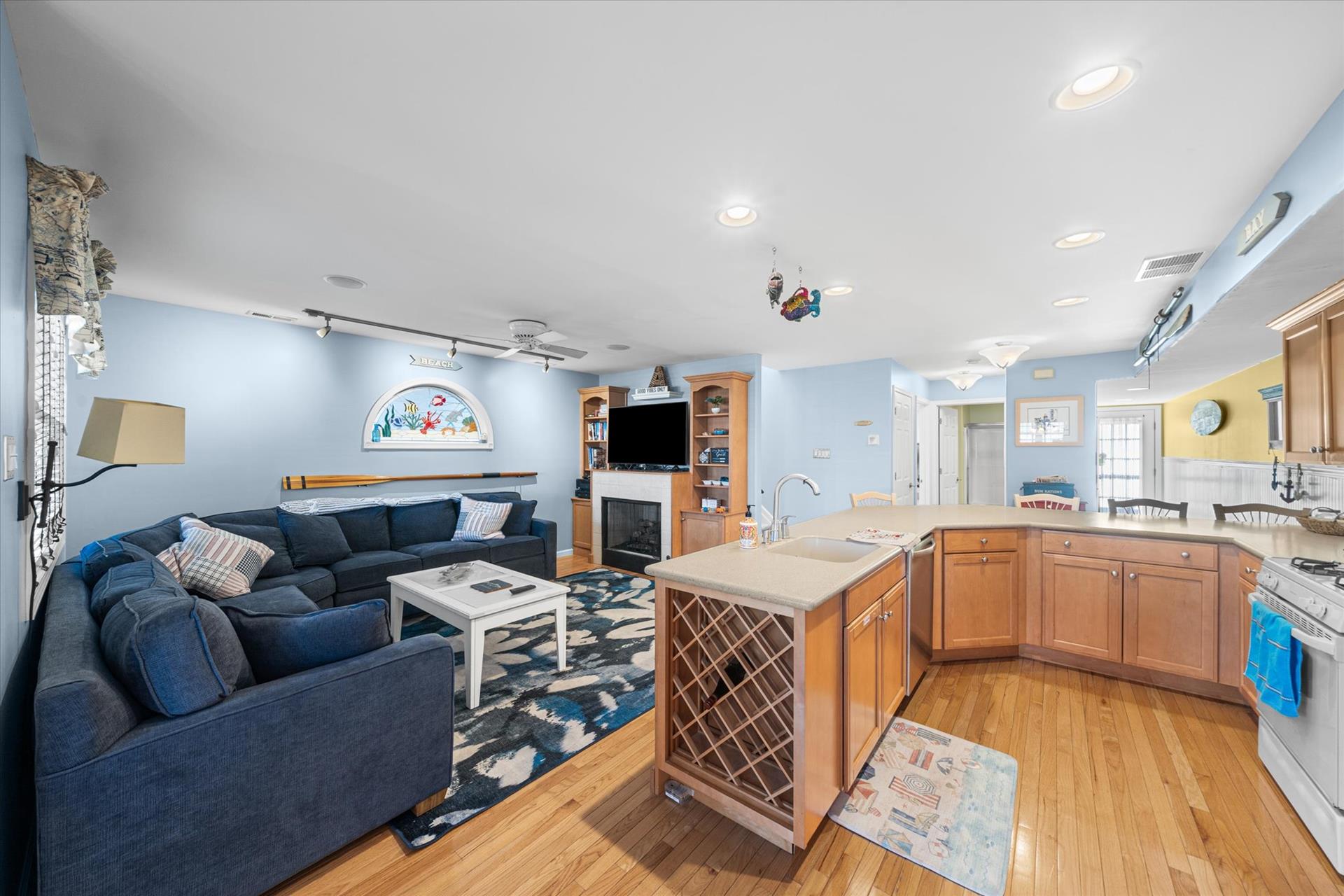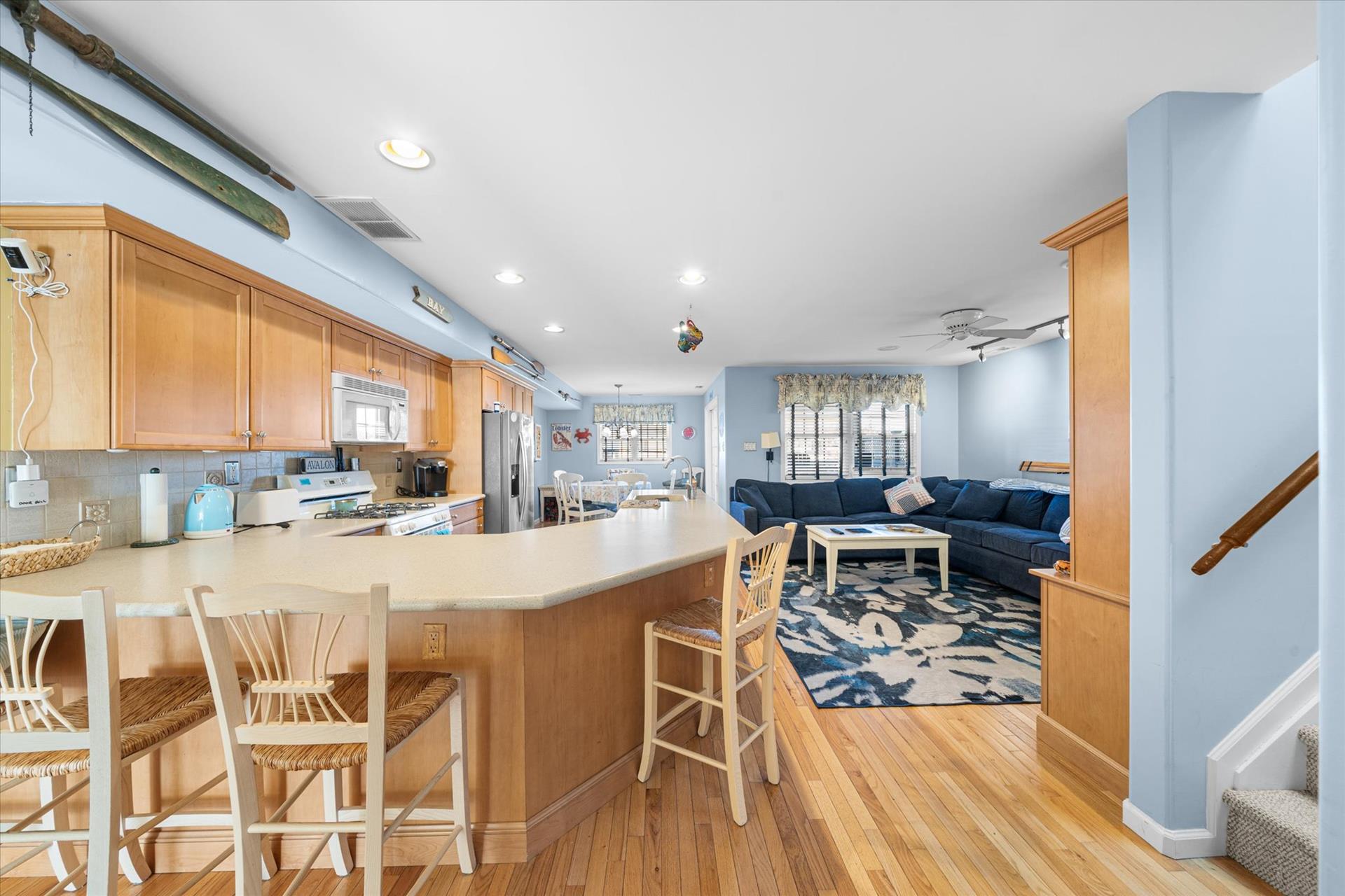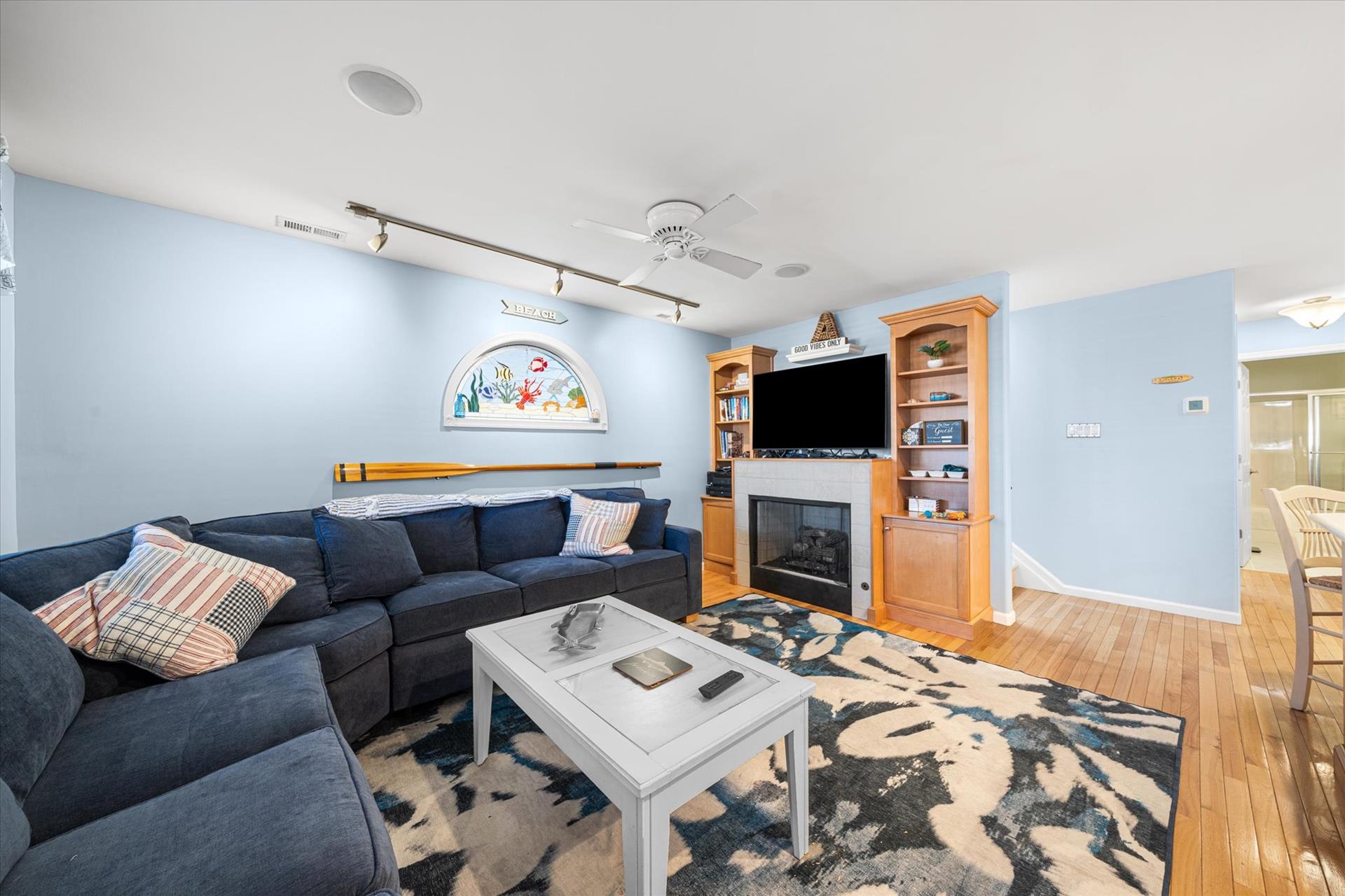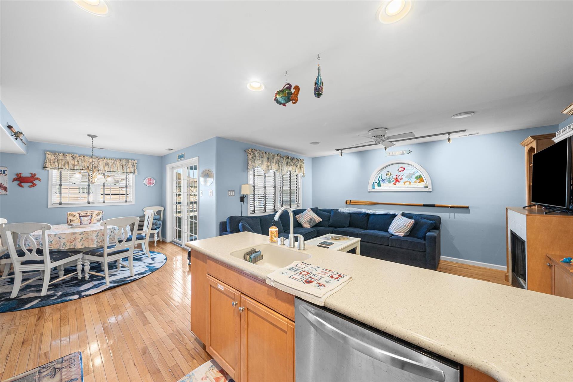 | Discover this charming 3-bedroom, 3-bathroom townhome, nestled just two blocks away from the beach and conveniently situated in the heart of town. With parking convenience and a walkable location, this second and third floor residence boasts hardwood floors and an inviting open floor plan. The spacious kitchen features a breakfast bar and sleek Corian countertops, while the dining room offers a cozy round table and sliders leading to the deck area. On the first floor, find a bedroom with a single sized bed as well as a BUNK BED (single on top; double on bottom) with access to a full bath, complementing the open living area. Upstairs, a junior master suite (Queen bed) with a private bath and access to an east-facing deck awaits, alongside the main master suite (King size bed) with its own full bath. Decorated with care and fully equipped for your summer getaway, this unit also includes one assigned parking spot. Updates completed within the past few years include new carpeting, a plush new couch, a 55-inch TV, and refreshed vinyl siding for the showers in the backyard. Disclosure: Living Area TV includes cable, first floor bedroom TV is streaming only. |