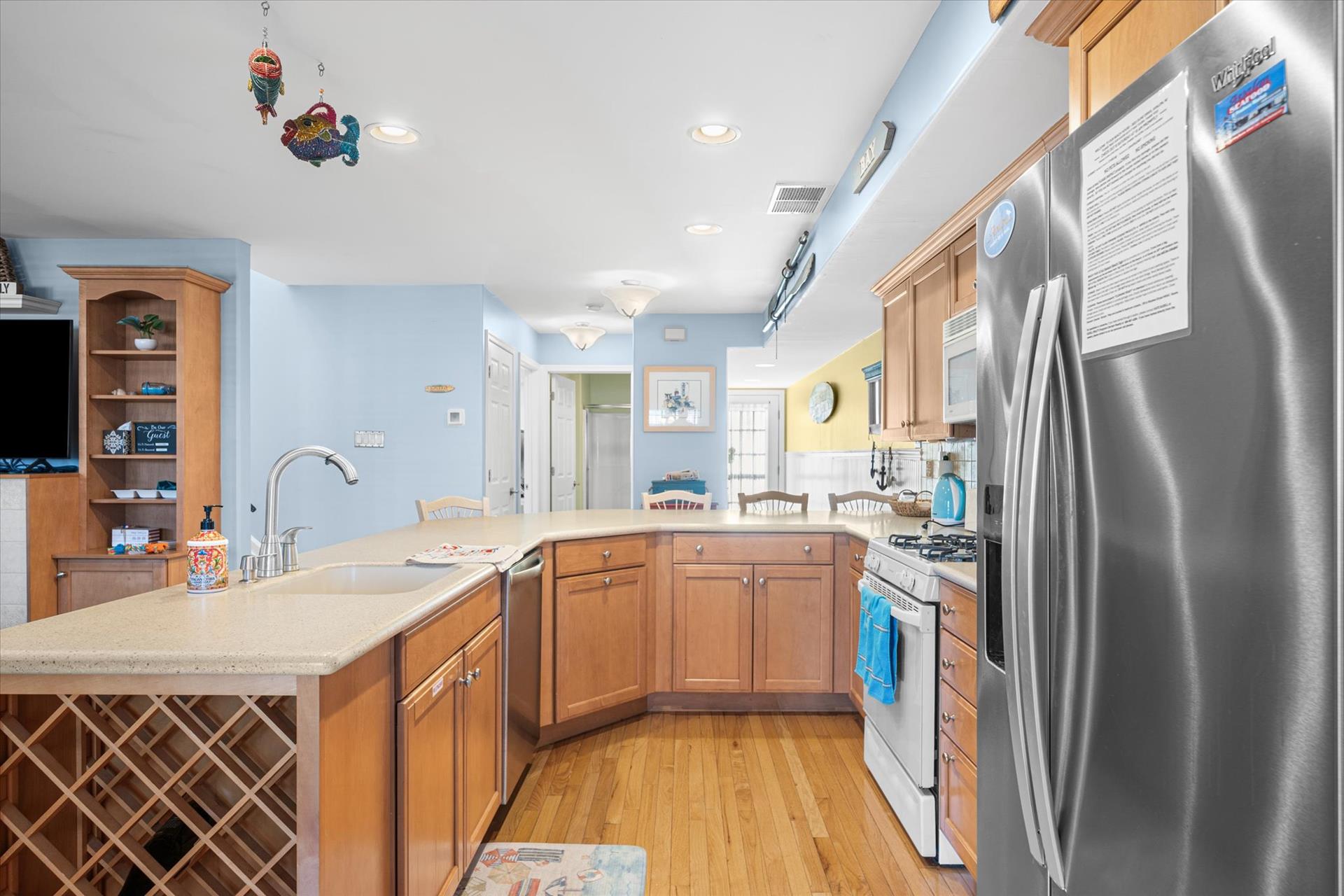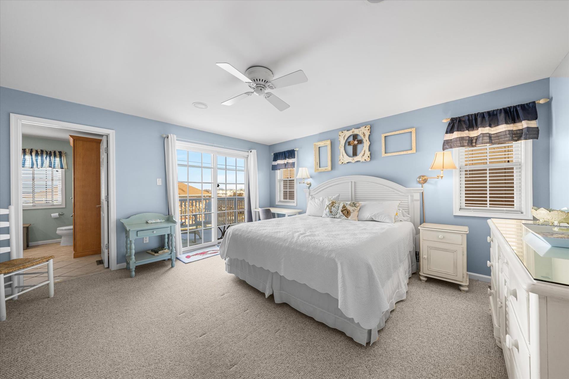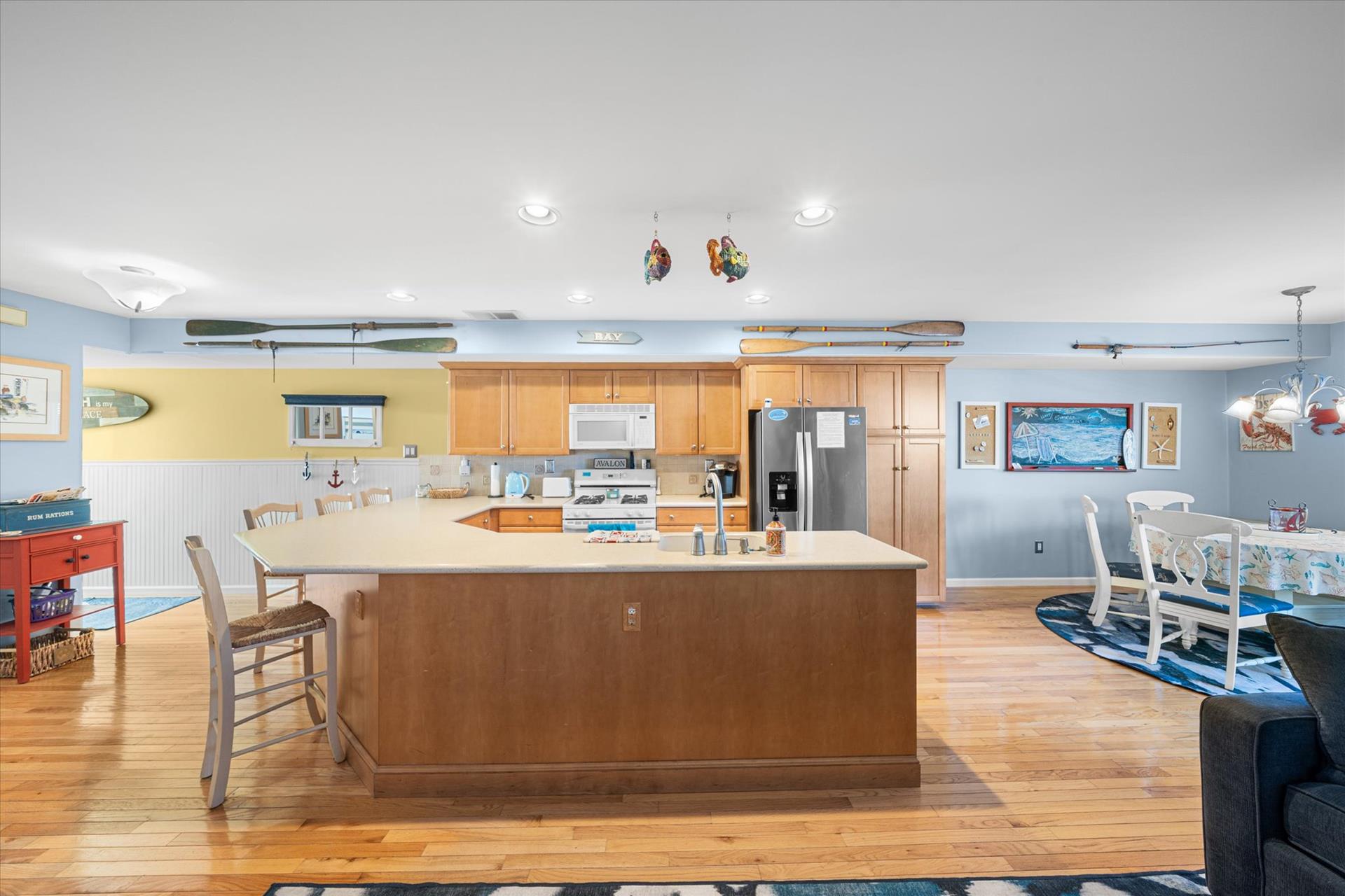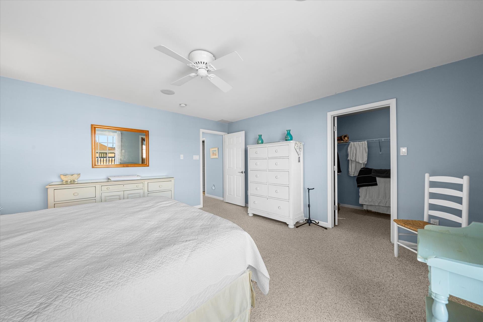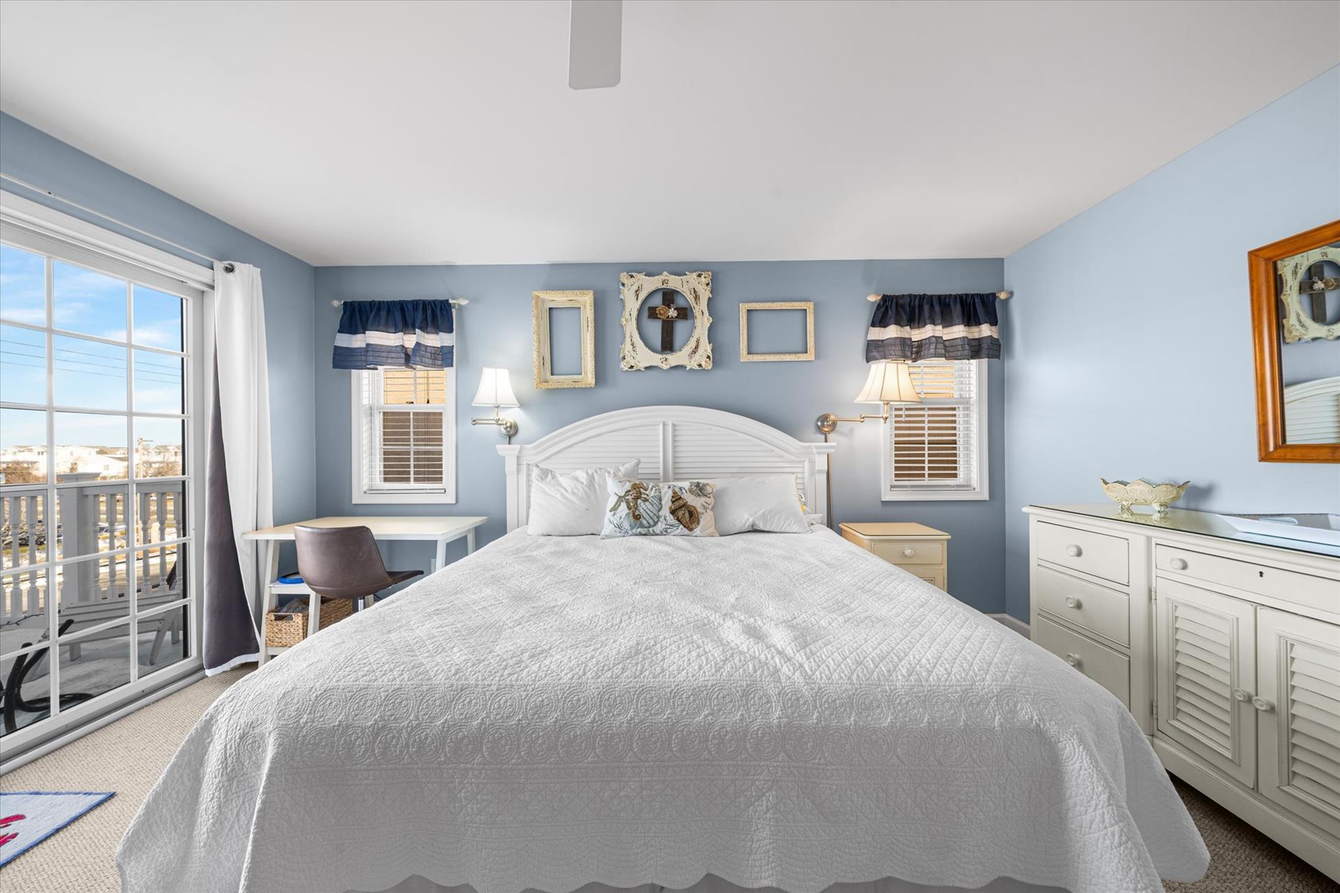 | Discover this charming 3-bedroom, 3-bathroom townhome, nestled just two blocks away from the beach and conveniently situated in the heart of town. With parking convenience and a walkable location, this second and third floor residence boasts hardwood floors and an inviting open floor plan. The spacious kitchen features a breakfast bar and sleek Corian countertops, while the dining room offers a cozy round table and sliders leading to the deck area. On the first floor, find a bedroom with a single sized bed as well as a BUNK BED (single on top; double on bottom) with access to a full bath, complementing the open living area. Upstairs, a junior master suite (Queen bed) with a private bath and access to an east-facing deck awaits, alongside the main master suite (King size bed) with its own full bath. Decorated with care and fully equipped for your summer getaway, this unit also includes one assigned parking spot. Updates completed within the past few years include new carpeting, a plush new couch, a 55-inch TV, and refreshed vinyl siding for the showers in the backyard. Disclosure: Living Area TV includes cable, first floor bedroom TV is streaming only. |