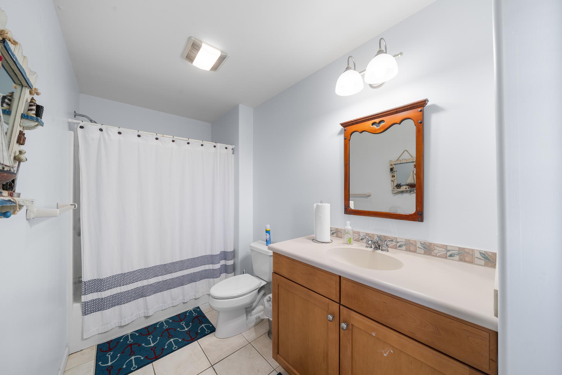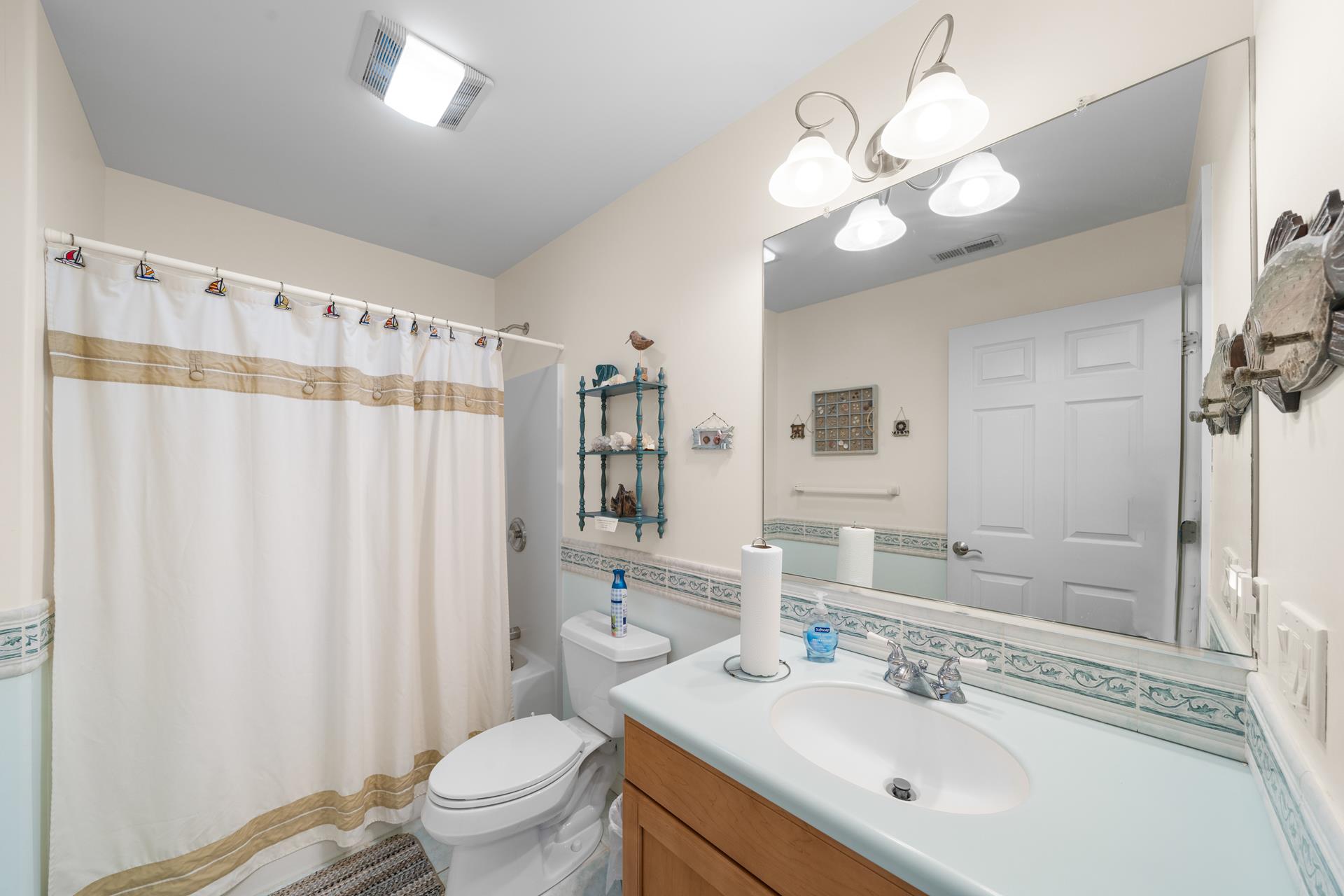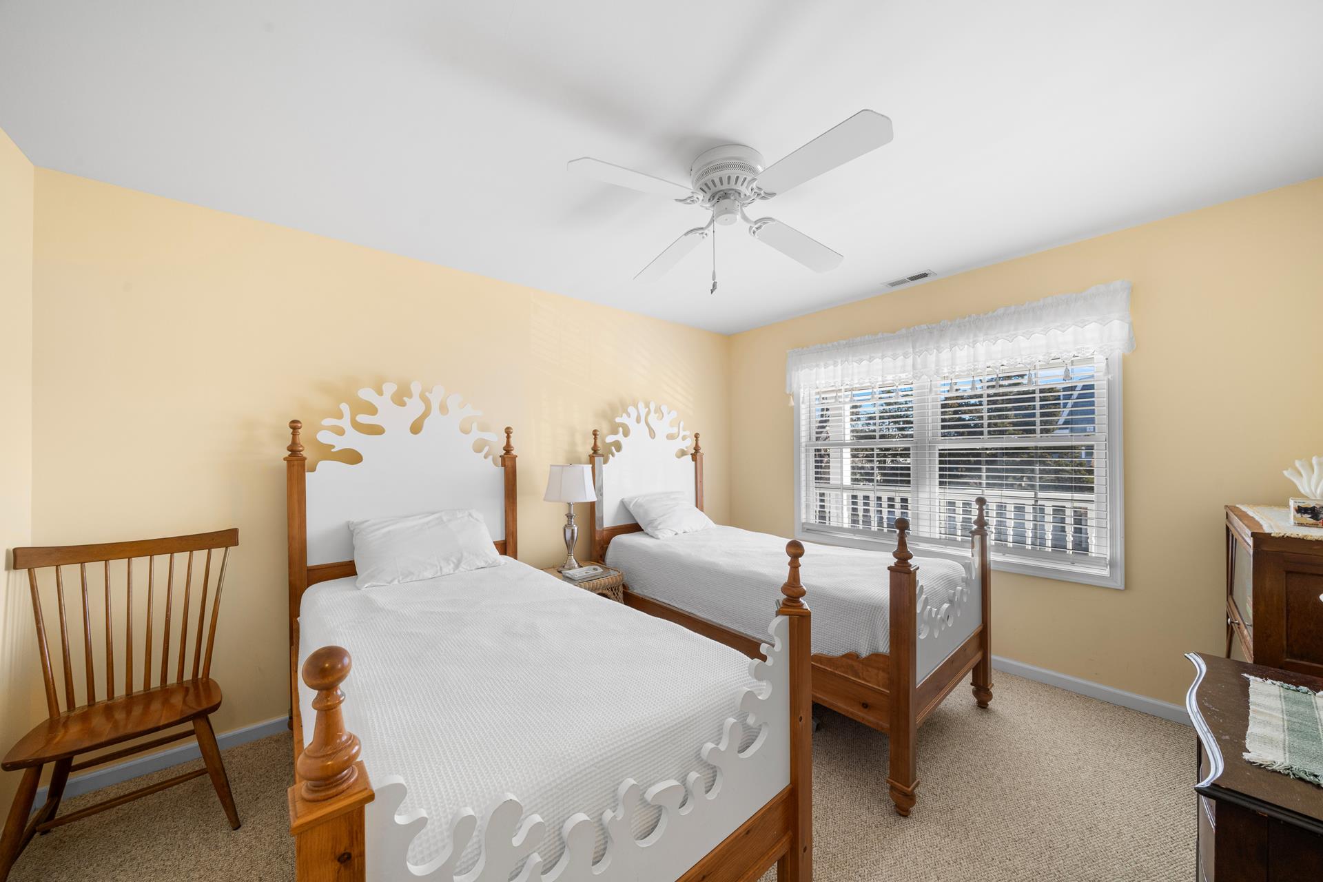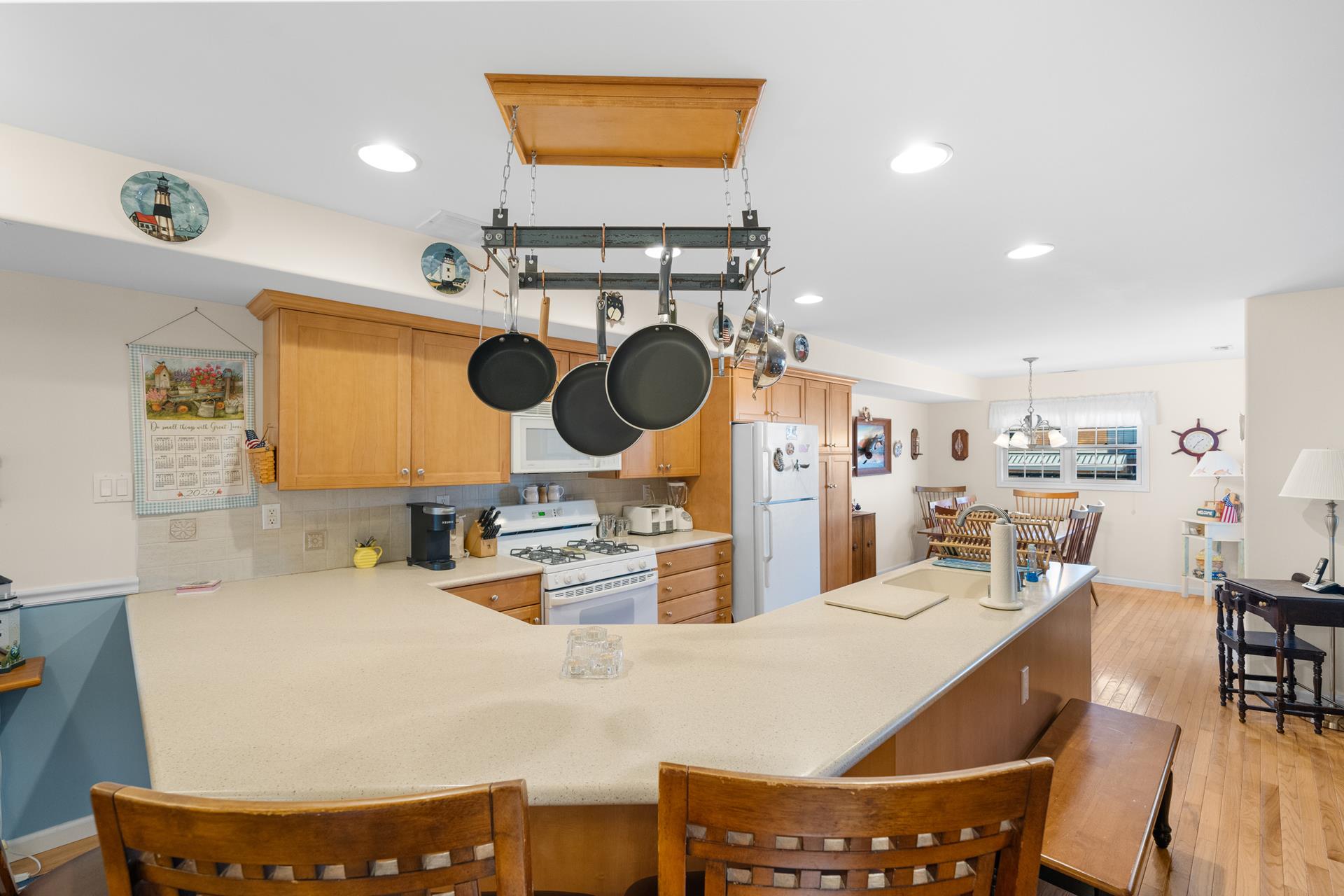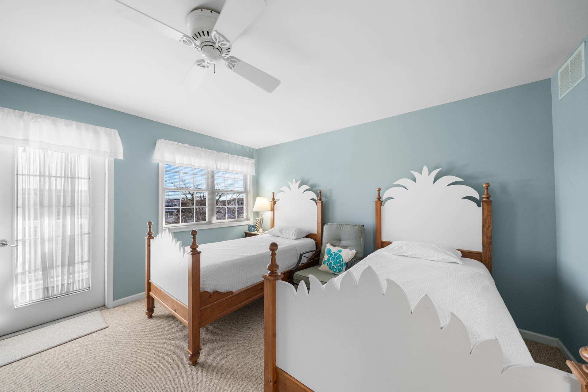 1st floor features - The kitchen offers an open, easygoing feel with an island, bar seating, and adorable coastal decor. The adjoining dining room comfortably seats six as well as a street side deck. There is a quaint living room featuring a cozy fireplace. The first bedroom has two twin beds and a full bathroom including a tub.