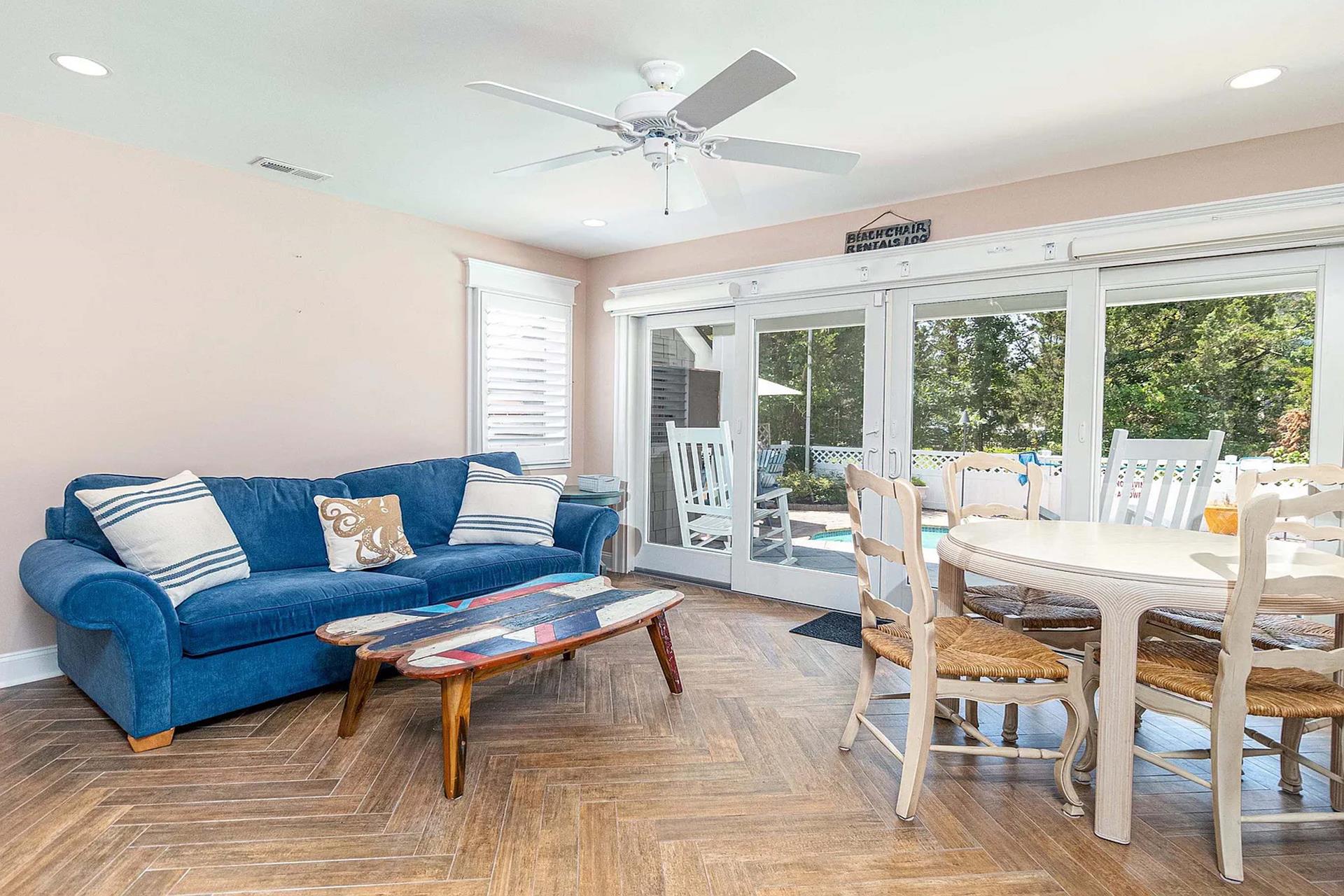 | 4 bedroom 3.5 bath home with pool. NEW PHOTOS WILL BE AVAILABLE IN January/February - Two first floor bedroom photos to be updated. The one bedroom will have a bunk with twin over queen towards the front of the house and the other bedroom in the rear of the house by the pool will have a bunk with full over queen with a trundle under it. The third first floor bedroom has king bed with ensuite bath. The first floor family room off the back of the home has a wet bar and heads out to a covered porch area to the pool area. Inside on the second floor is the Great Room area including the kitchen with center island. The 2nd floor also has a half bath and primary bedroom with king bed that has a large master bath and tiled walk-in shower. A short walk to the beach and short distance to town make this a coveted family area for generations to come. |