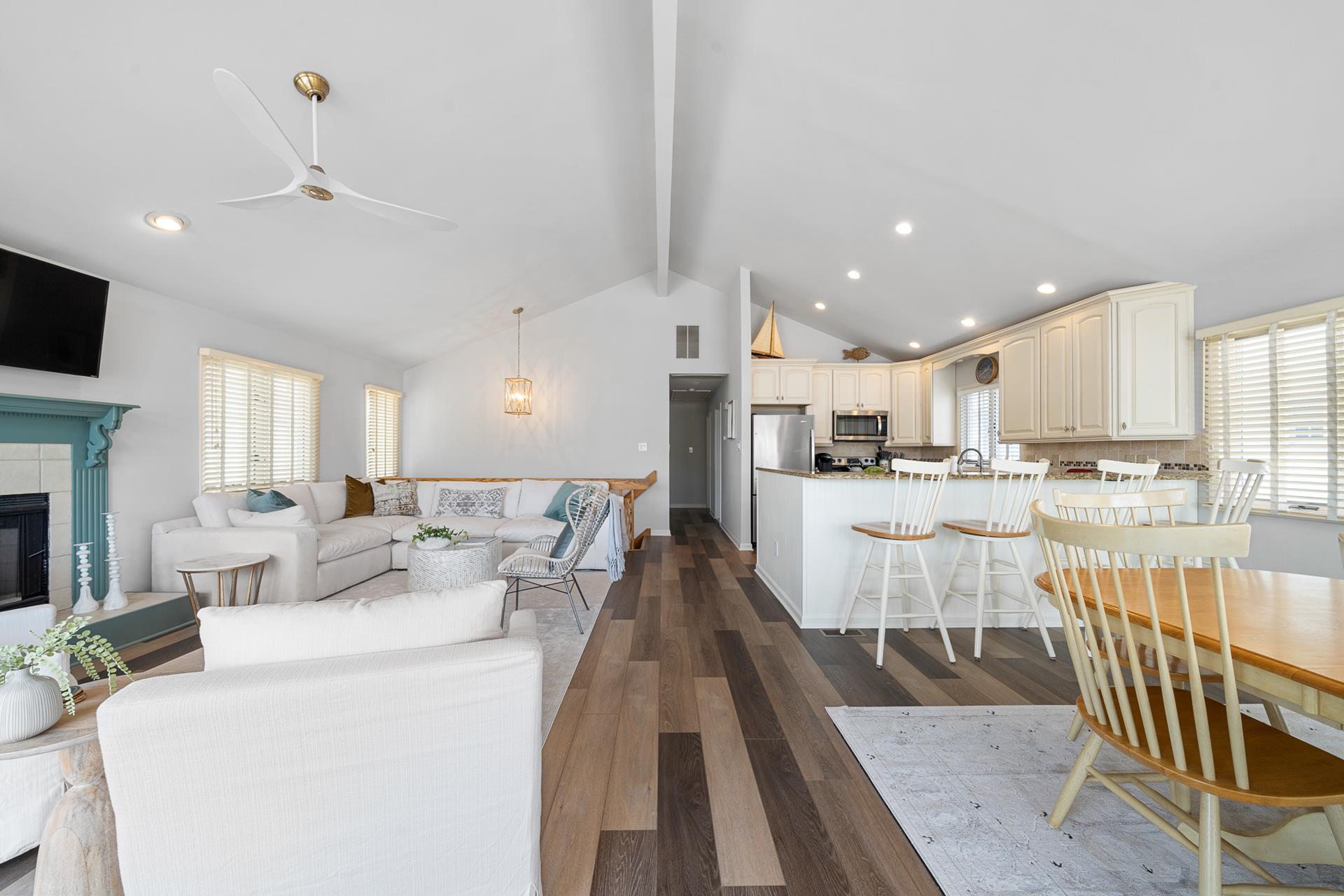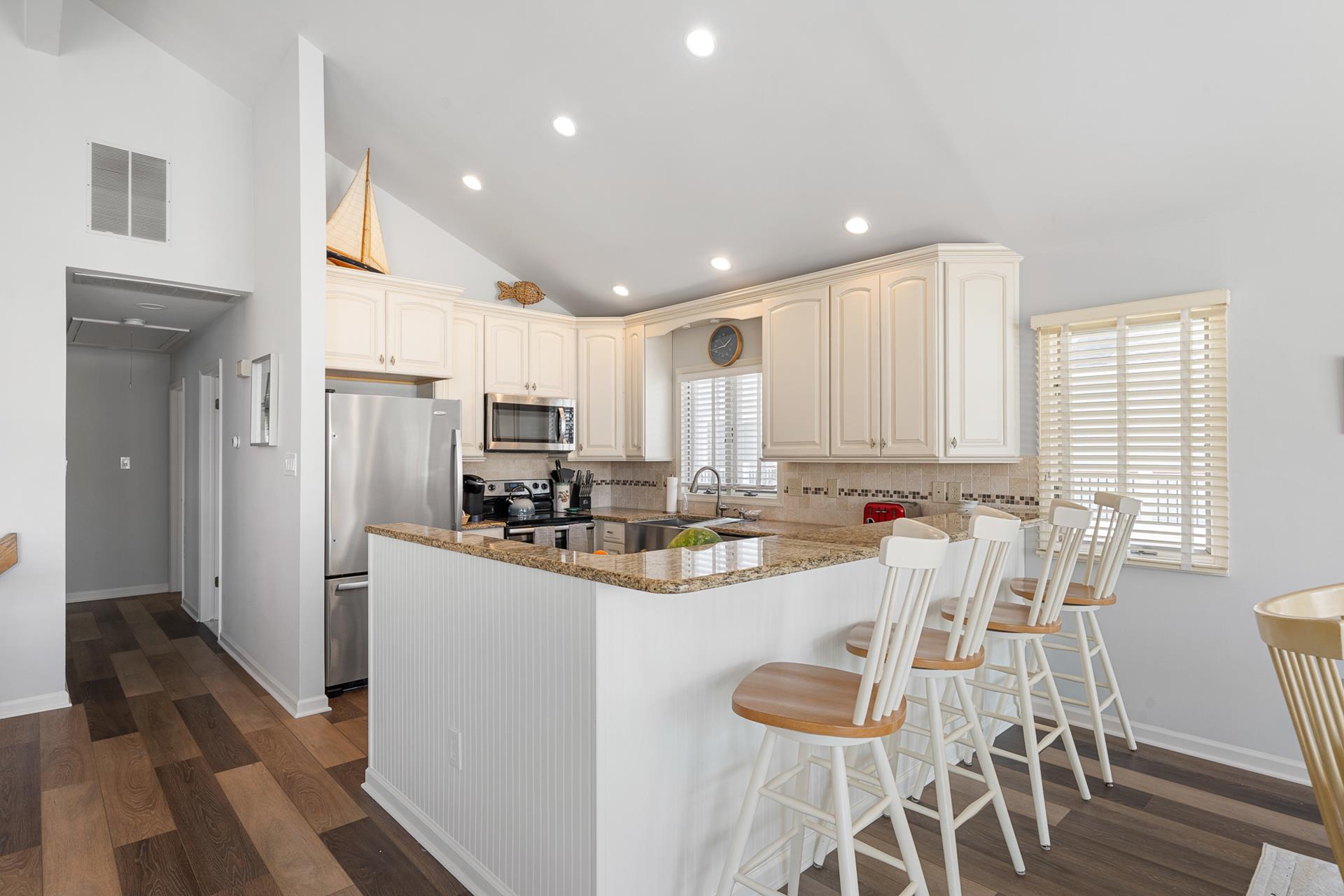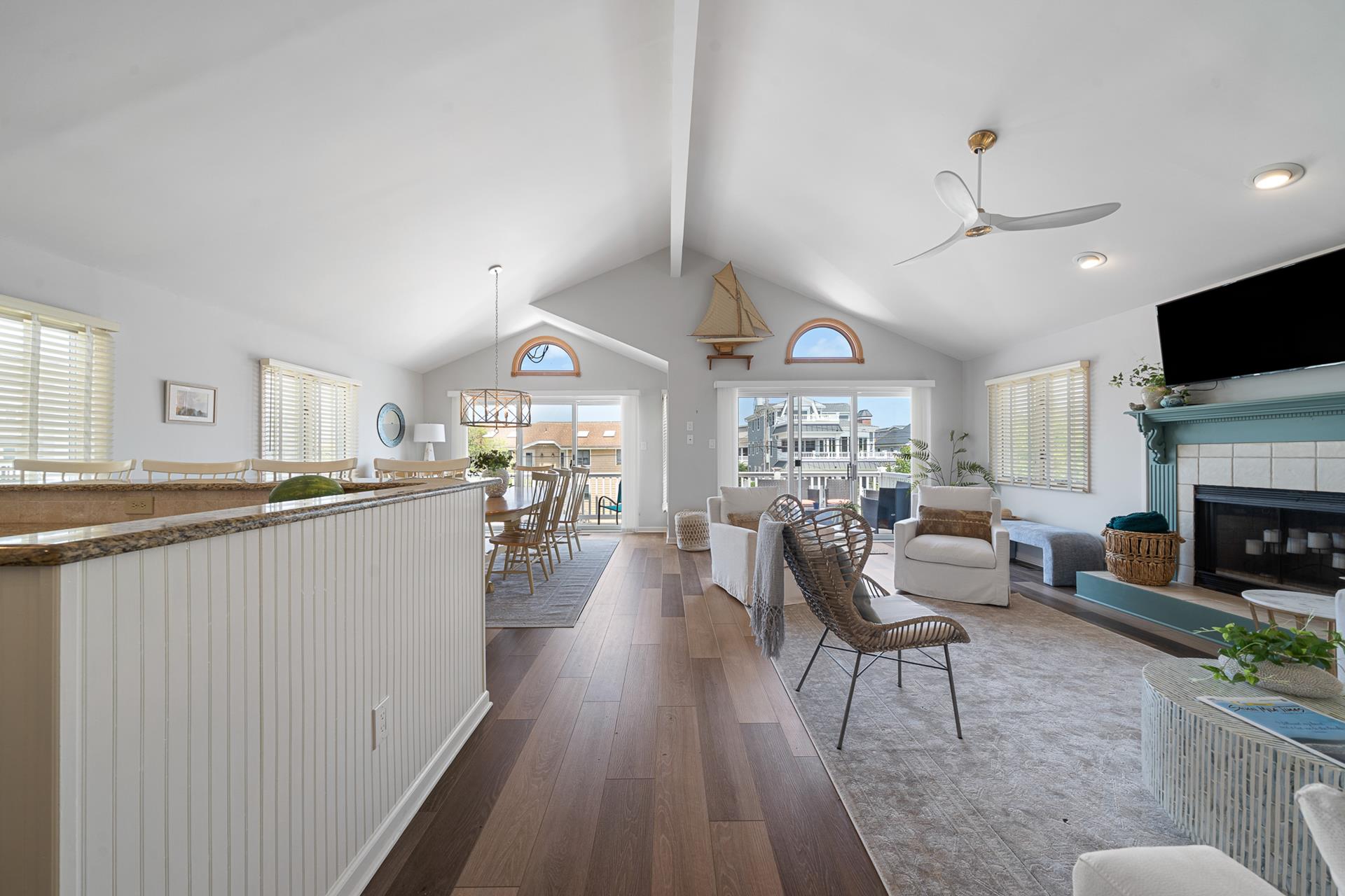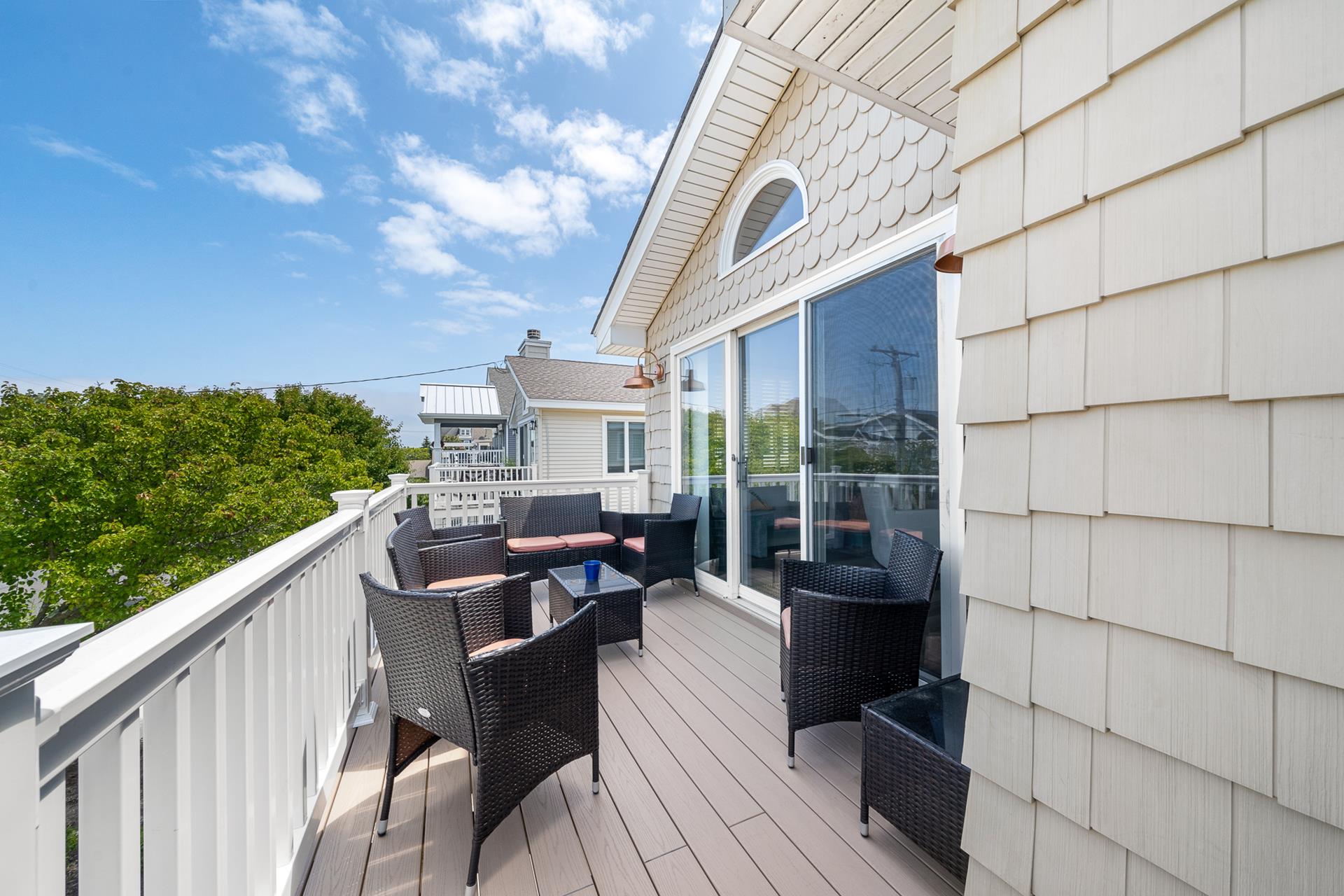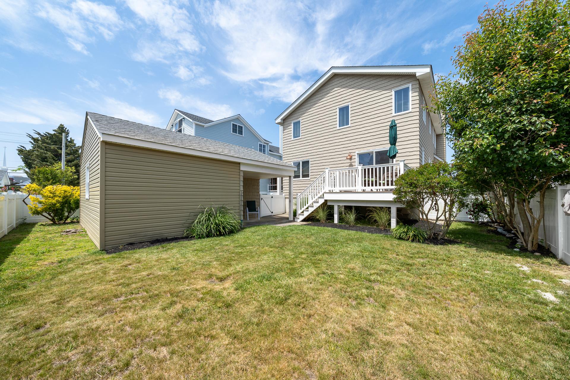 | LOCATED JUST UNDER 2 BLOCKS FROM THE BEACH & AROUND THE CORNER FROM TOWN! There is only one street to cross on the way to the beach, and you can leave the car parked and walk to just about everything! This is the ideal location to enjoy your summer vacation! The location is also convenient to the Public Dock located at 33rd & the bay, where you can fish, crab and enjoy the sunset! There are Public Recreation areas located at: 30th Street (next to the Avalon Public School) , 39th Street (including a playground), and at The Surfside Park (30th & the beach); all just a short walk away! In addition, Avalon's award-winning library is located on 32nd Street. The boardwalk spans along the beachfront from 32nd Street to 21st Street, and it s the perfect setting for a relaxing walk or invigorating run! This home offers the popular "Upside Down Style" floor plan, which features a wide open Living/Kitchen/Dining area with a soaring cathedral ceiling above! Sliding doors provide convenient access from the Great Room to a large deck that spans the width of the property. The updated Kitchen features granite counters complimented with a tile backsplash, stainless steel appliances and custom cabinetry. The Master Suite is in the rear of the 2nd Floor and features a King size bed and a private bathroom with granite countertops. The second bedroom offers a Queen bed and semi-private access to the full hall bathroom; this bathroom offers a shower and granite counters. The First Floor has a nice size rear-facing Family Room with attached Powder Room. This is the perfect room to allow the kids & adults to enjoy their "own space". The Family Room opens to a southern exposed deck and then down to a fenced rear yard with additional seating under the porch of the garage area. Ideal for those summertime BBQs with family & friends! The entire family can spread out in the additional 3 bedrooms on the First Floor. 1st bedroom has 4 twin beds, 2nd bedroom has a king bed and the 3rd bedroom has a King bed & has private access to the hall bath with tub/shower. All the bedrooms have hardwood floor and area rugs for comfort. You may use the detached garage for storage. Truly a great property to enjoy with family & friends! |