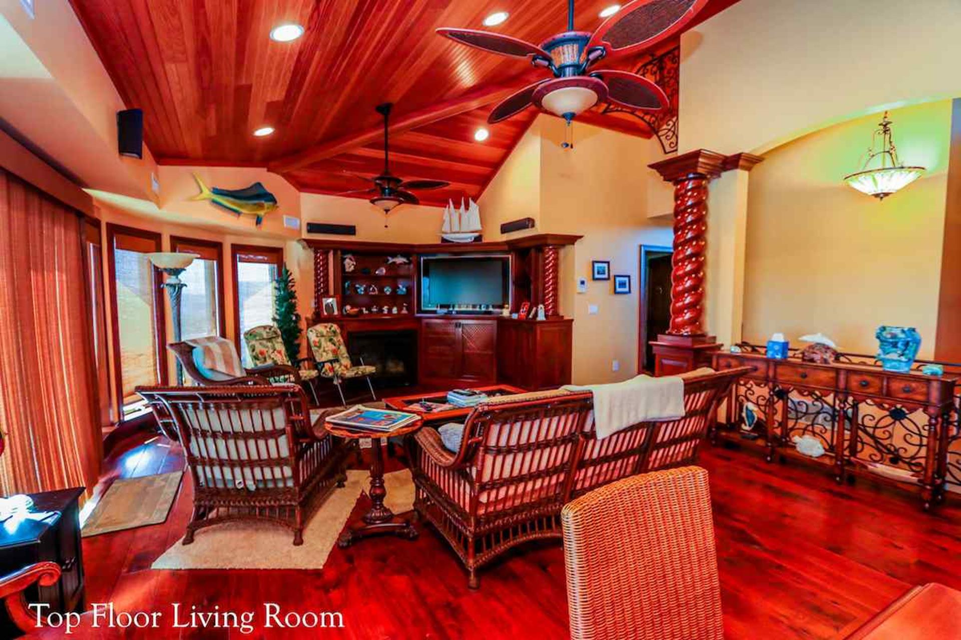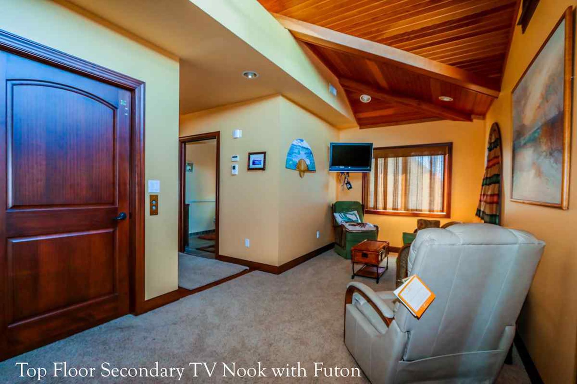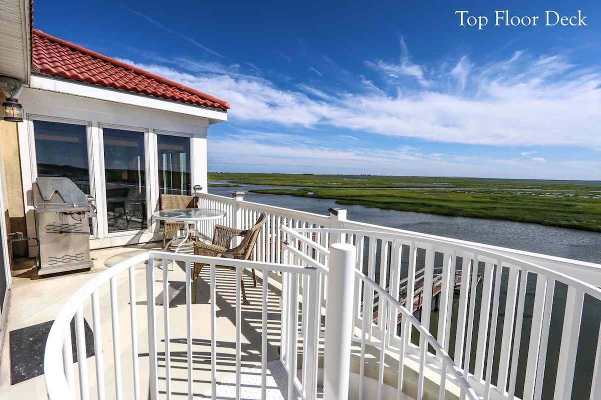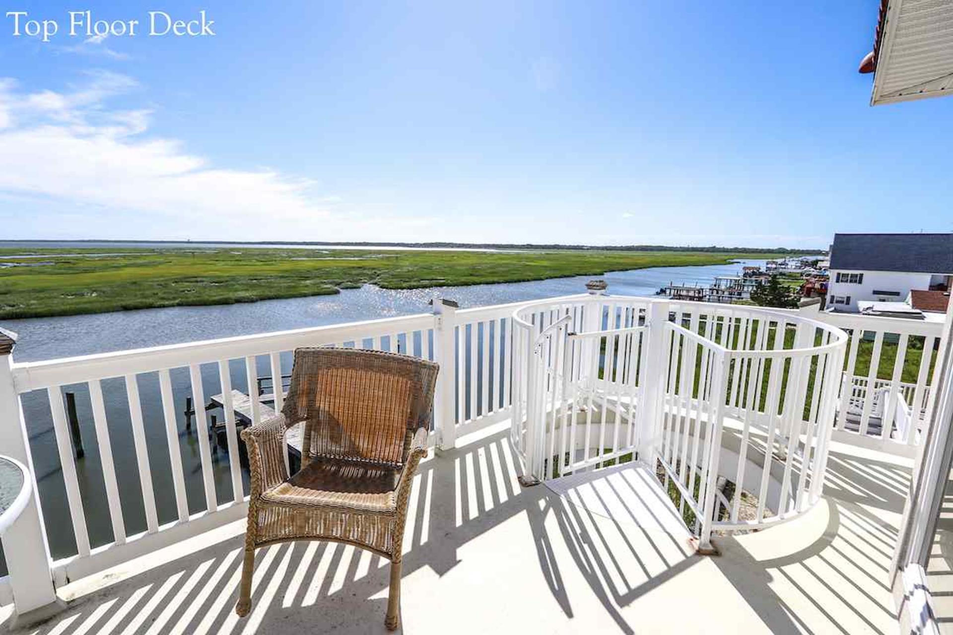 The main living area includes a large flat-screen TV with streaming capabilities, plus a separate, cozy TV nook with a sofa bed for additional guests. A full bathroom is also located on this level. Step outside to the bayfront deck, complete with table and chairs for al fresco dining, or enjoy either street-side balcony, accessible from the top or second floor.