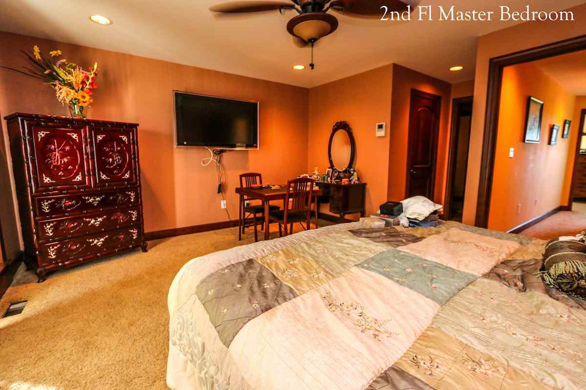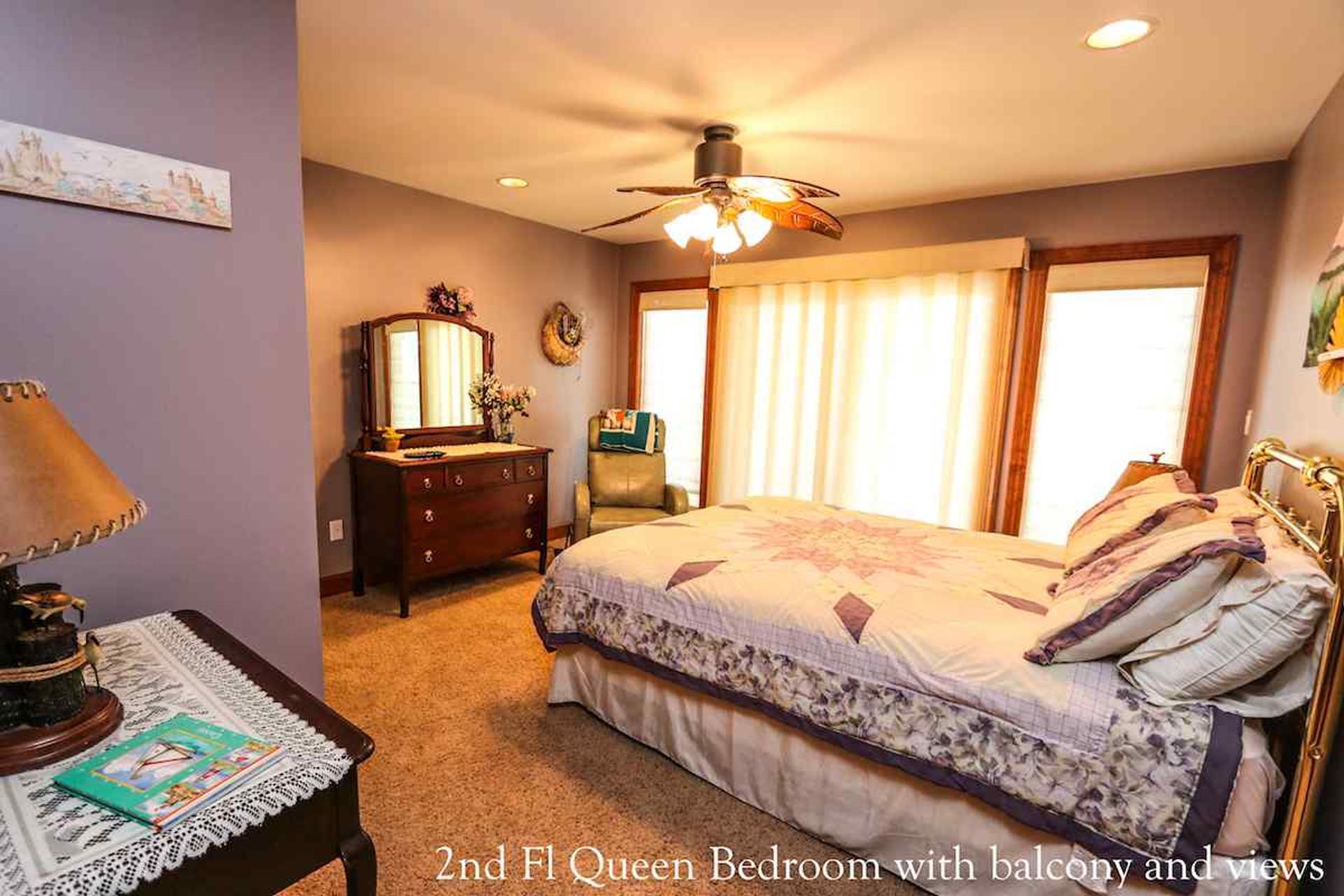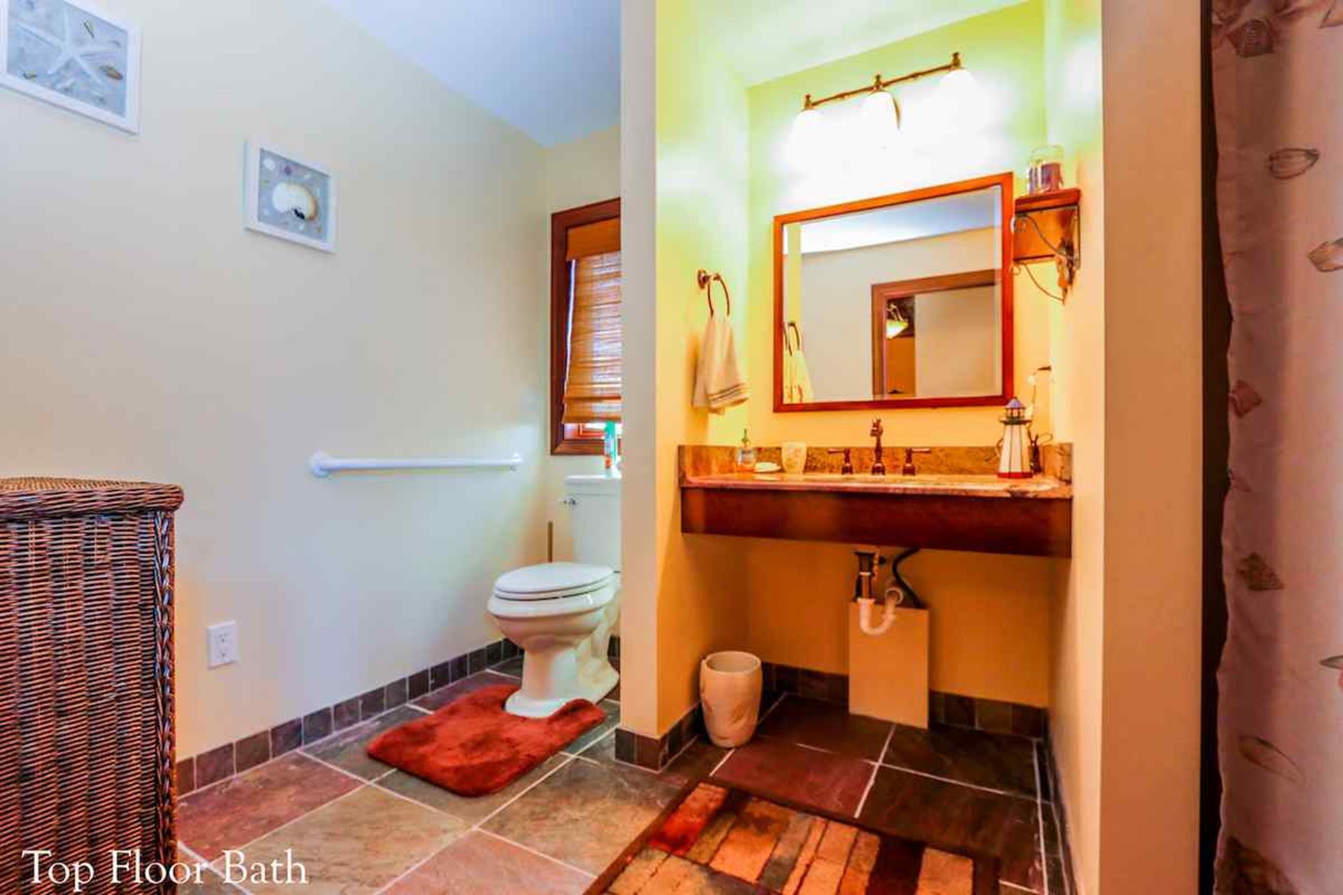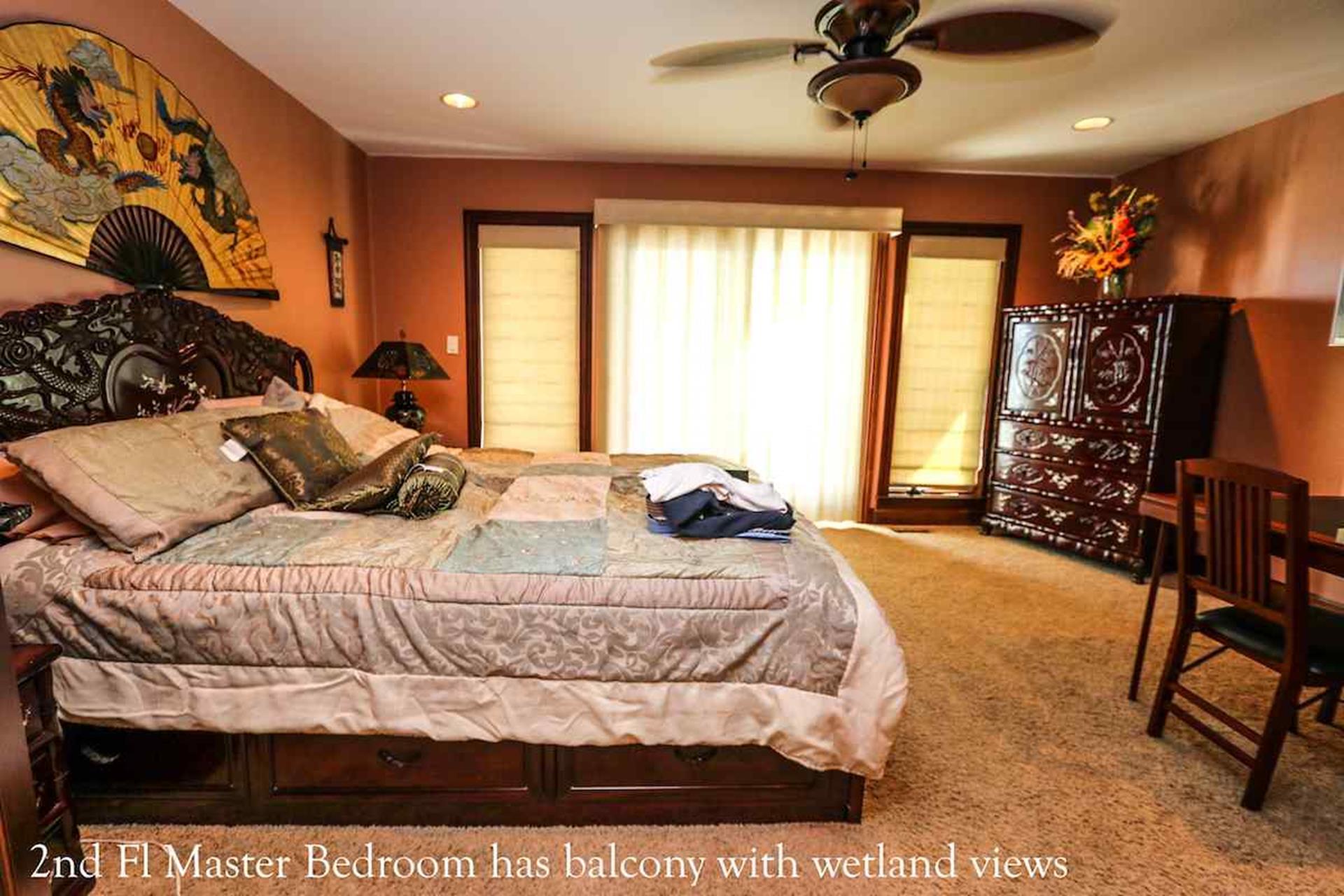 The second floor offers a well-appointed layout, including a queen bedroom with bayfront deck access, a king master suite with its own bayside deck, and two additional bedrooms each with a double bed. A hall bathroom serves the queen and double bedrooms.