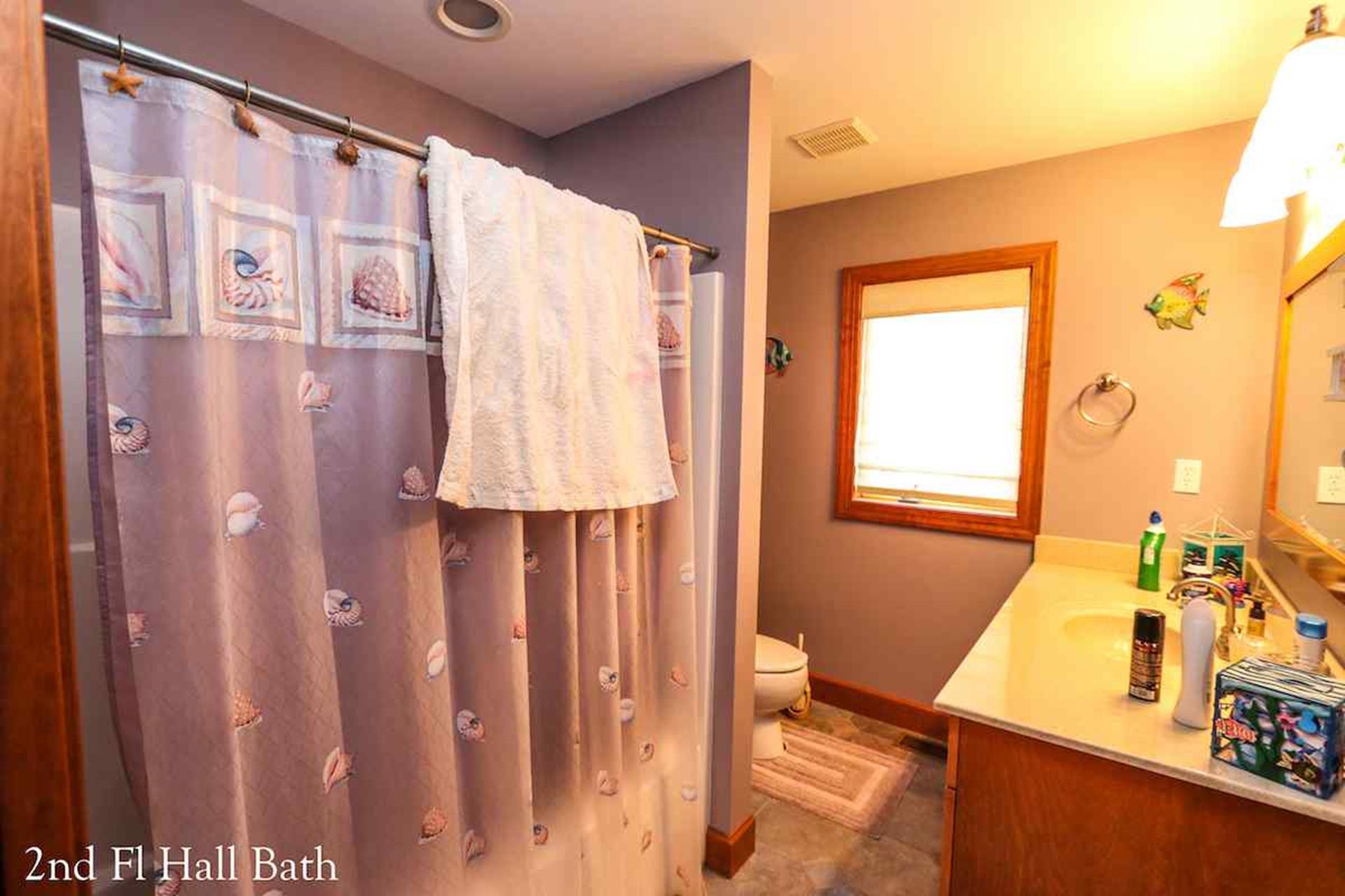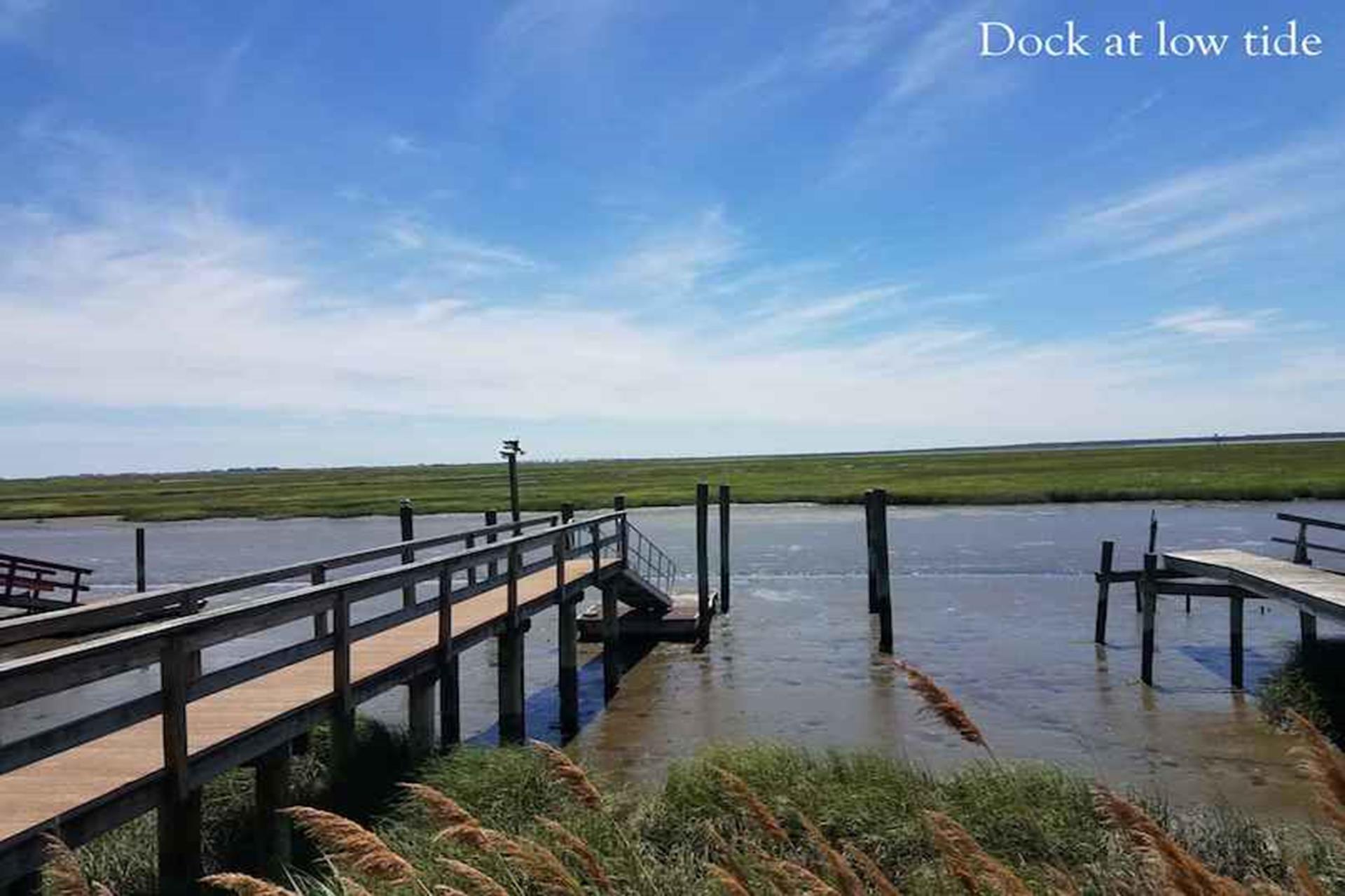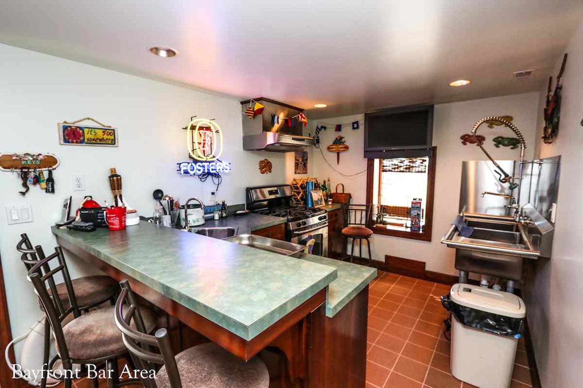 Down by the dock, guests can try their hand at crabbing between tides—a classic Shore experience. The first floor features a fun bar area, along with a full bathroom conveniently located behind the garage.